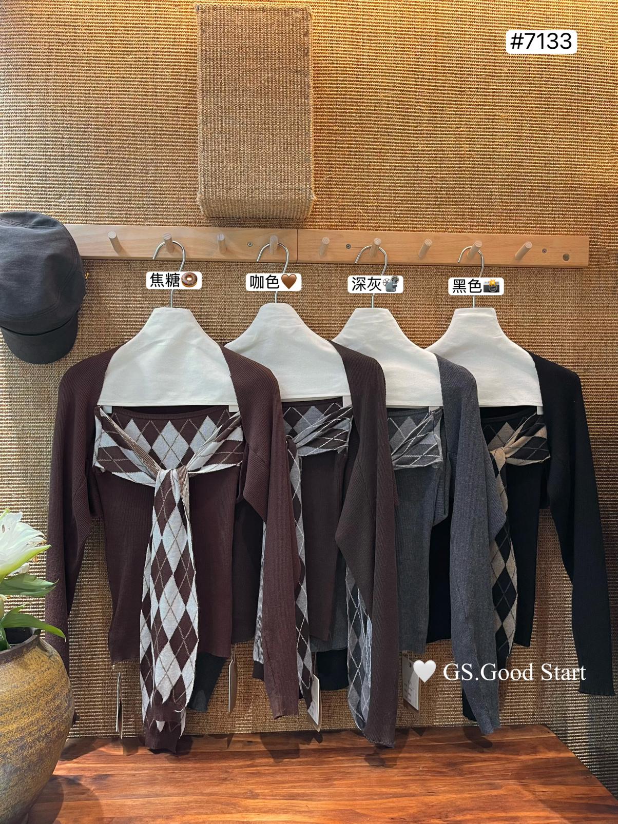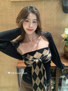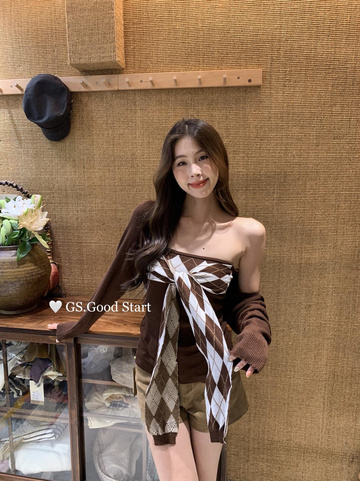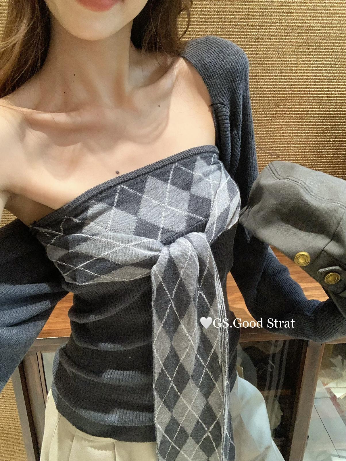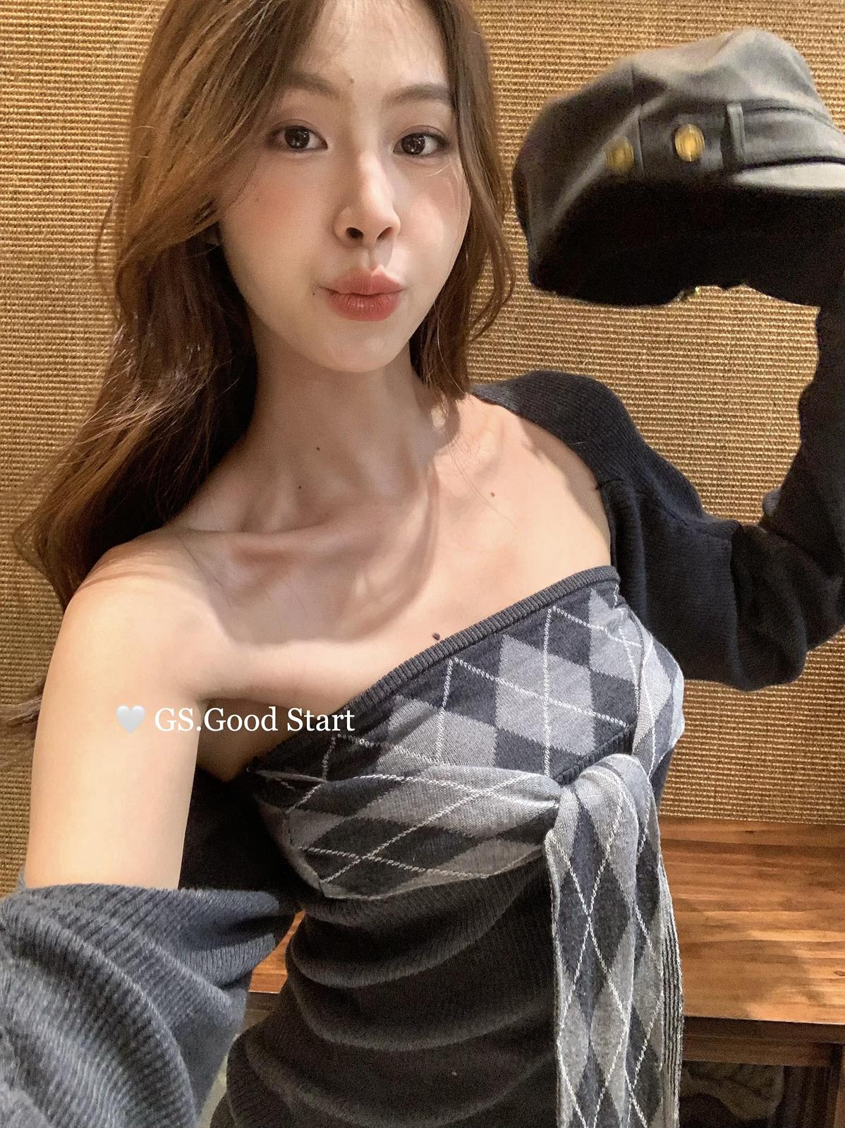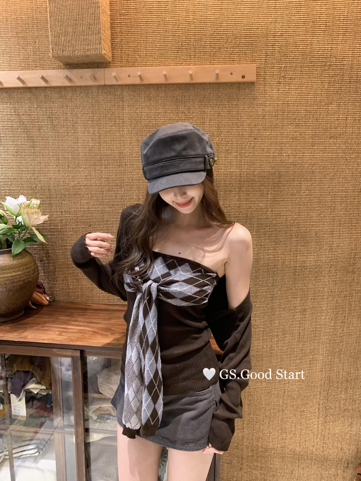 【C7198】被問爆了!必入*韓系ins時髦純欲綁帶格紋抹胸+針織開衫套裝(含4%羊毛)