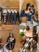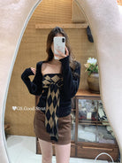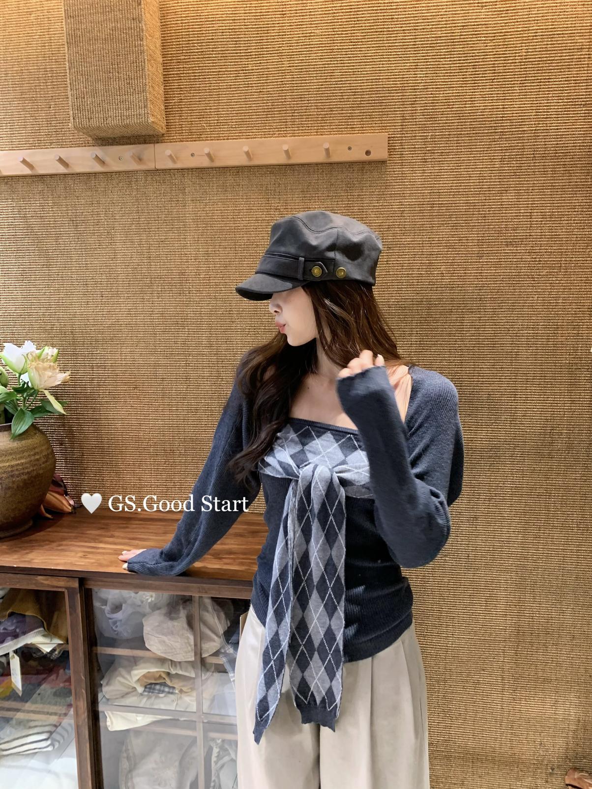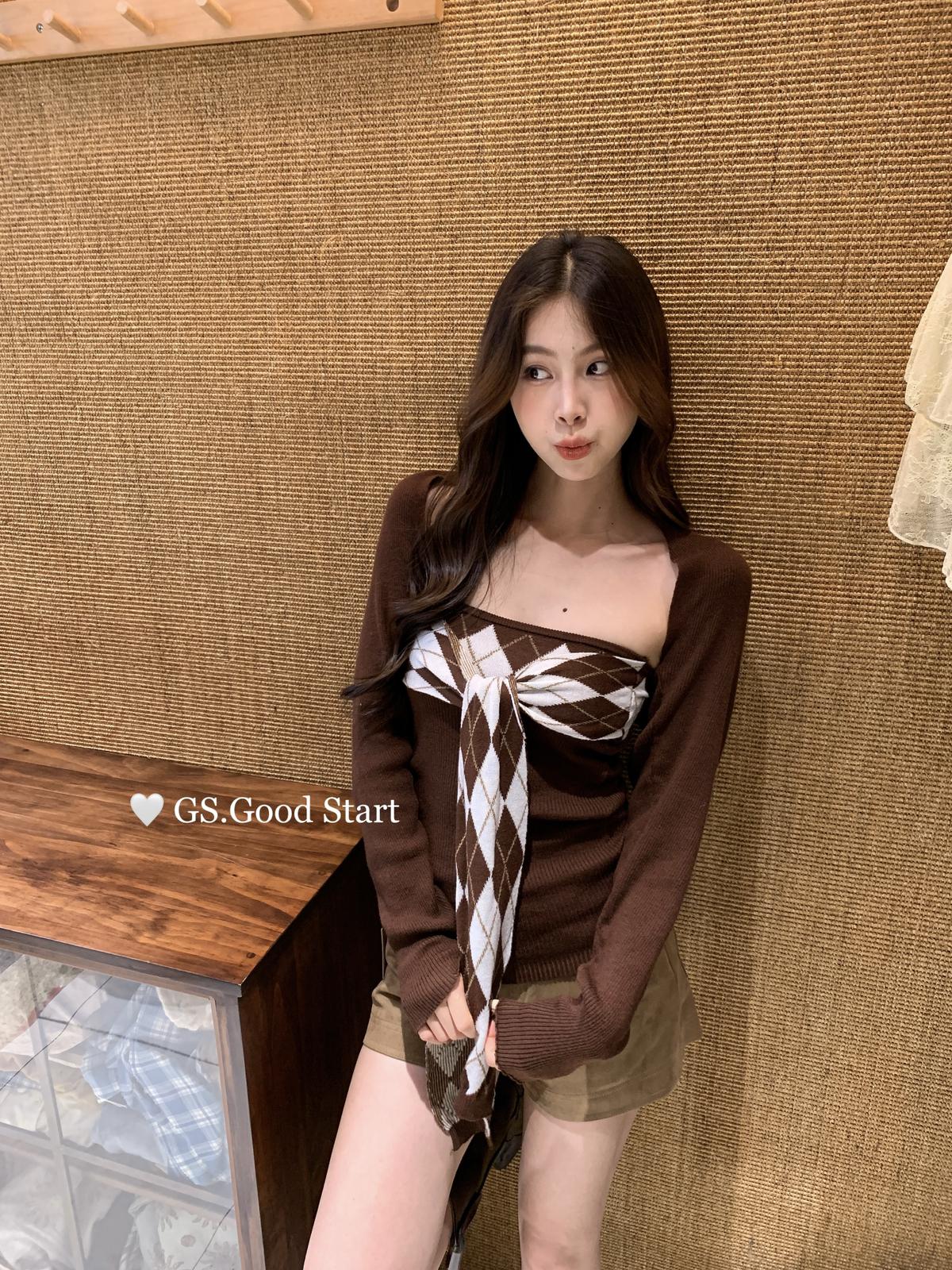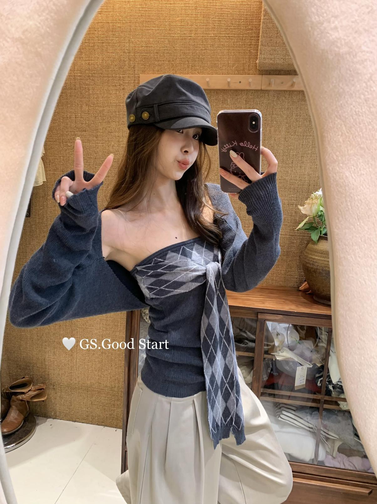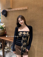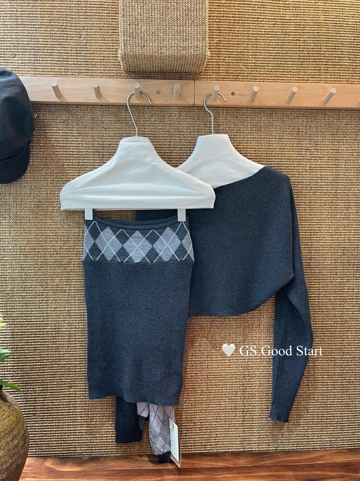 【C7198】被問爆了!必入*韓系ins時髦純欲綁帶格紋抹胸+針織開衫套裝(含4%羊毛)