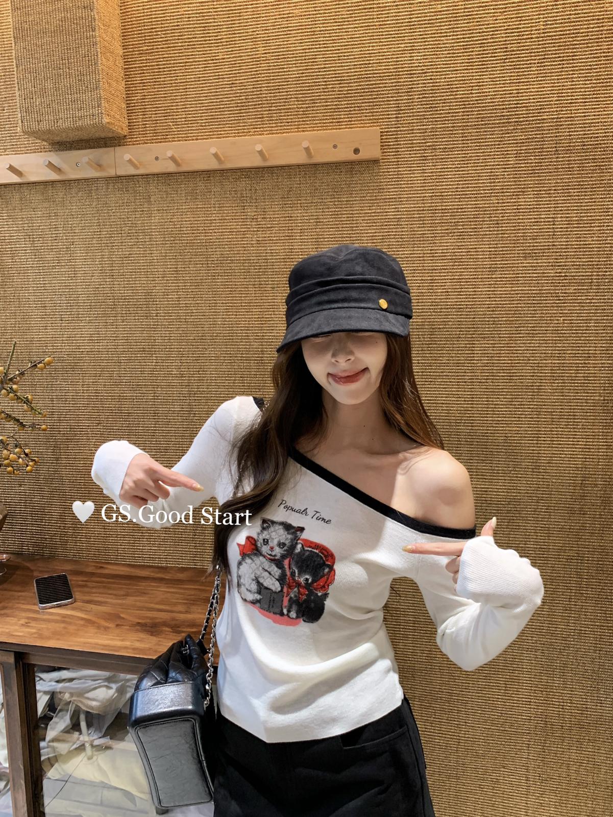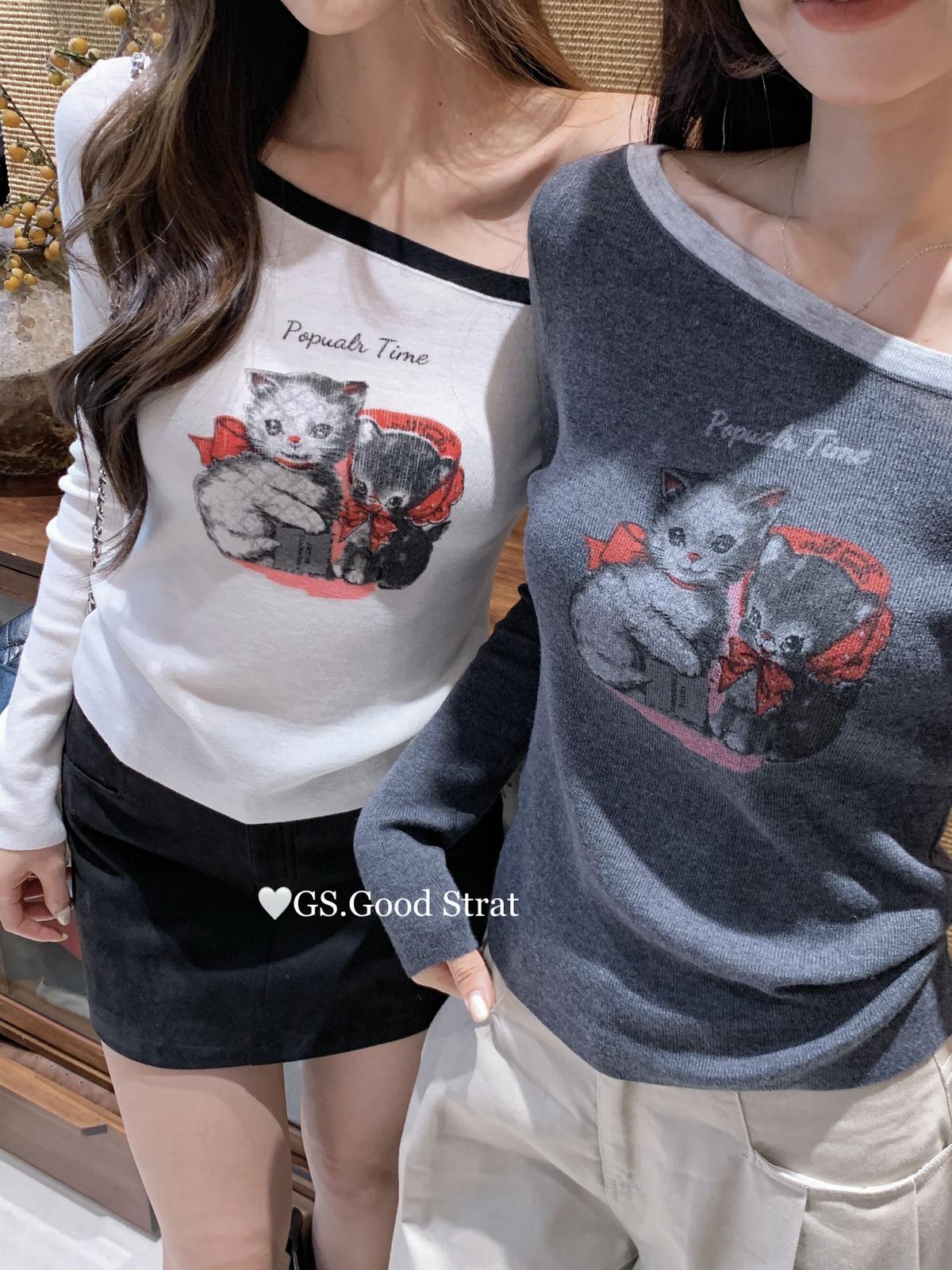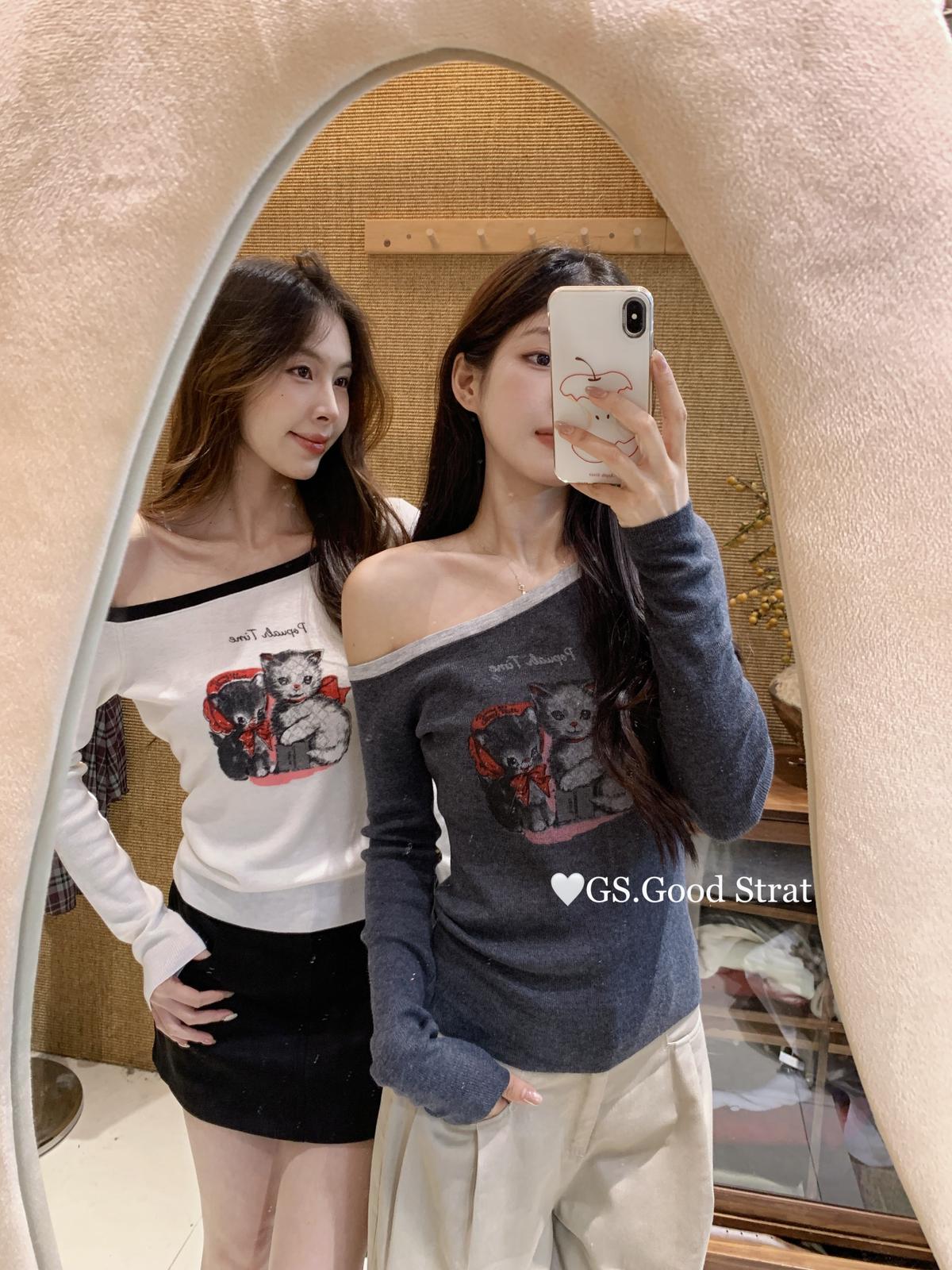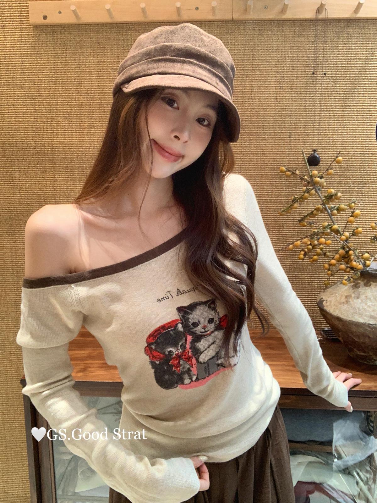 3. 【C7205】我們家的小貓~發財款!秋季純欲辣妹斜肩可愛印花針織小衫(含4%羊毛)