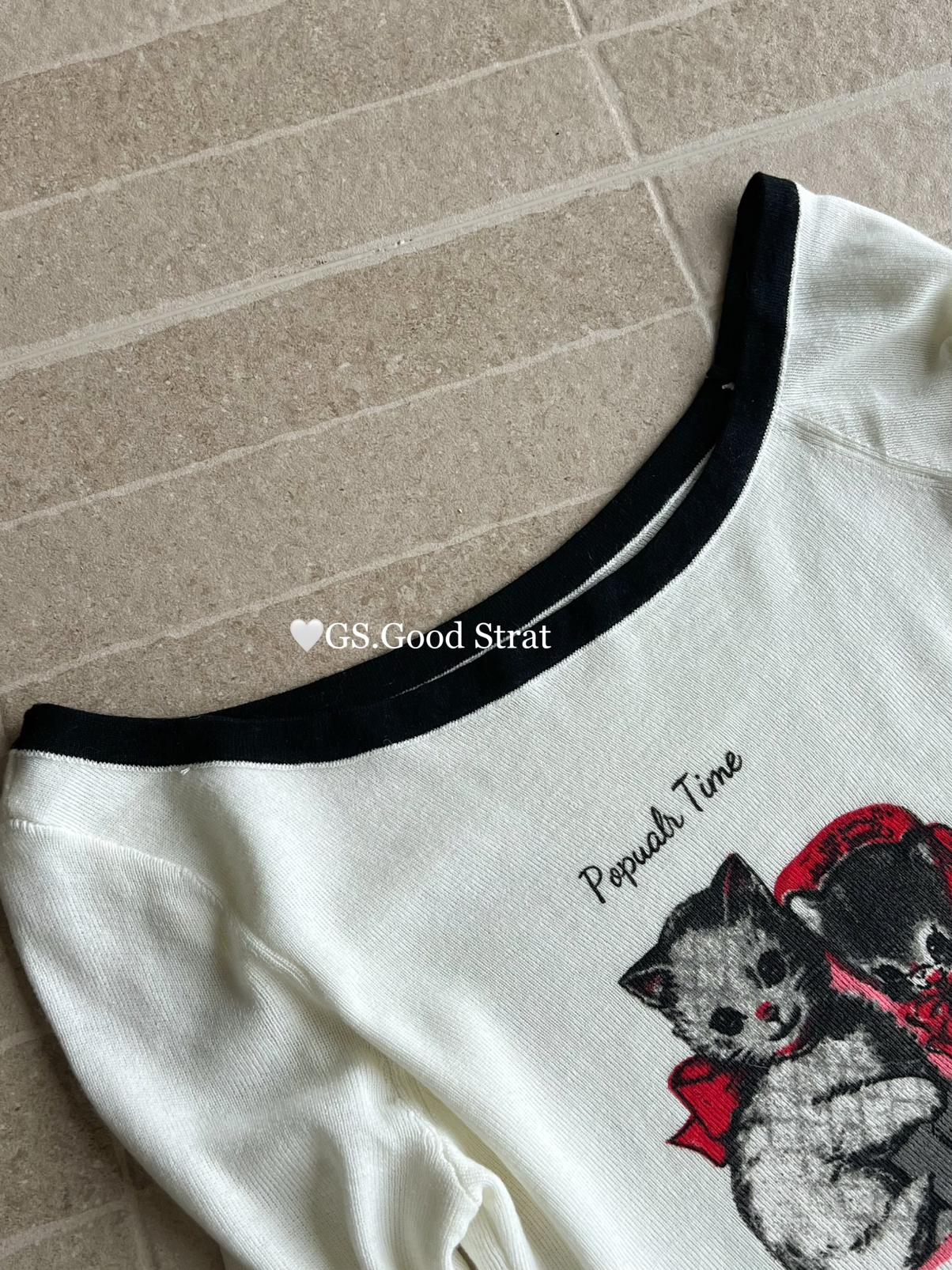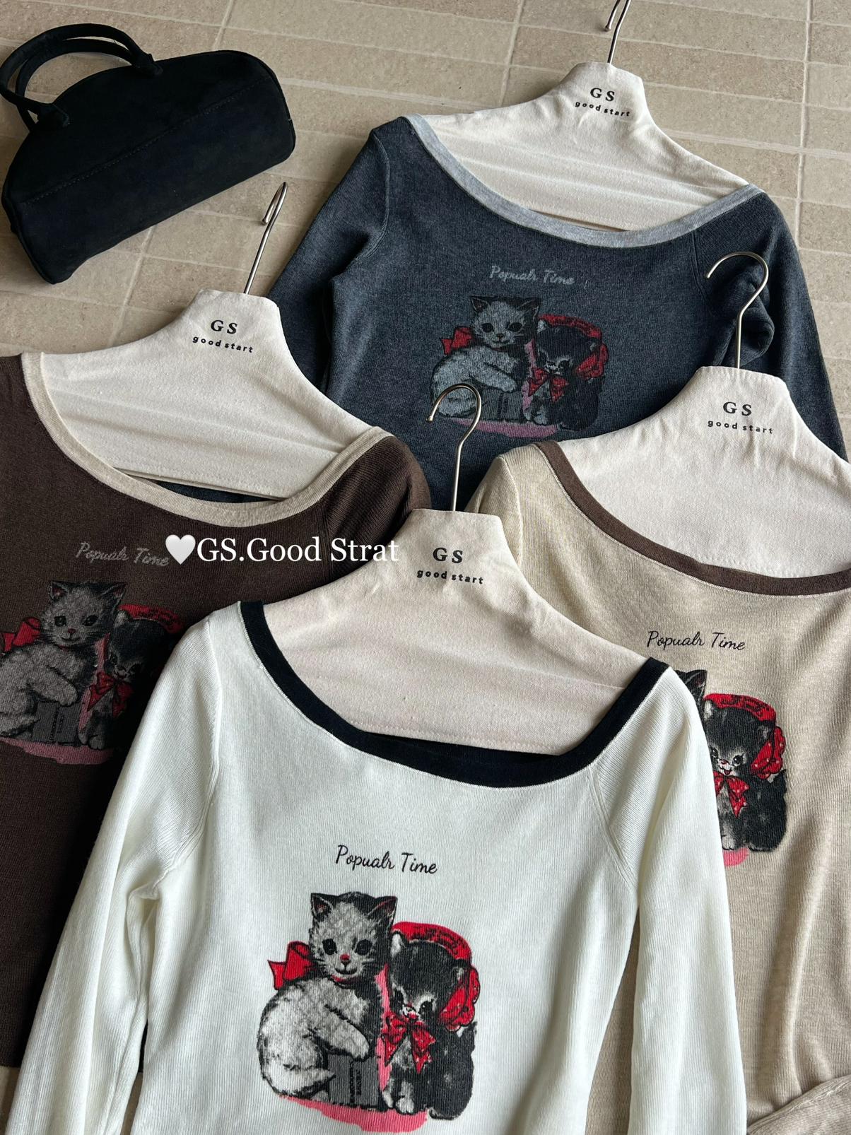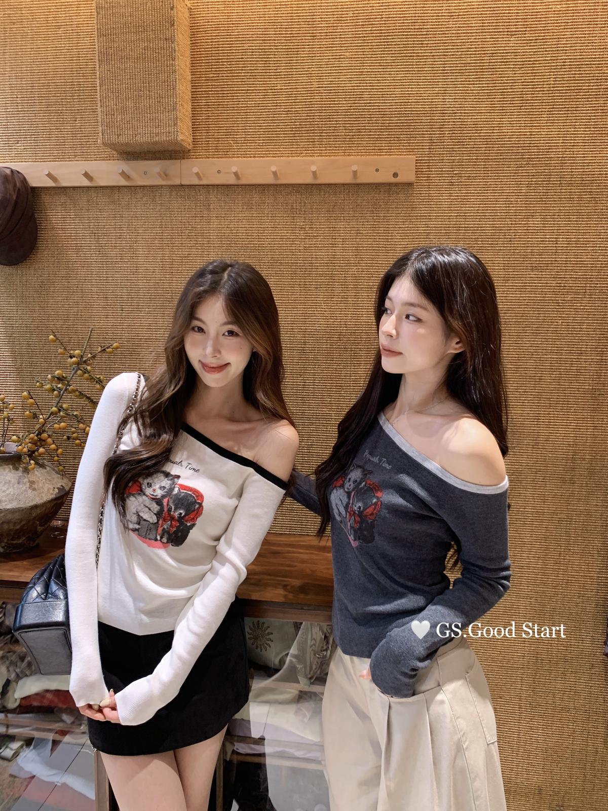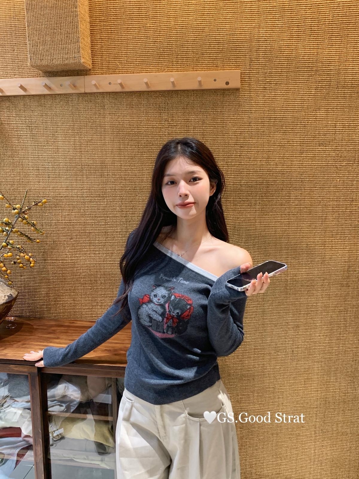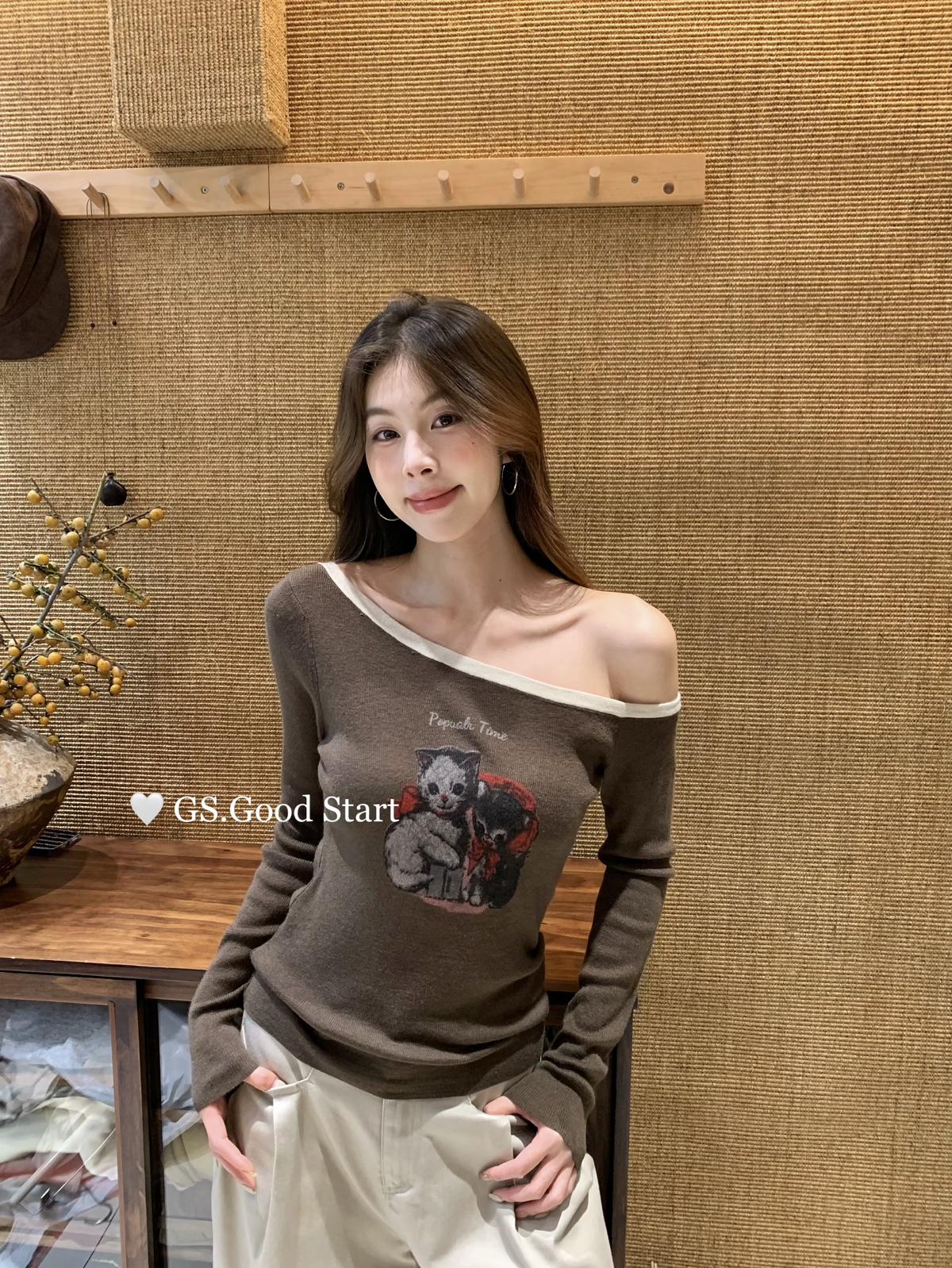 3. 【C7205】我們家的小貓~發財款!秋季純欲辣妹斜肩可愛印花針織小衫(含4%羊毛)
