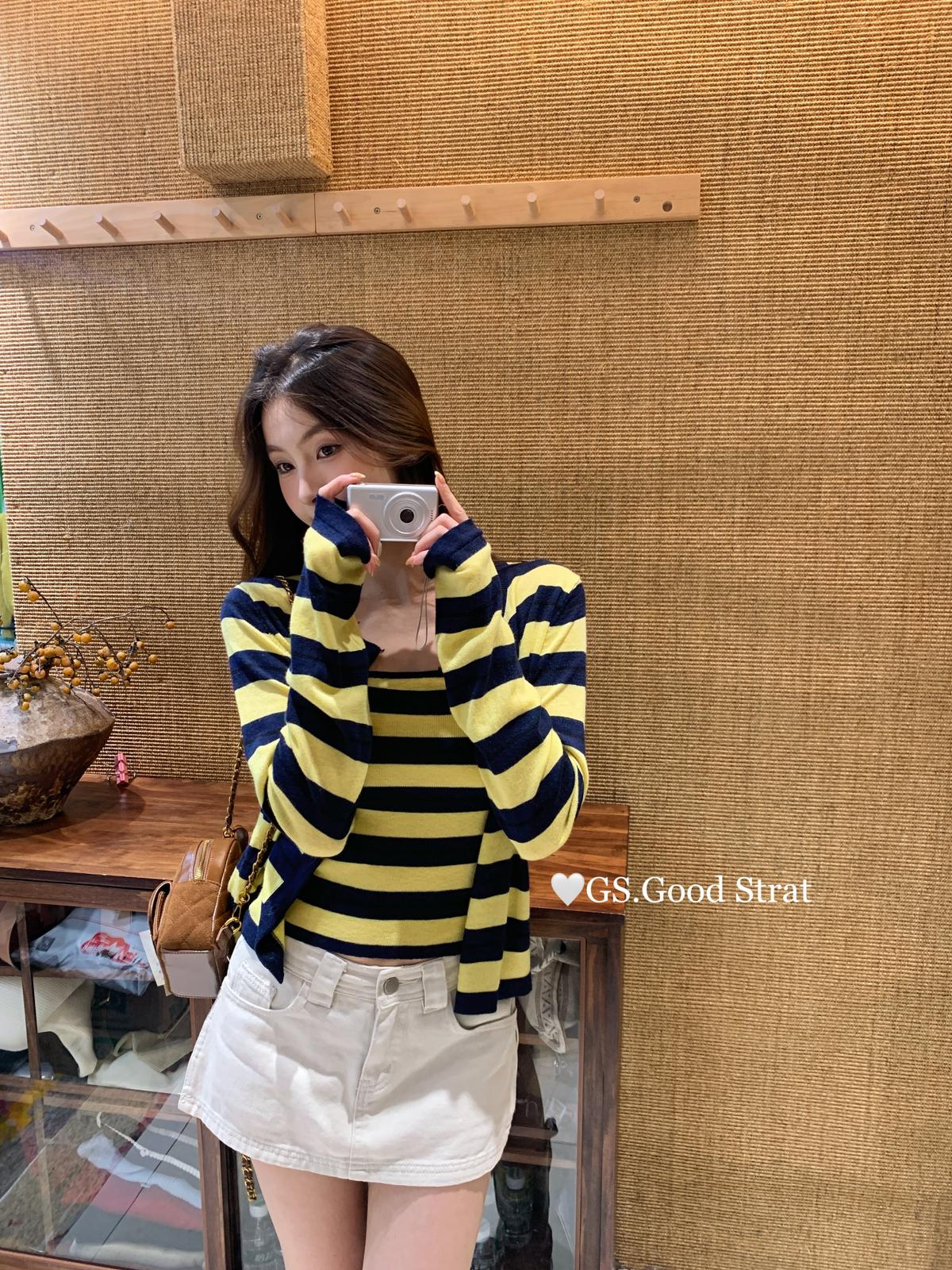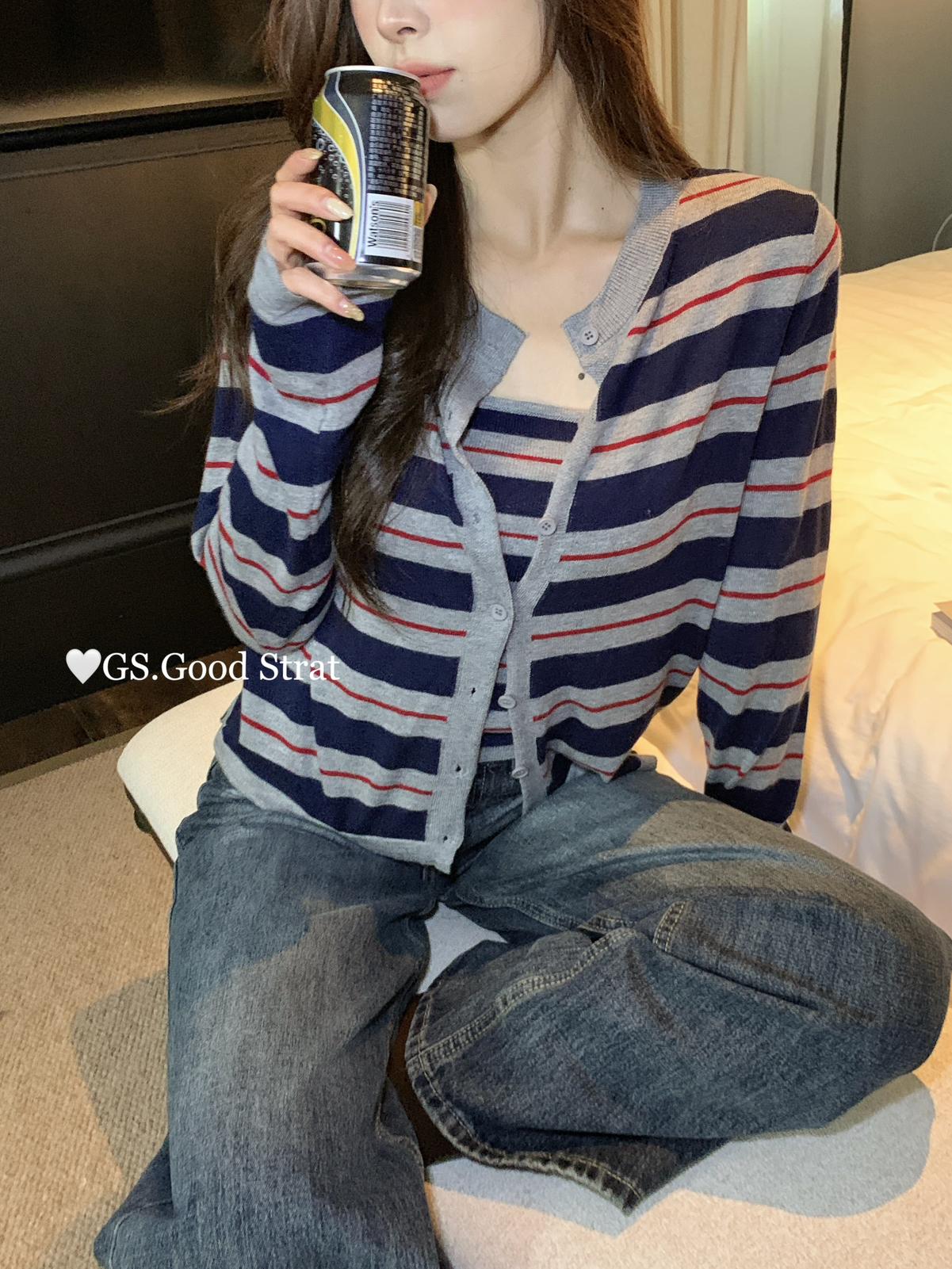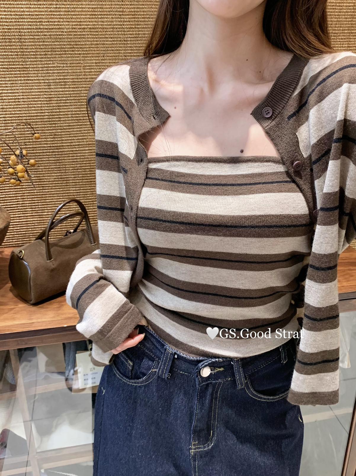 【C7208】爆火miu繫條紋!必拿!秋冬時髦撞色條紋針織開衫+抹胸套裝