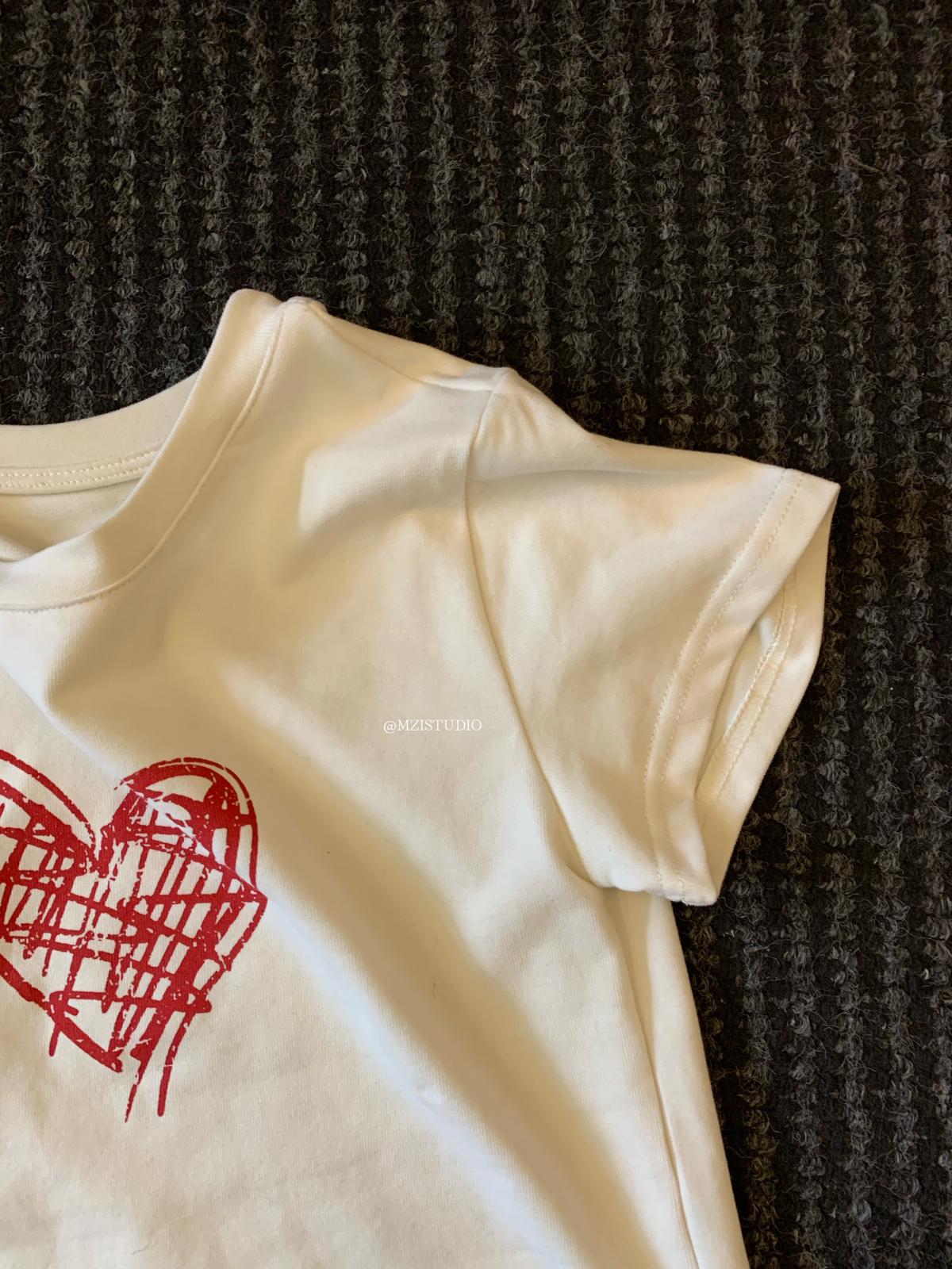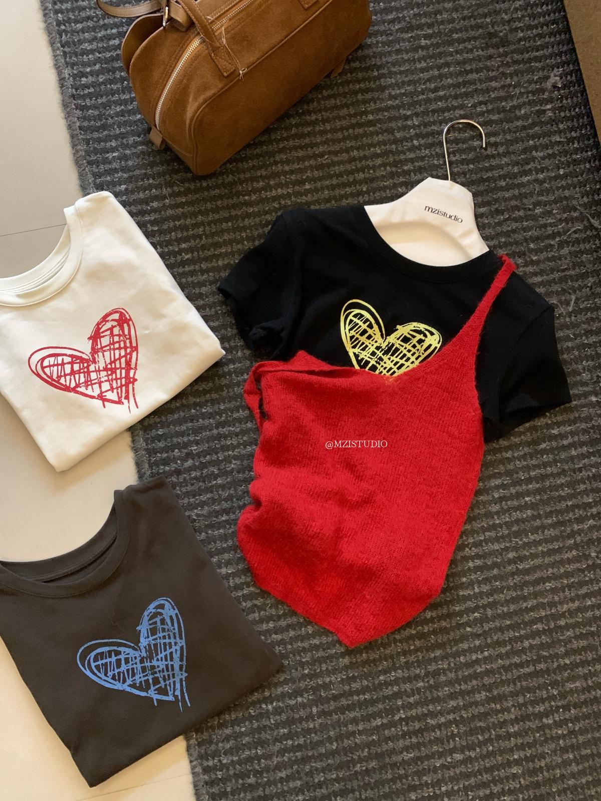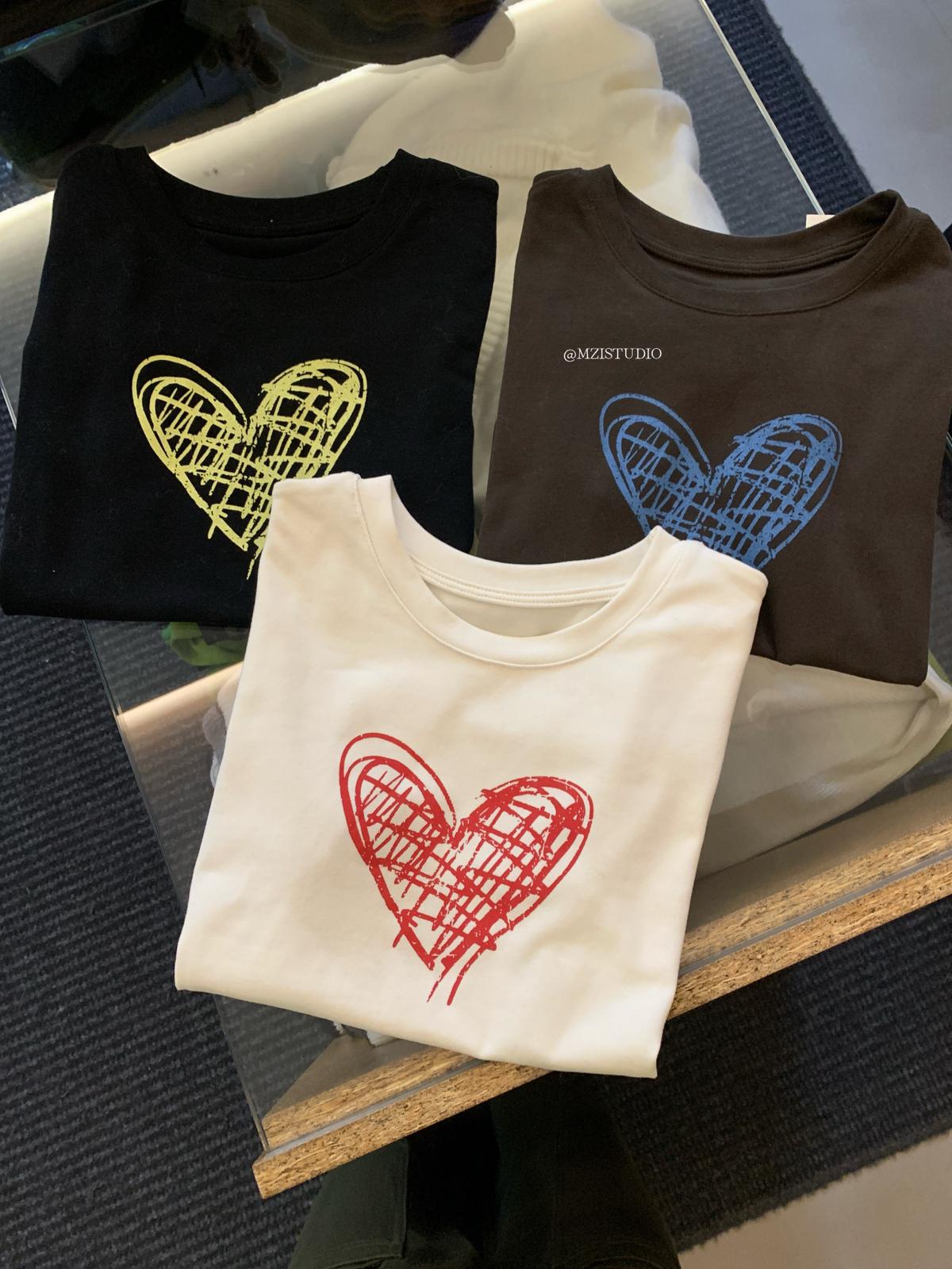 3. 【C7216】韓感甜美愛心簡約質感線條桃心印花正肩圓領套頭短袖T恤