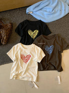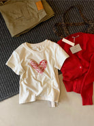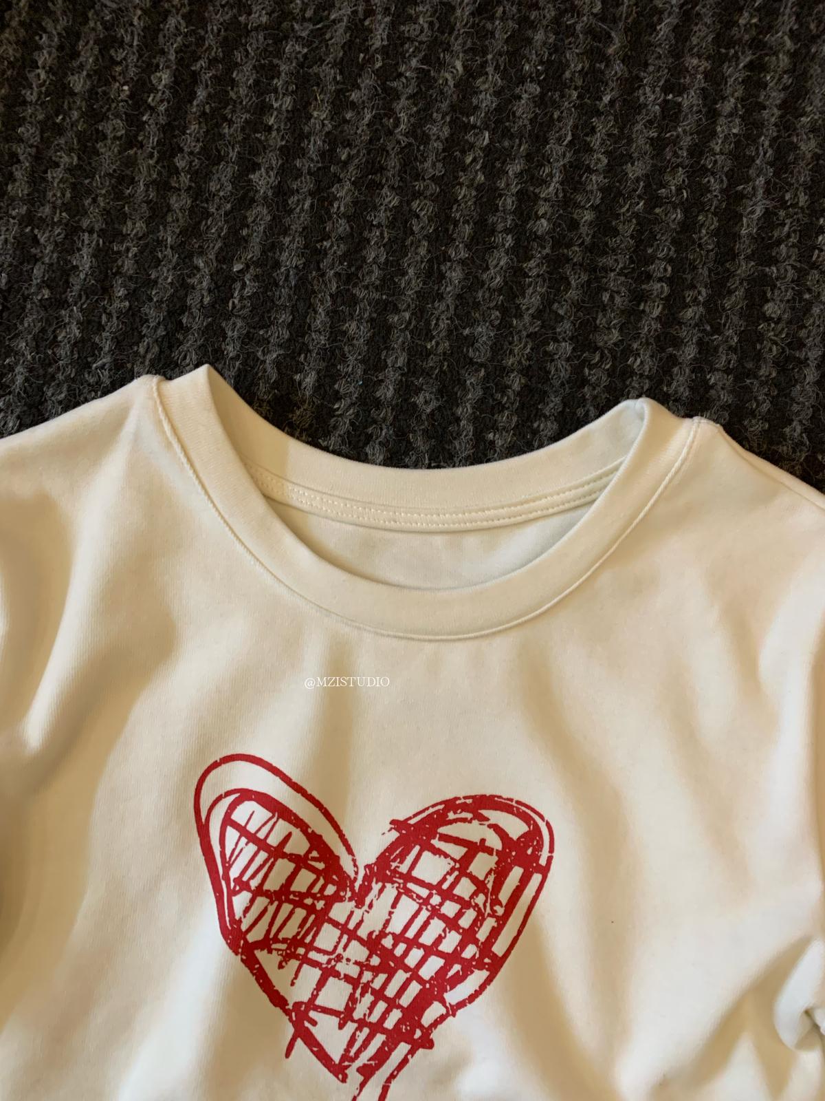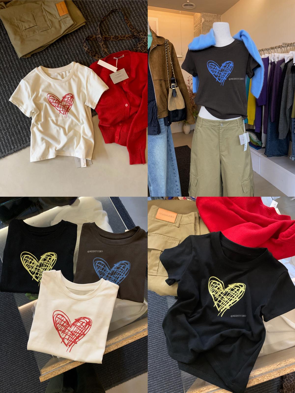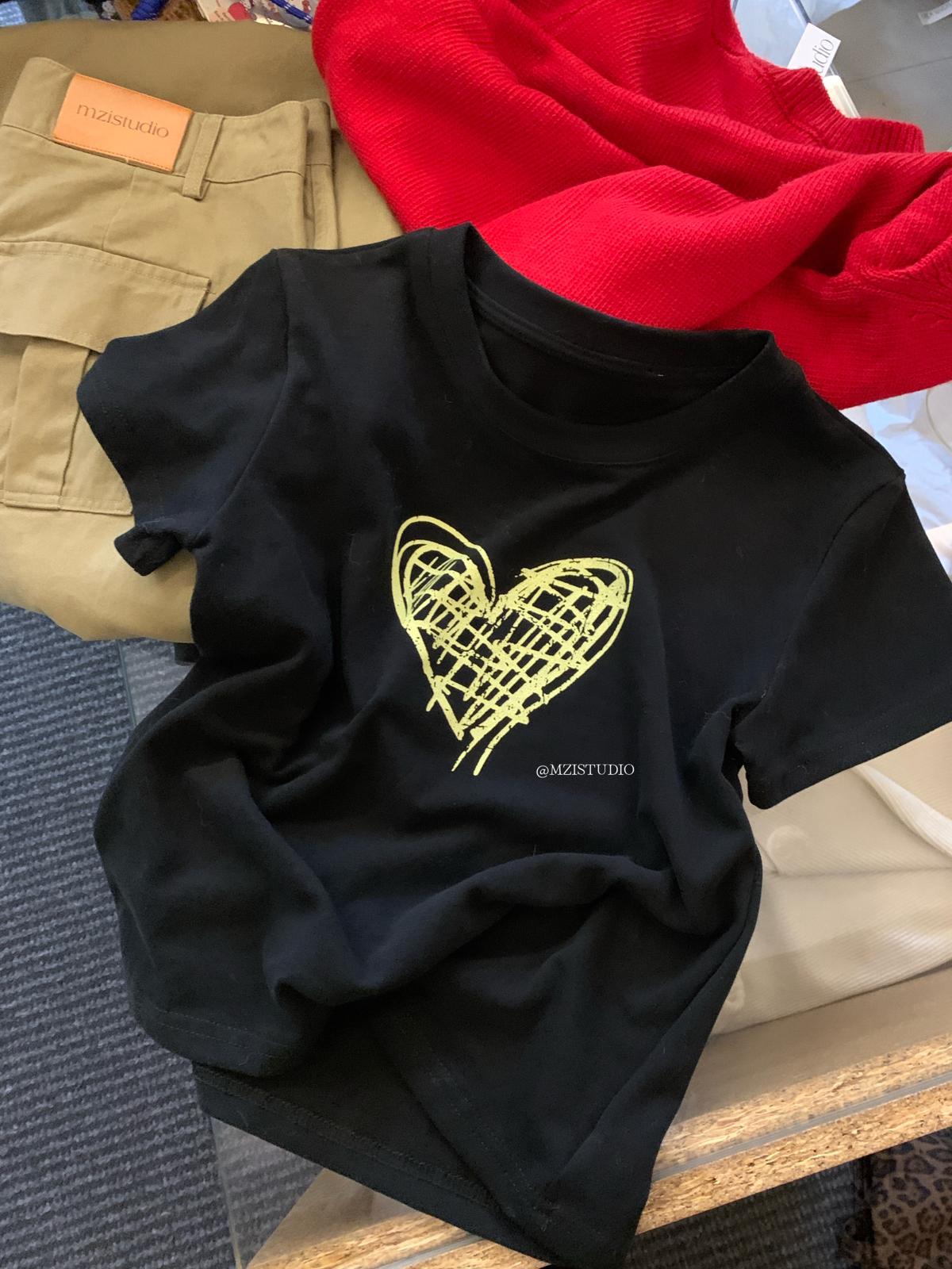 3. 【C7216】韓感甜美愛心簡約質感線條桃心印花正肩圓領套頭短袖T恤