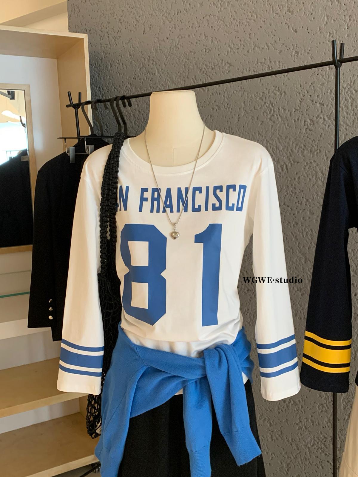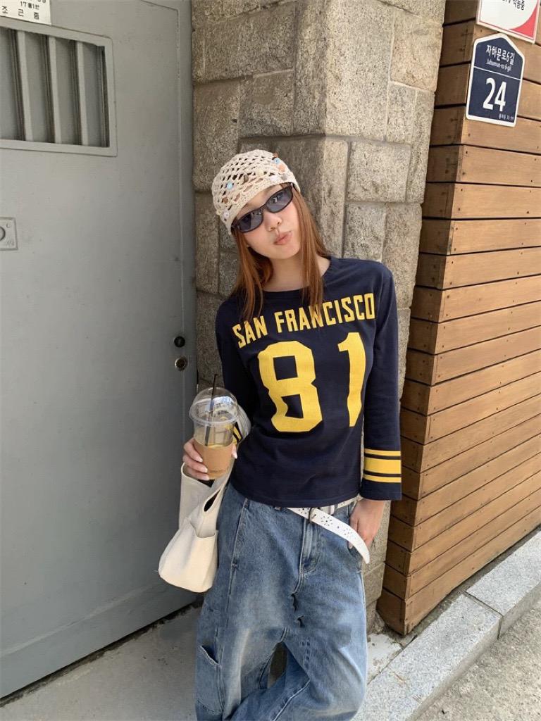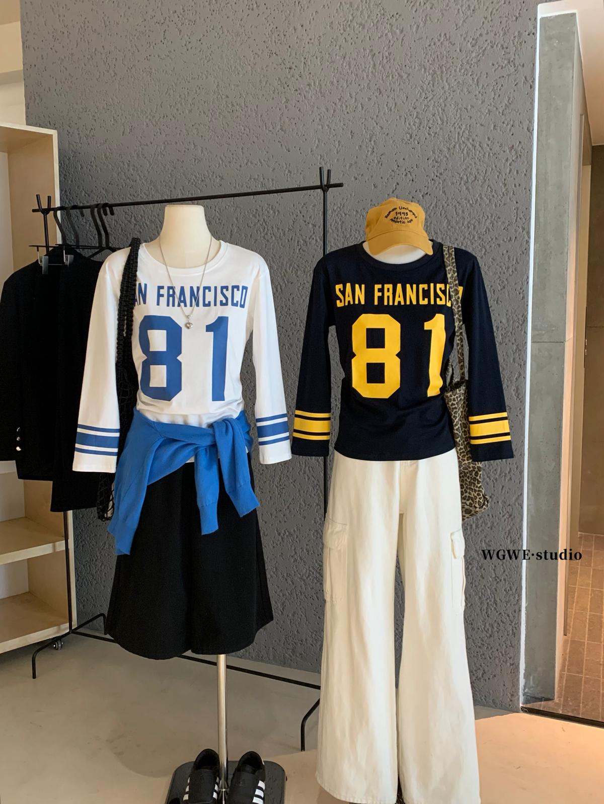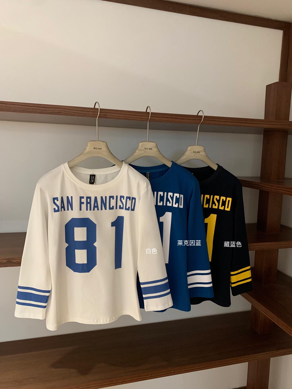 3. 【C7241】美式復古簡約時尚休閒藏青黃撞色印花長袖T恤