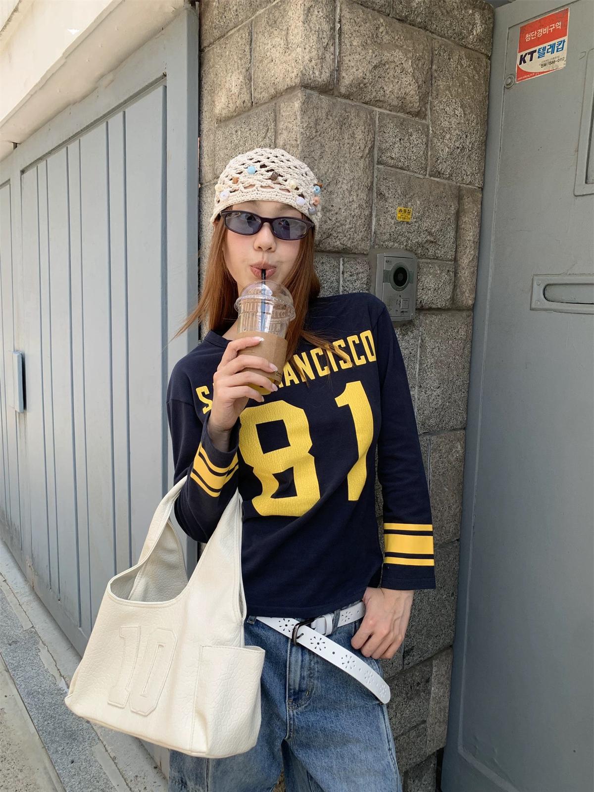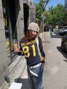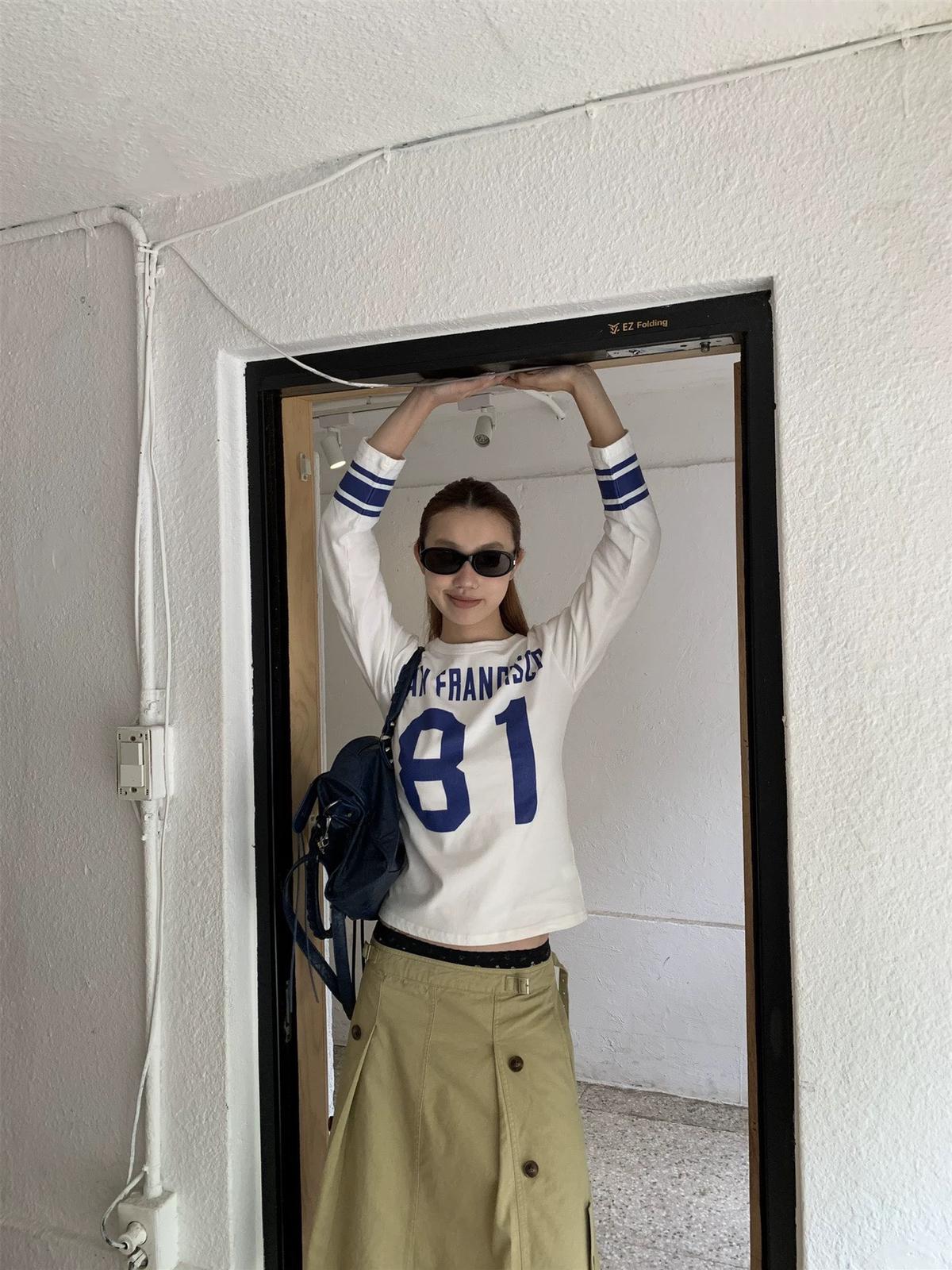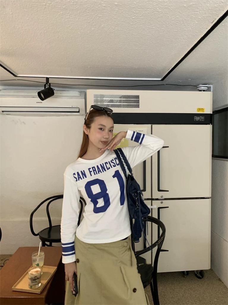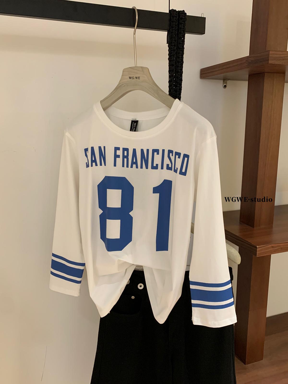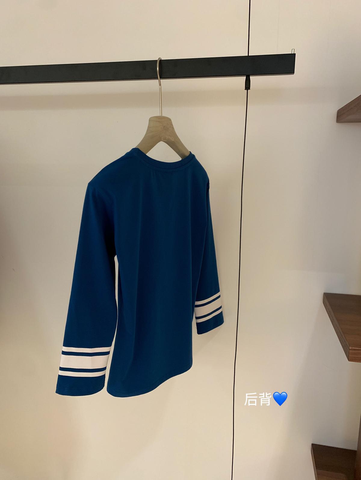 3. 【C7241】美式復古簡約時尚休閒藏青黃撞色印花長袖T恤