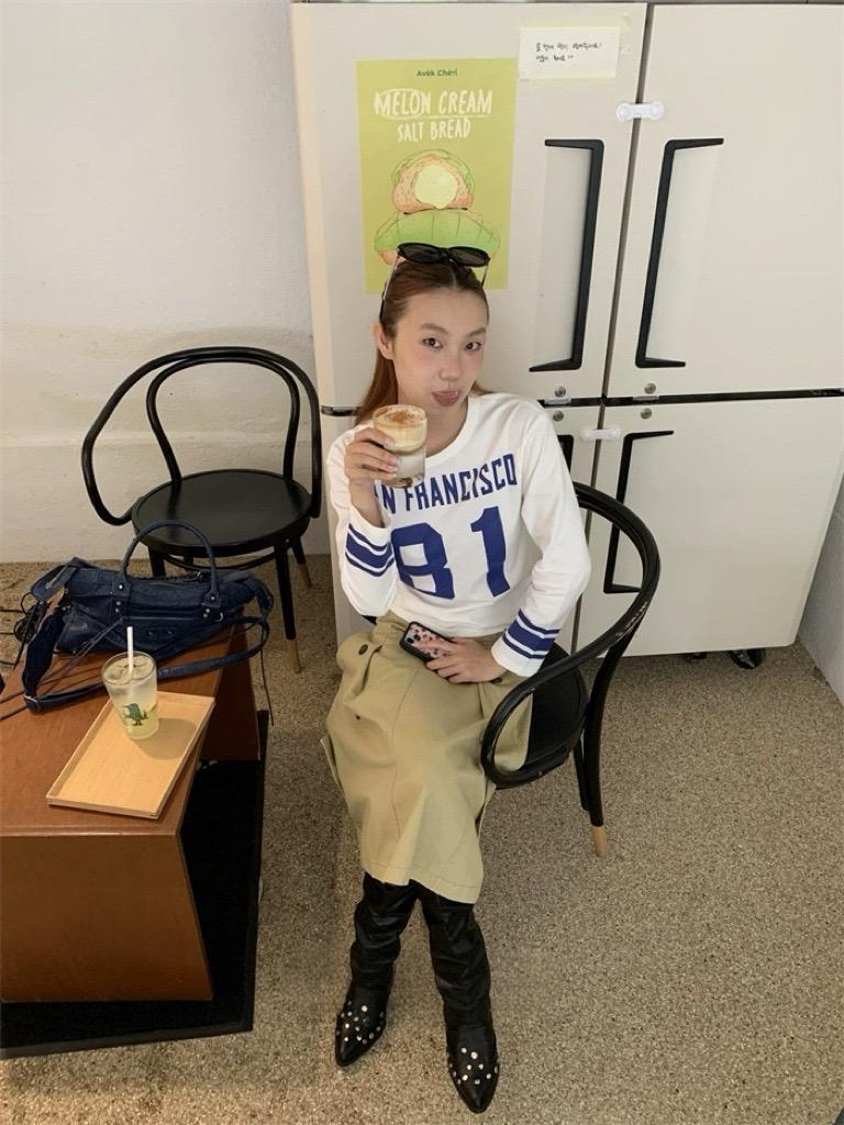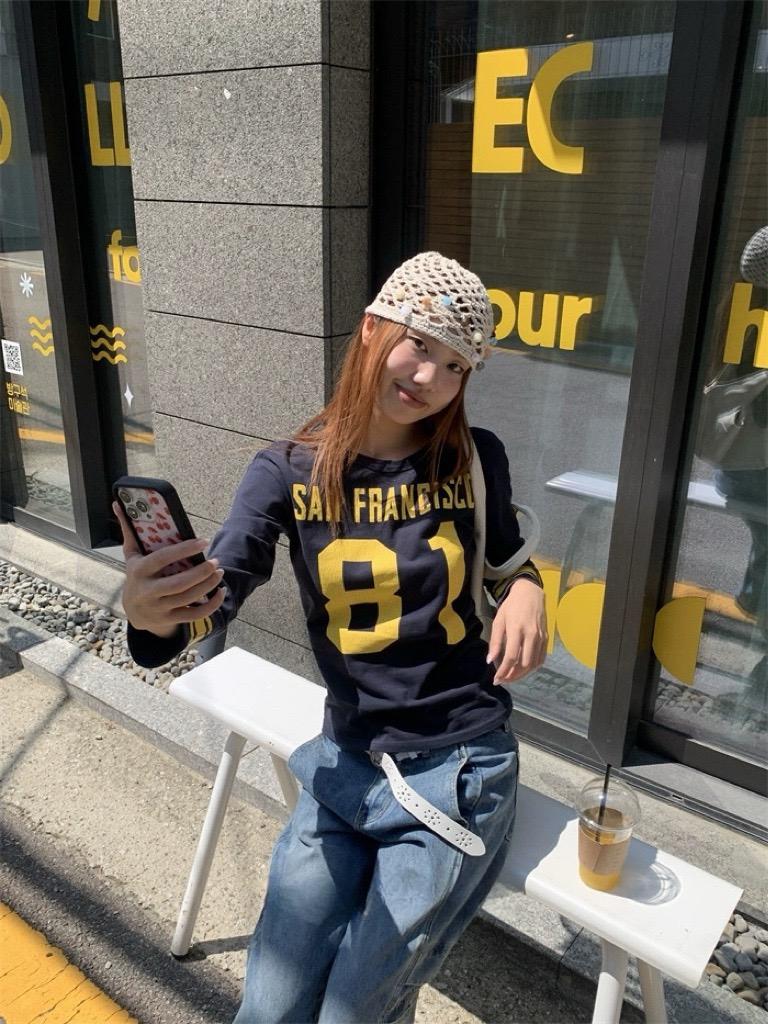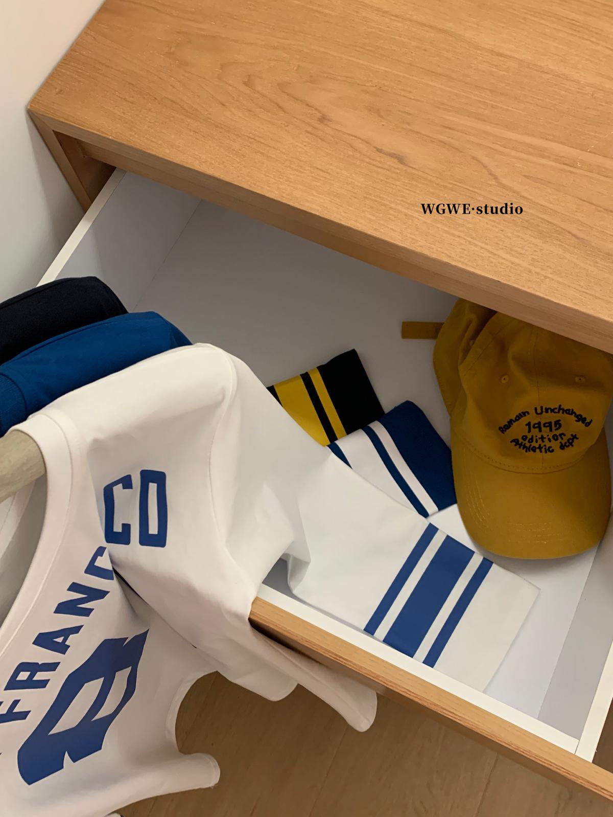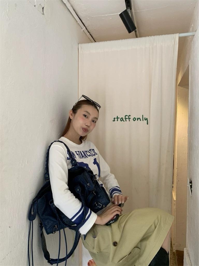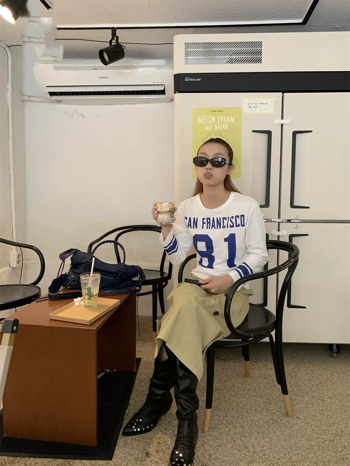 3. 【C7241】美式復古簡約時尚休閒藏青黃撞色印花長袖T恤