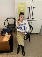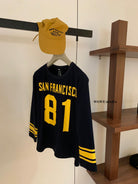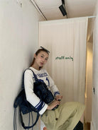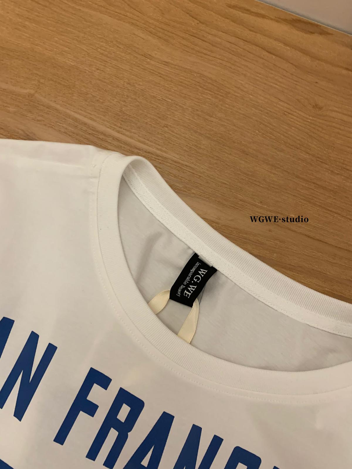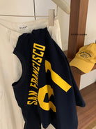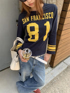 【C7241】美式復古簡約時尚休閒藏青黃撞色印花長袖T恤