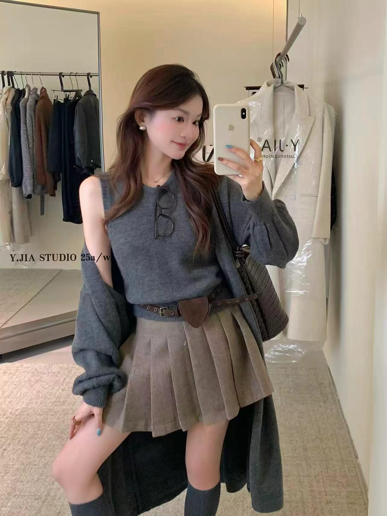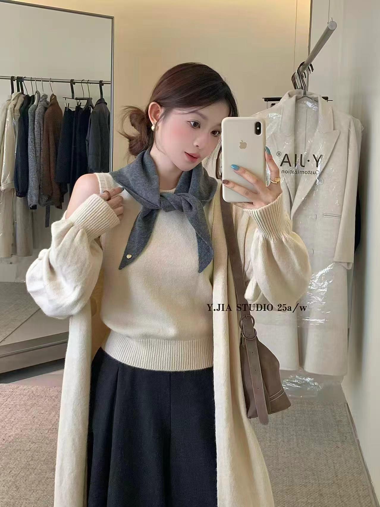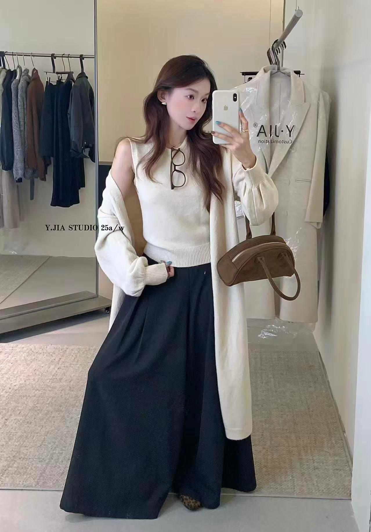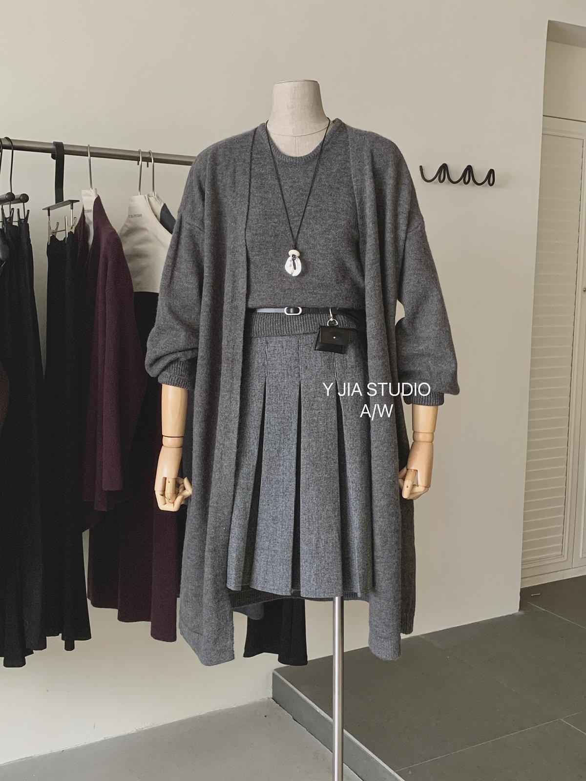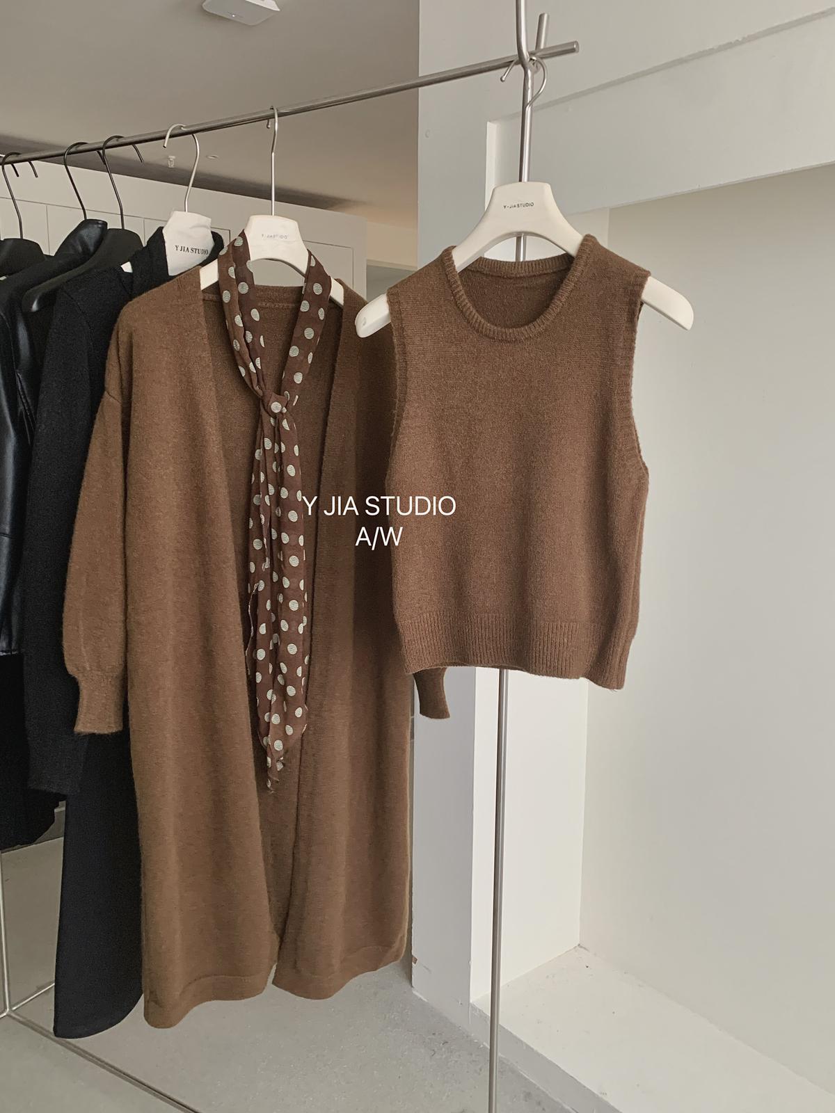 【C7352】慵懶風通勤寬鬆休閒長款針織開衫+短款針織背心套裝