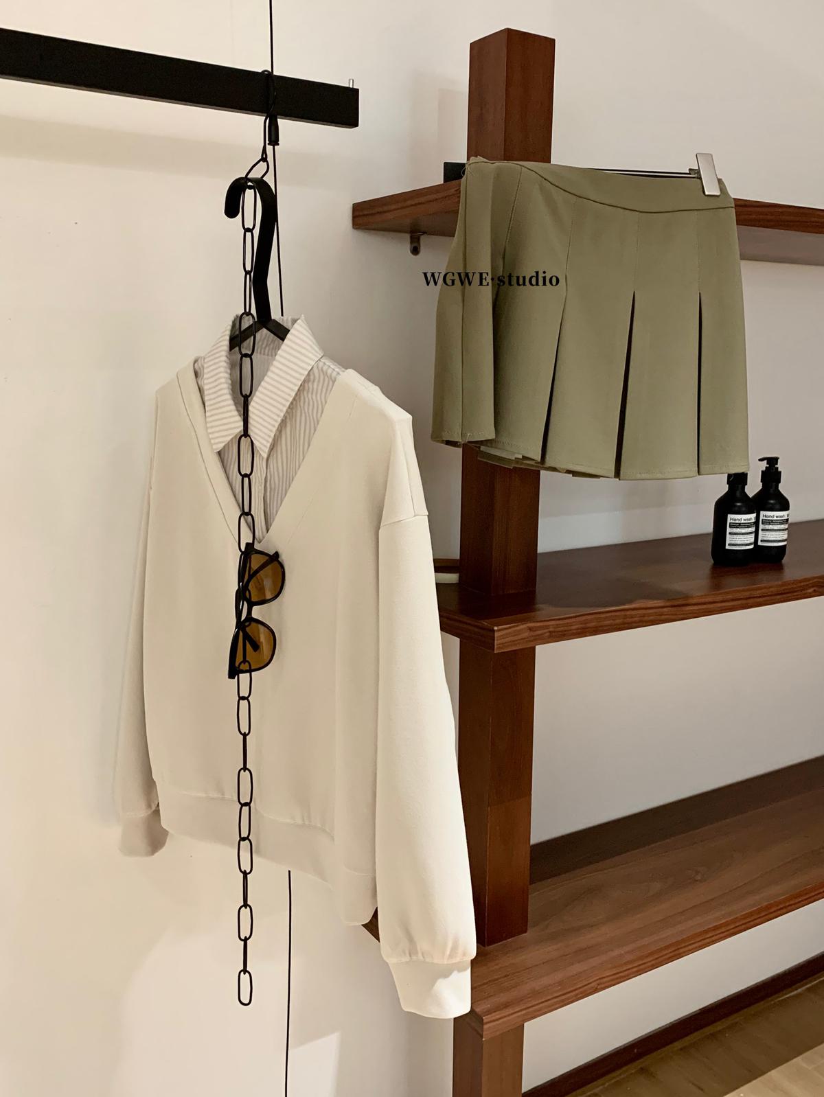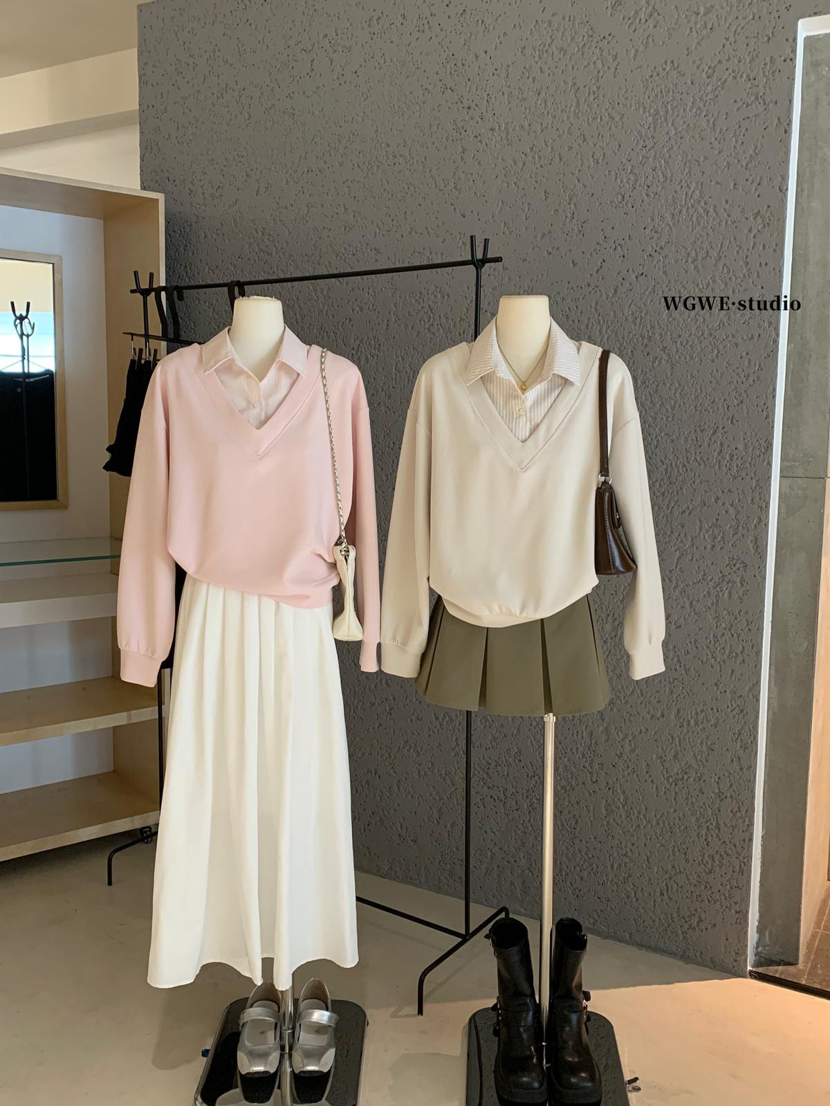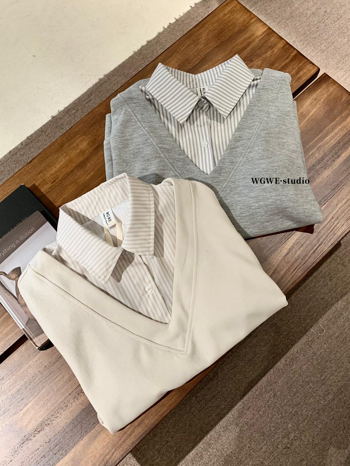 【C7569】襯衫領拼接假兩件寬鬆休閒小衆設計感衛衣