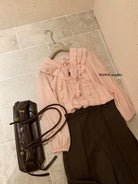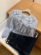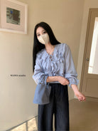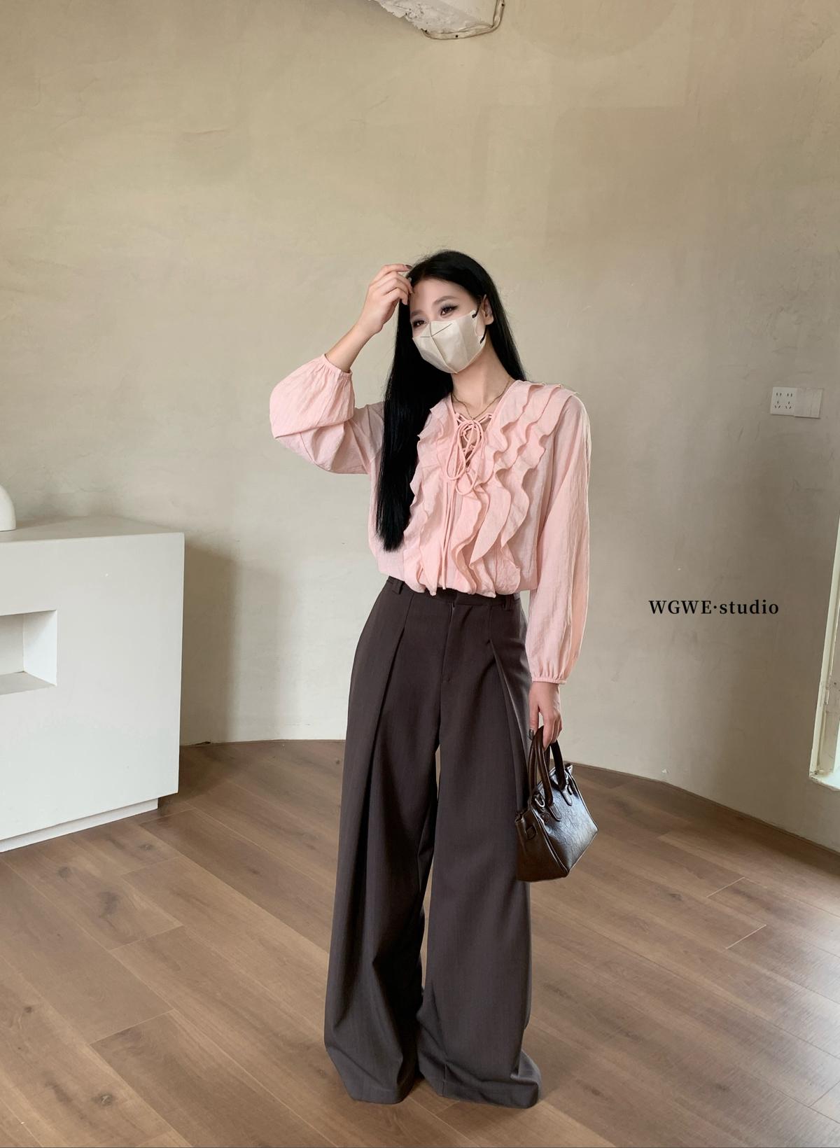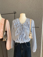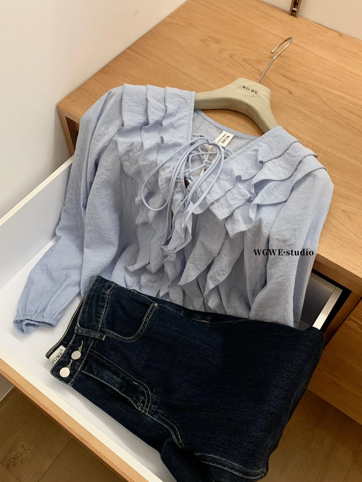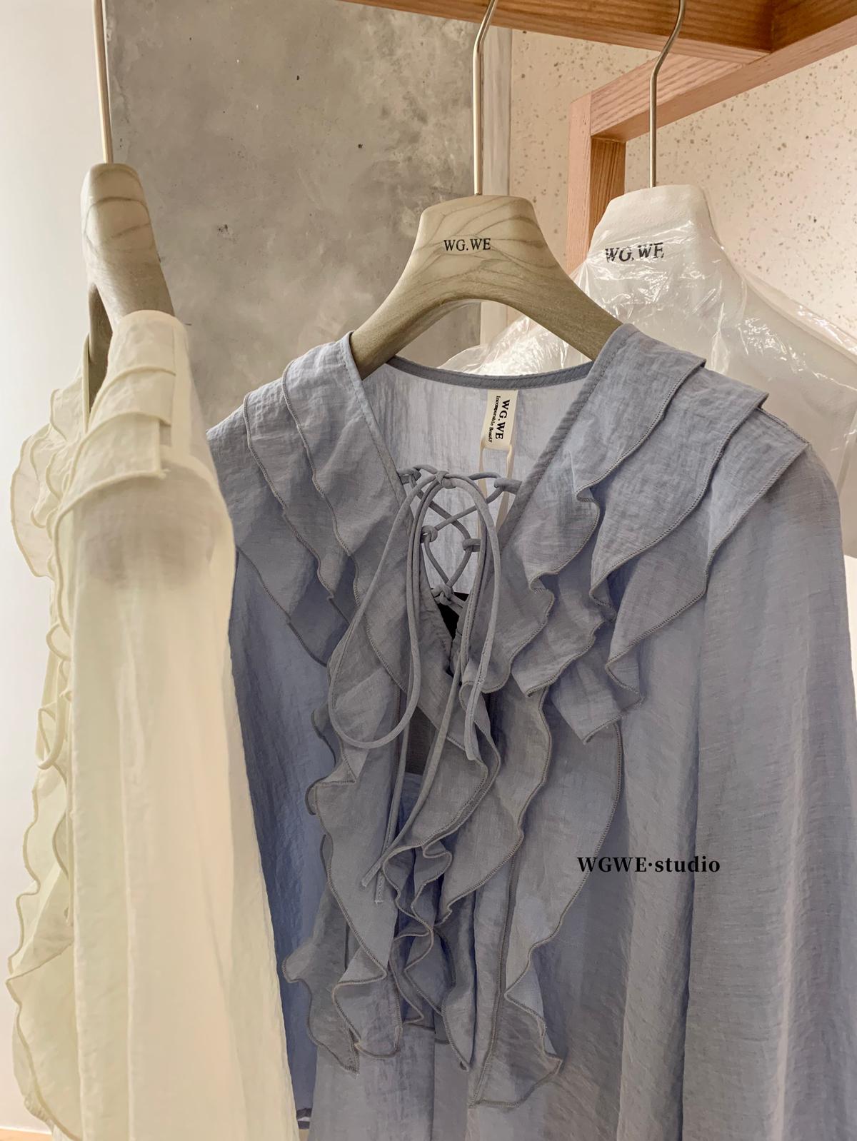 【C7584】氛圍感荷葉邊襯衣上衣法式高級感長袖V領襯衫