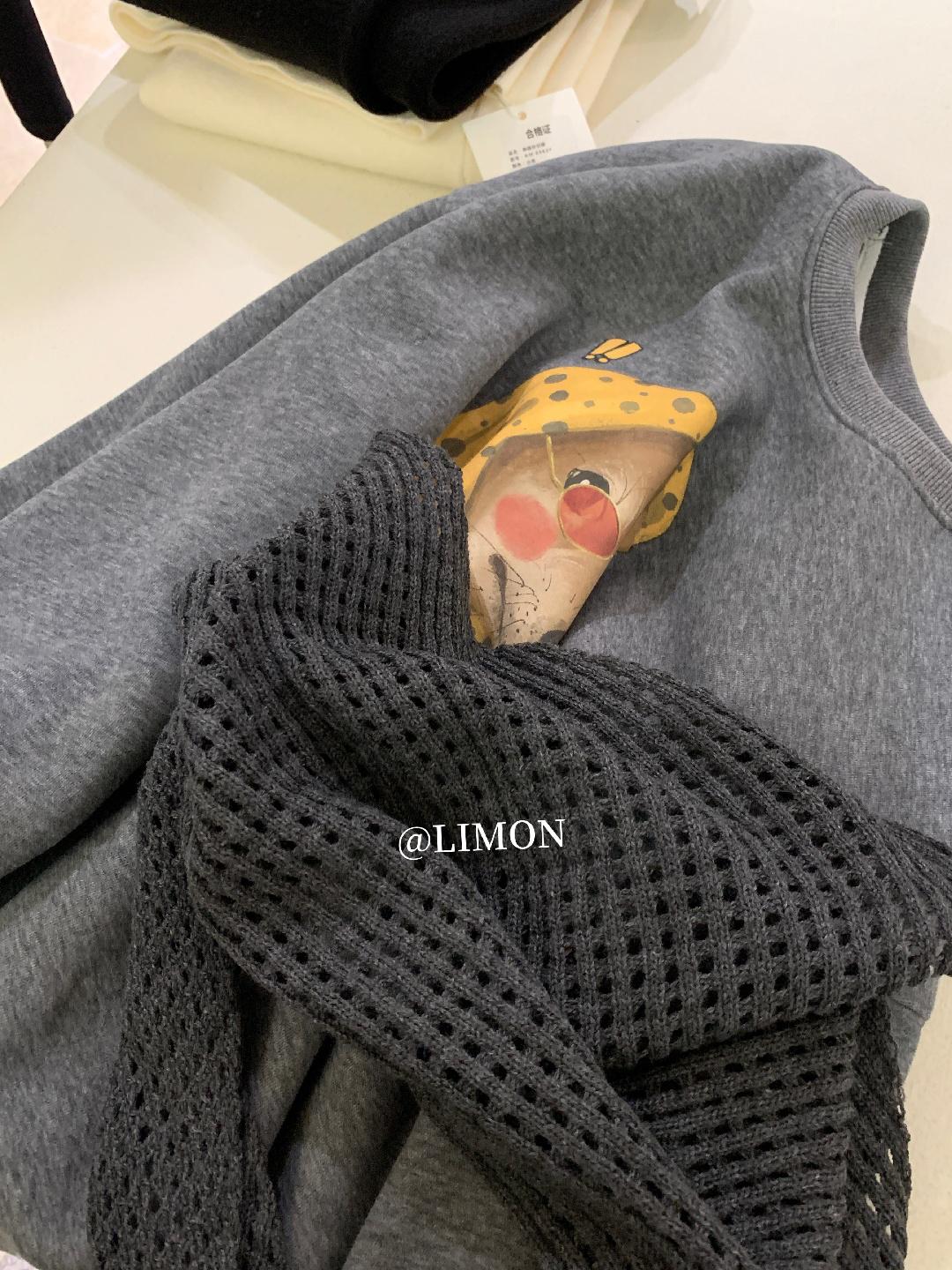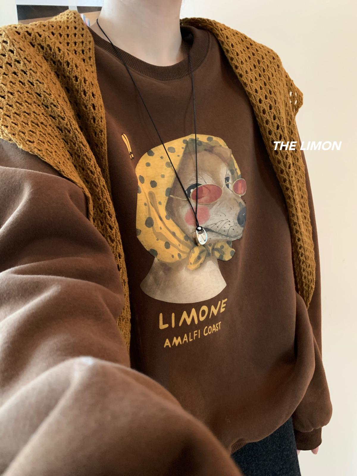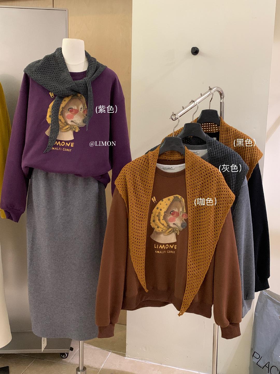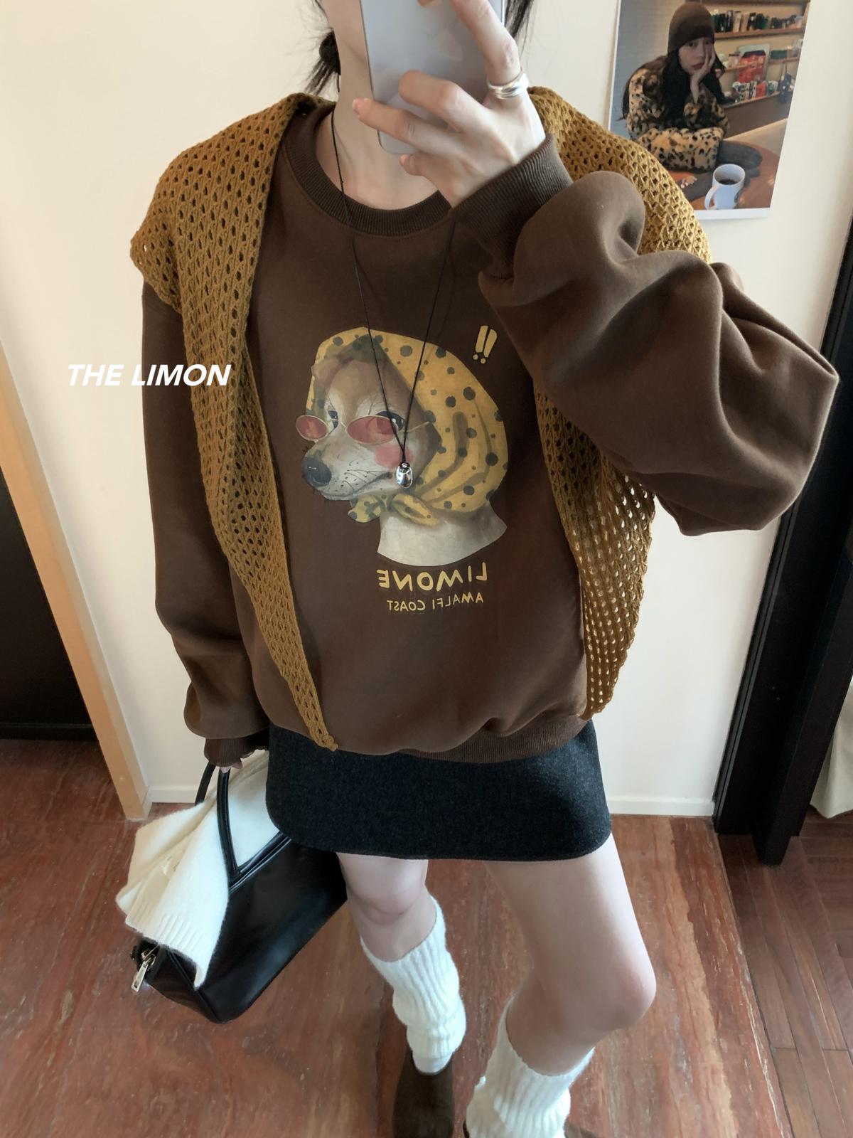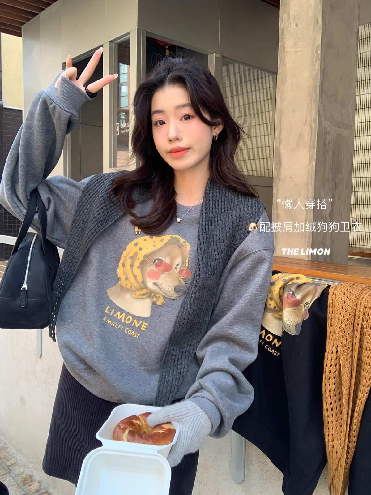 【C7652】美式復古減齡臘波點狗狗印花加絨衛衣(配披肩)
