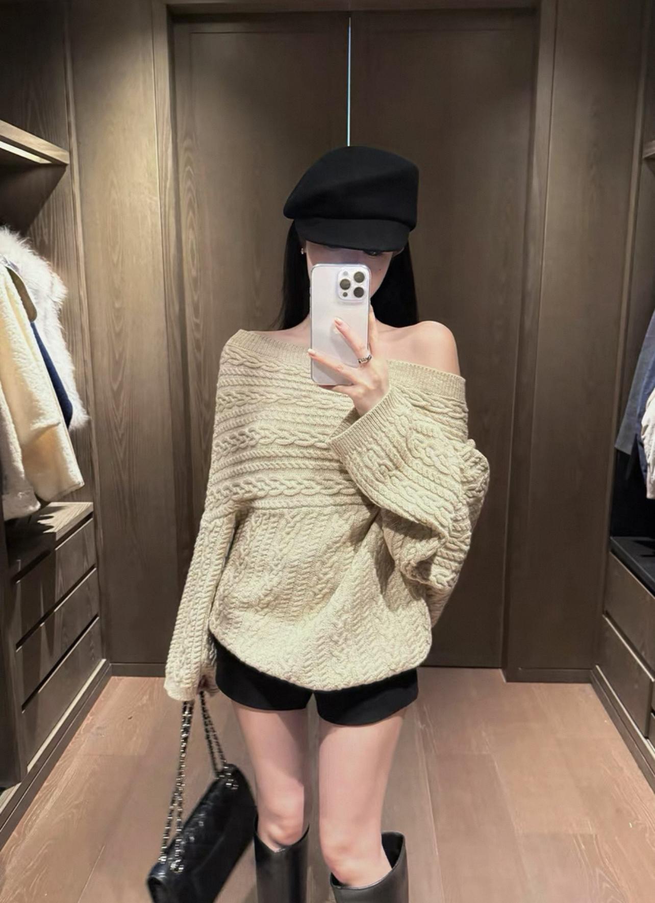 3. 【C7668】洋氣百搭純色慵懶鬆弛一字領露肩提花肌理感寬鬆加厚長袖針織保暖毛衣