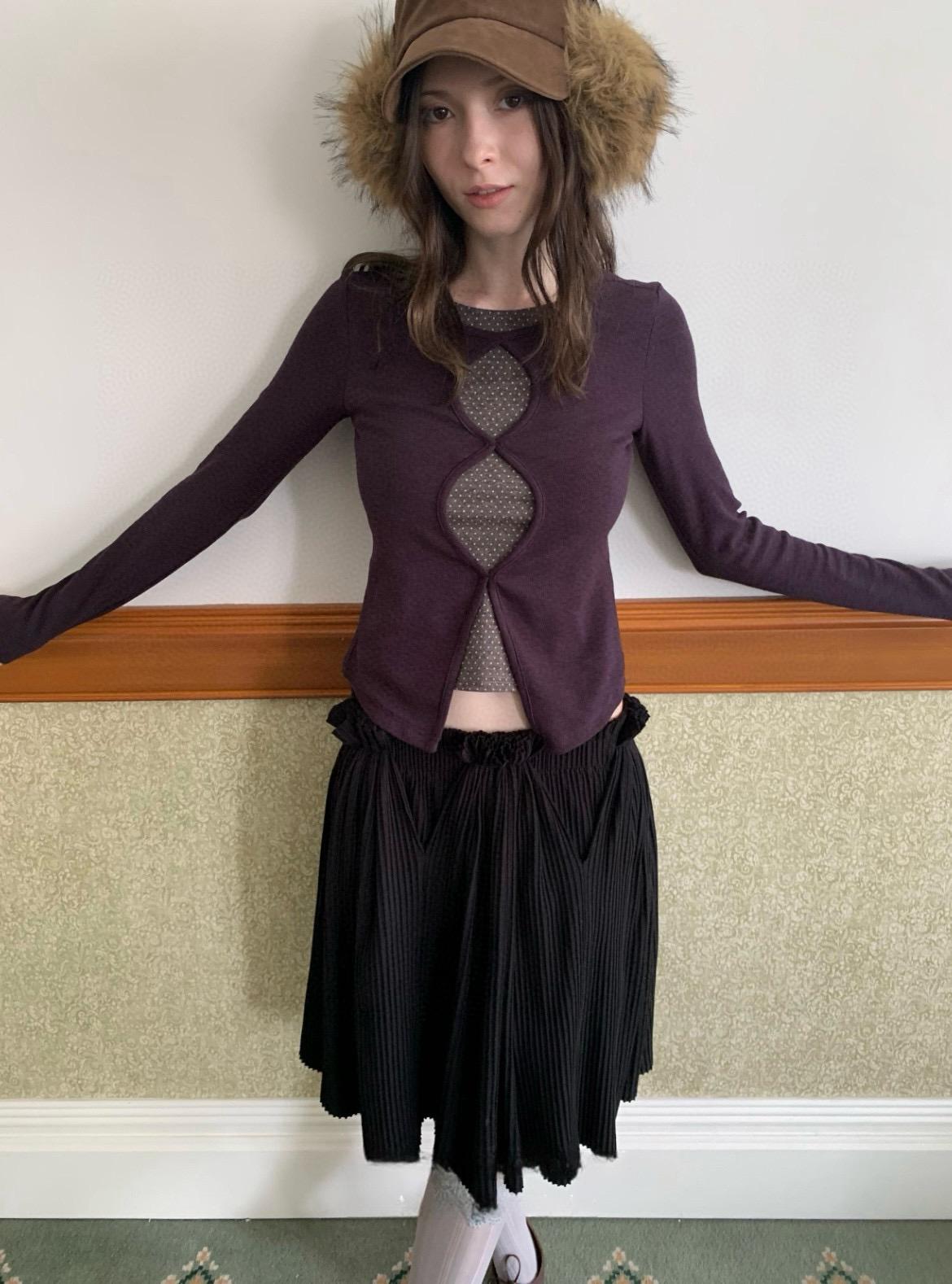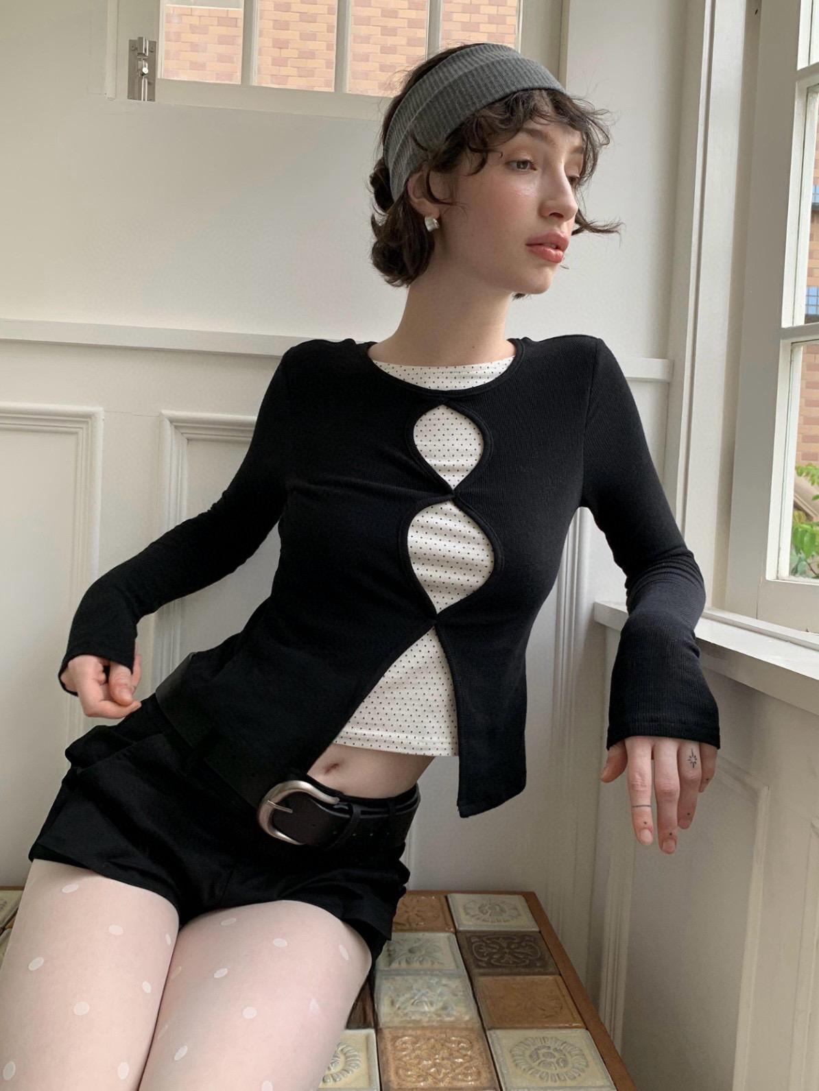 3. 【C7709】假兩件鏤空波點修身針織上衣長袖T恤