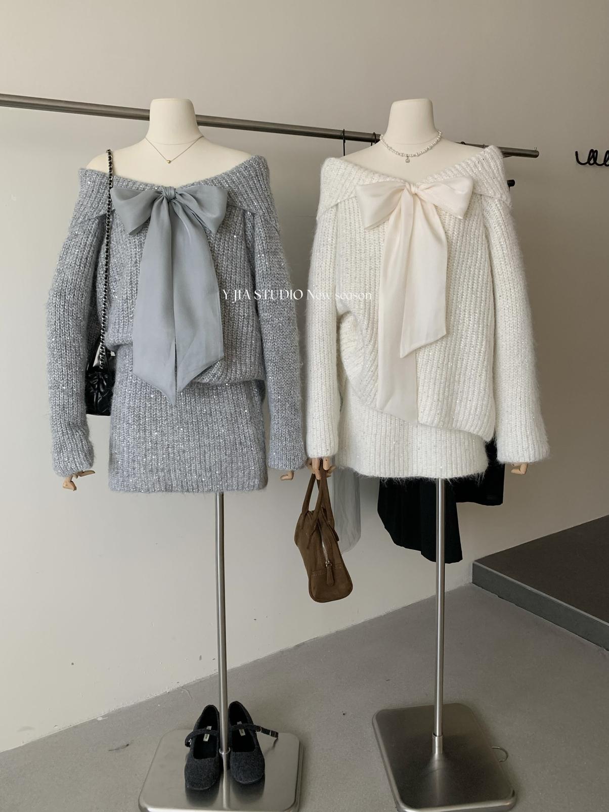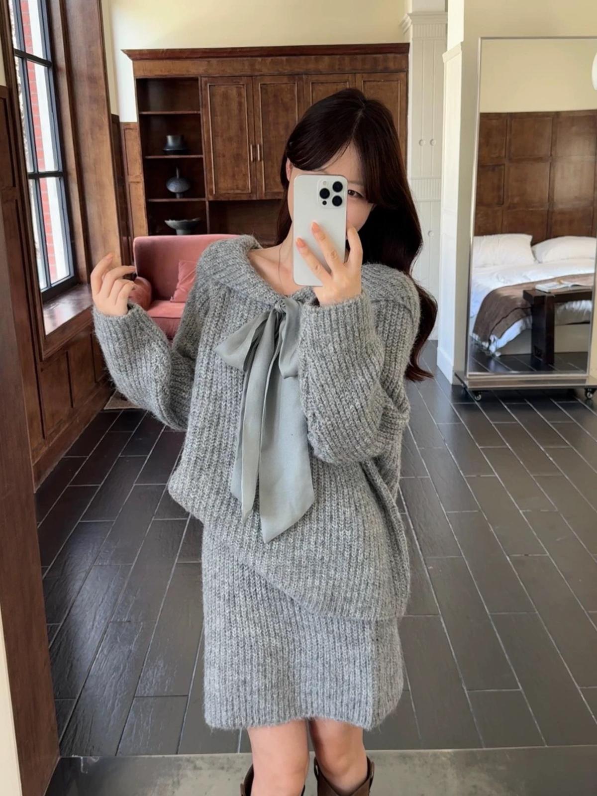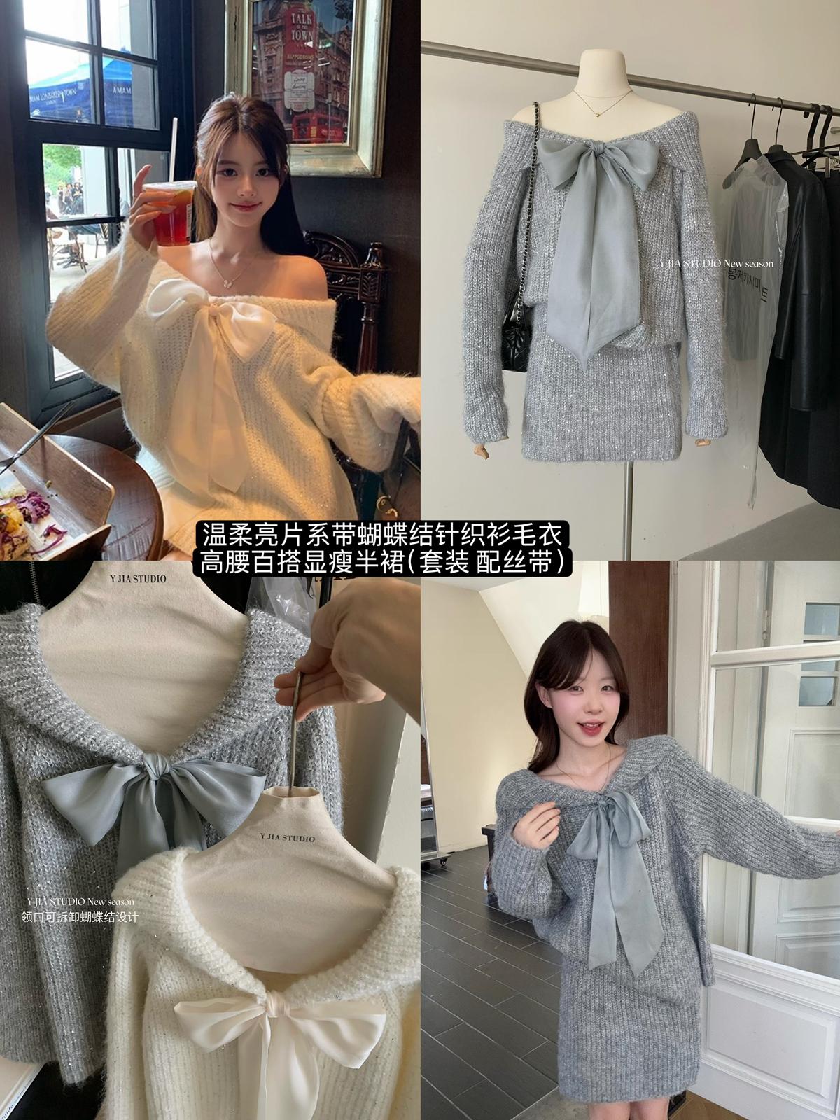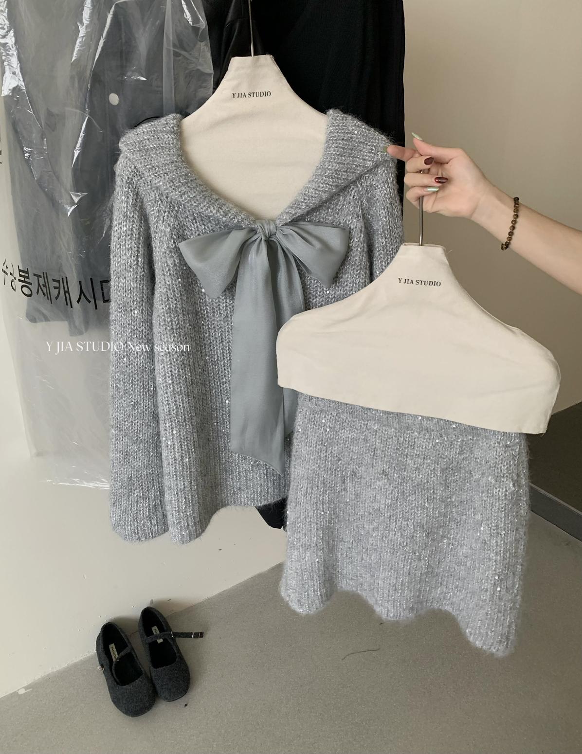 3. 【C7745】溫柔亮片繫帶蝴蝶結針織毛衣+高腰針織半身裙套裝(配絲巾)