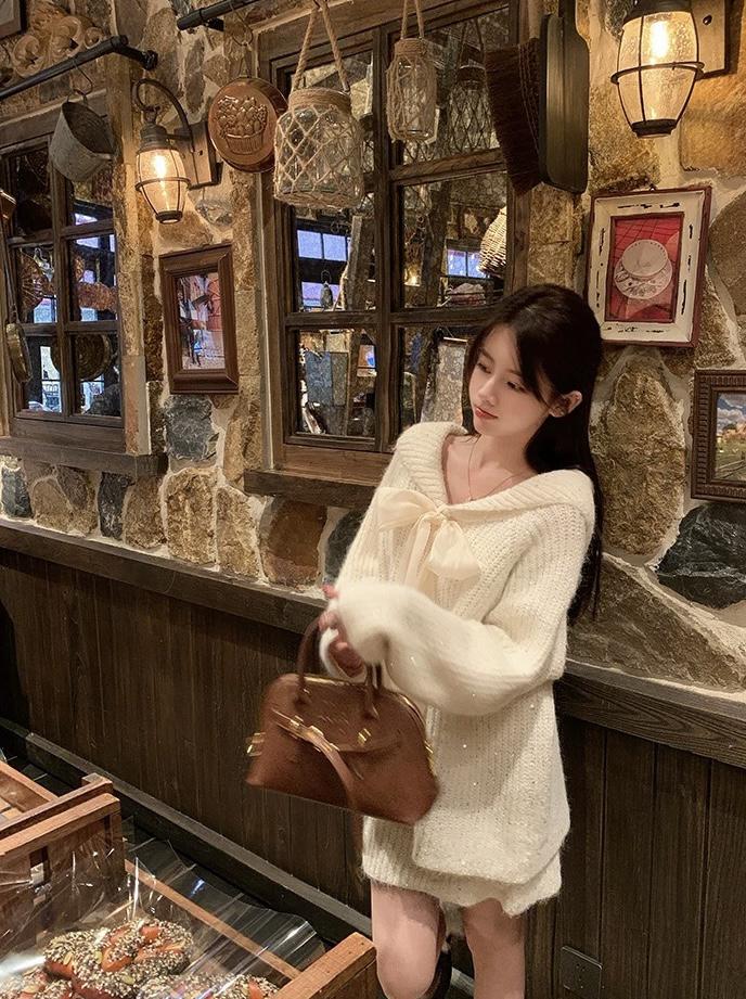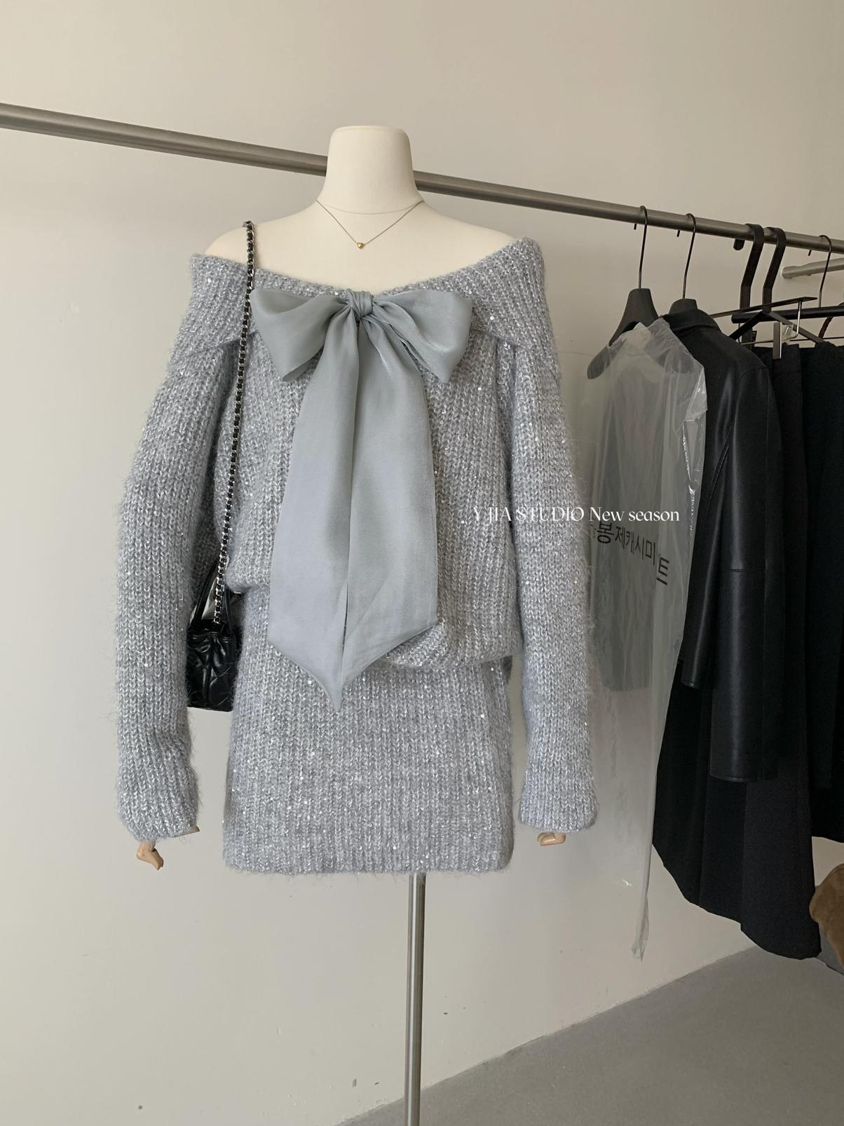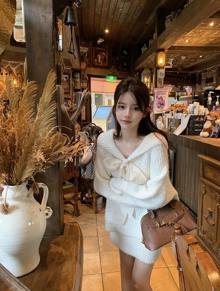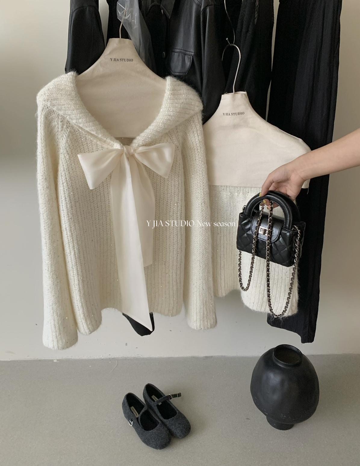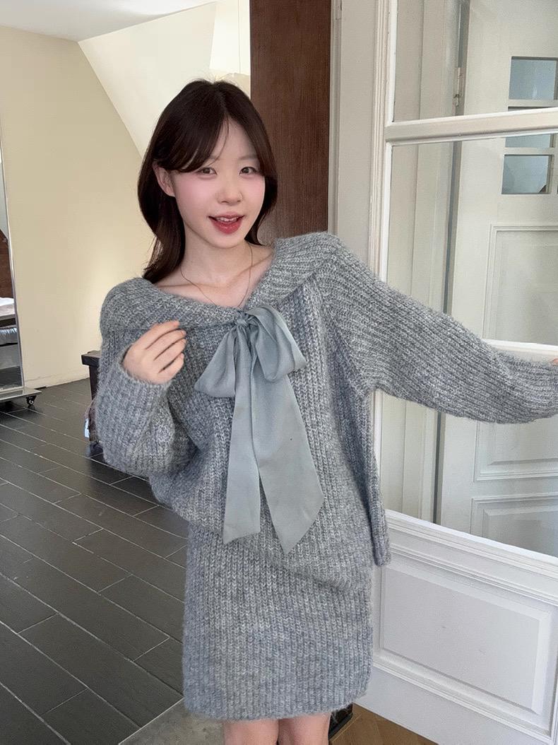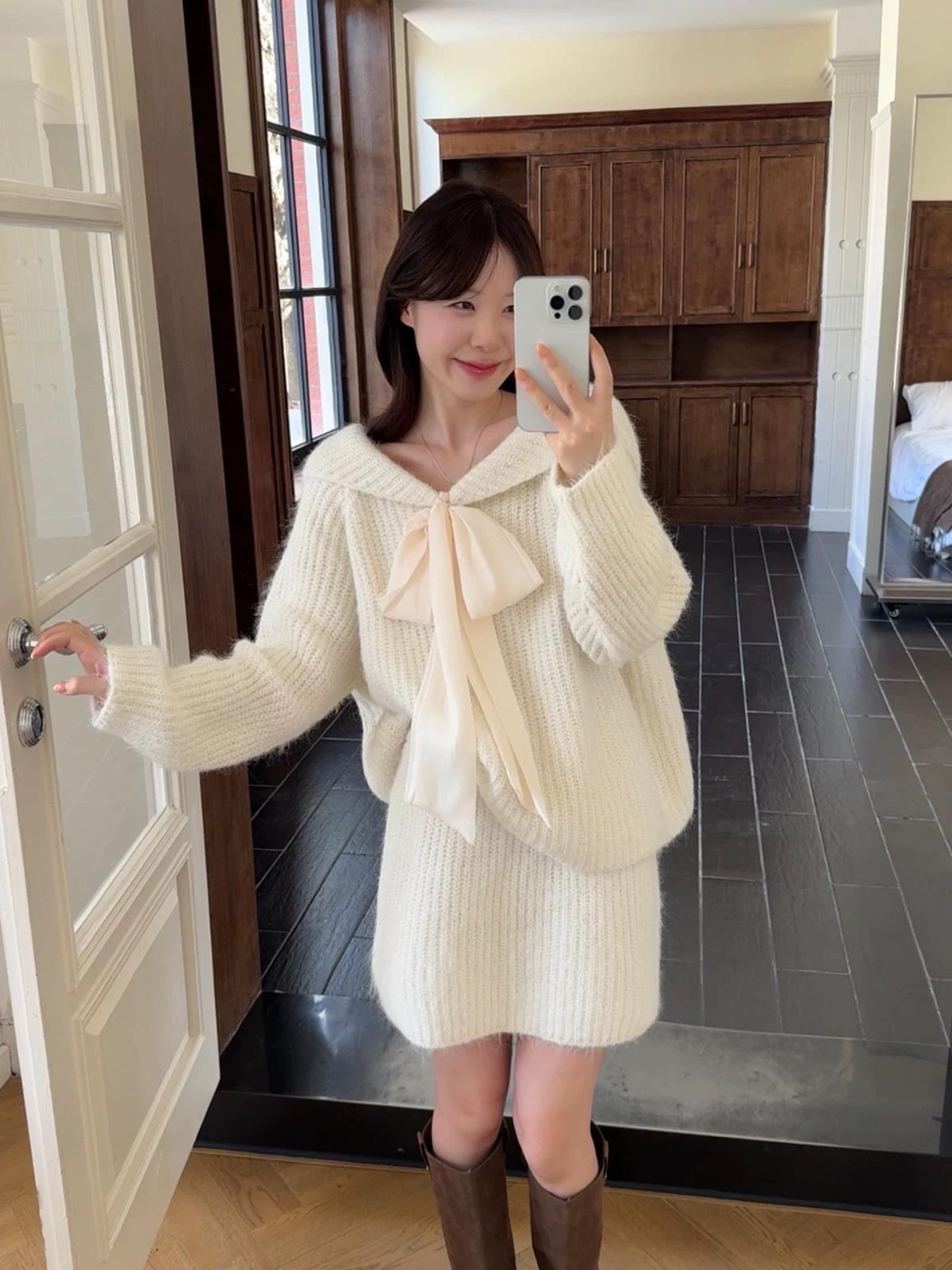 3. 【C7745】溫柔亮片繫帶蝴蝶結針織毛衣+高腰針織半身裙套裝(配絲巾)