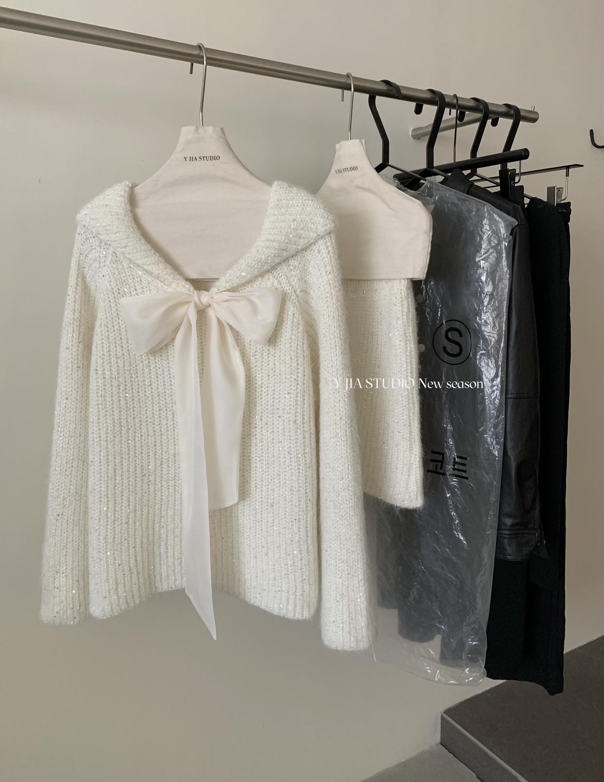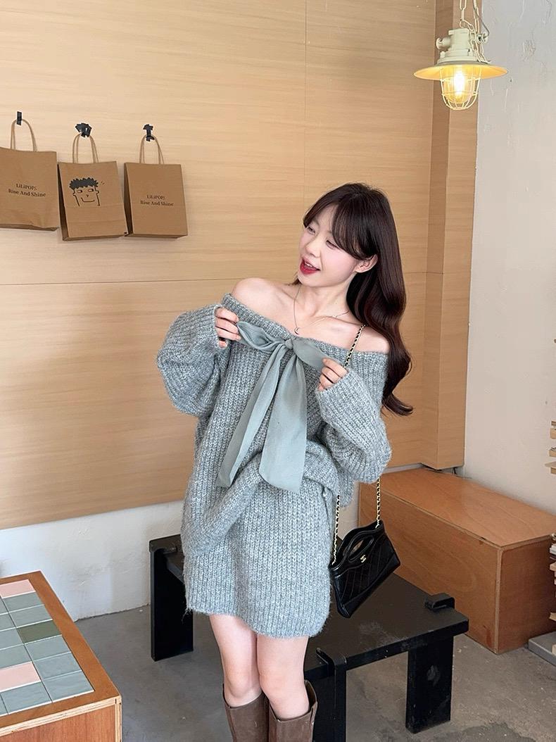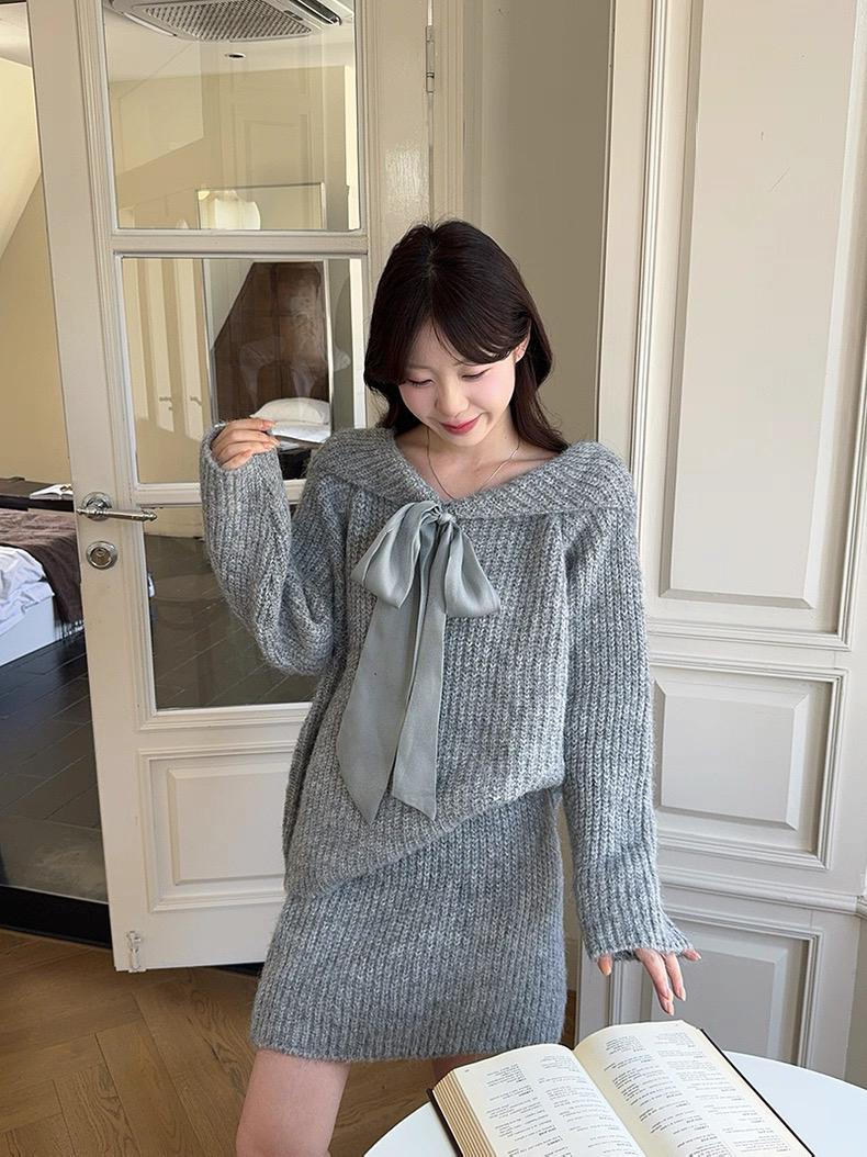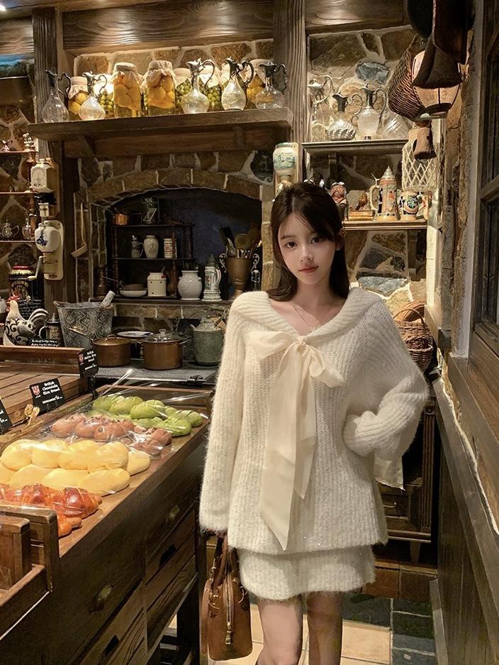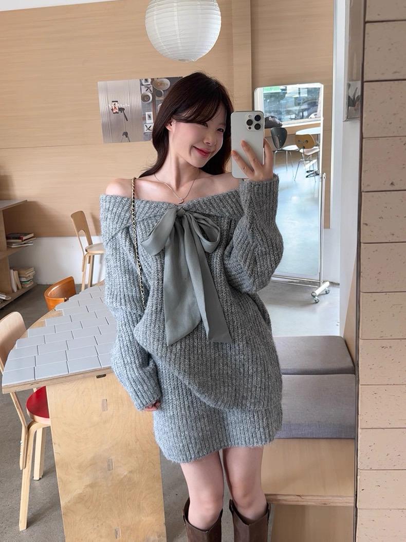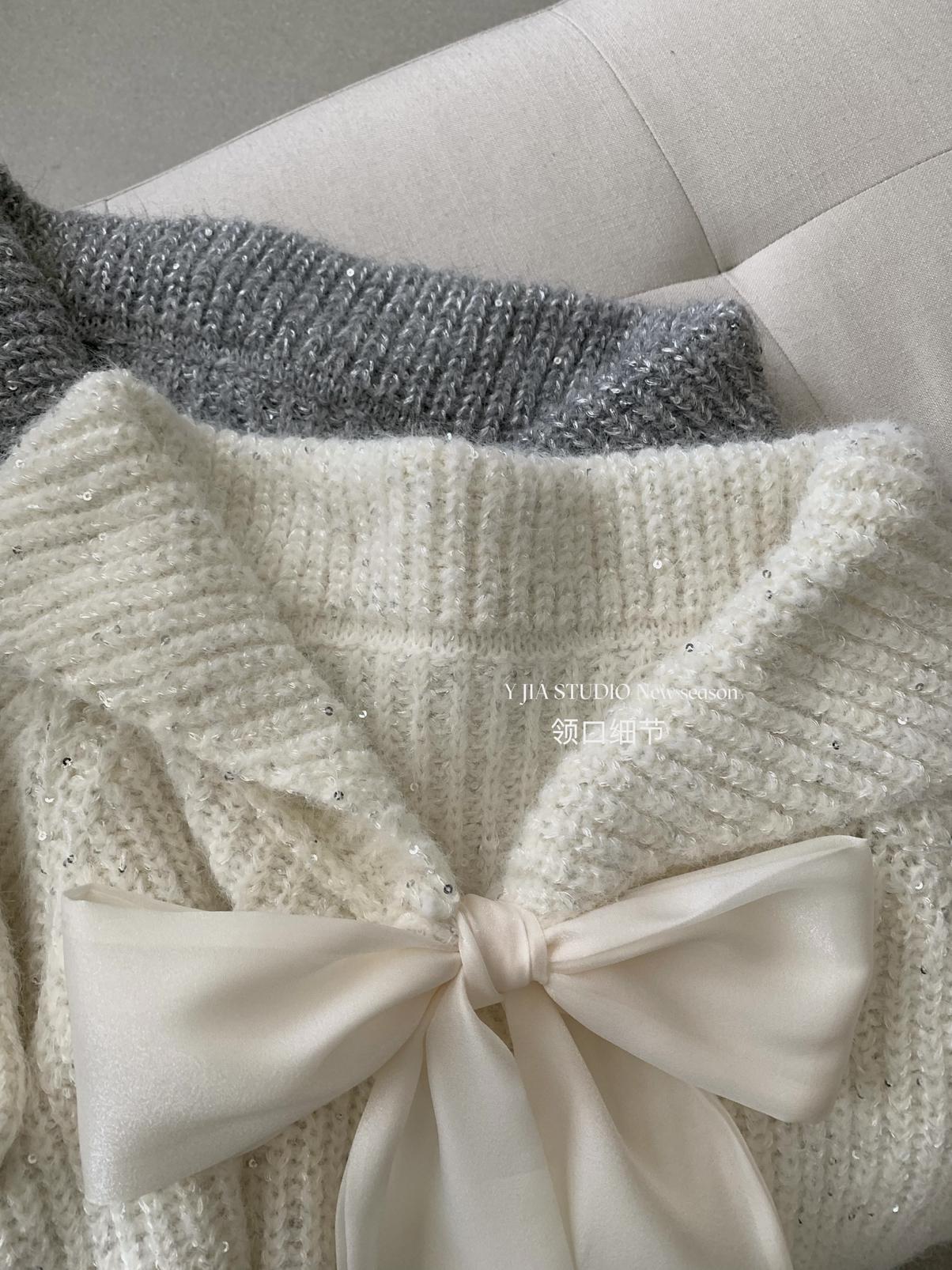 3. 【C7745】溫柔亮片繫帶蝴蝶結針織毛衣+高腰針織半身裙套裝(配絲巾)