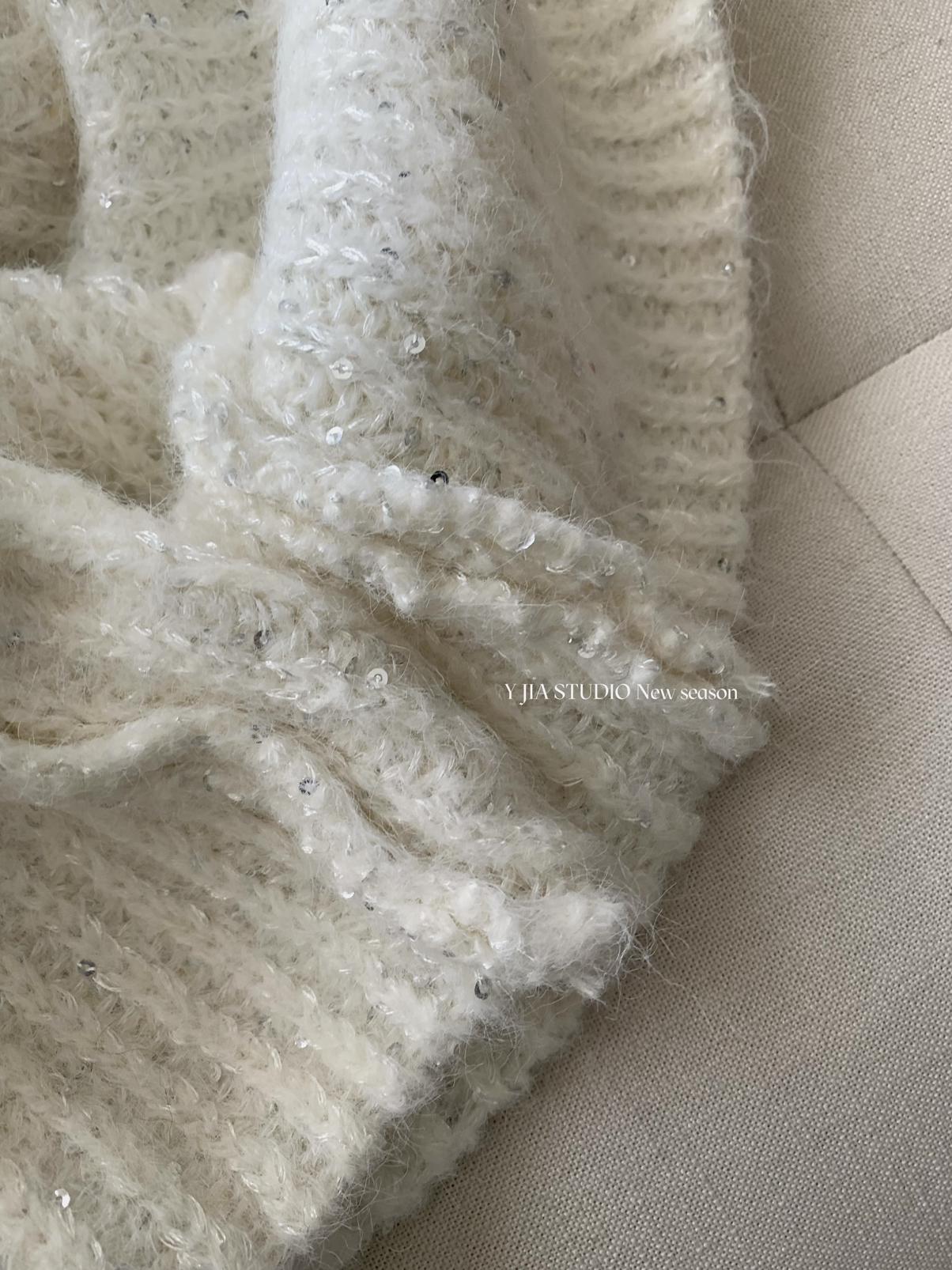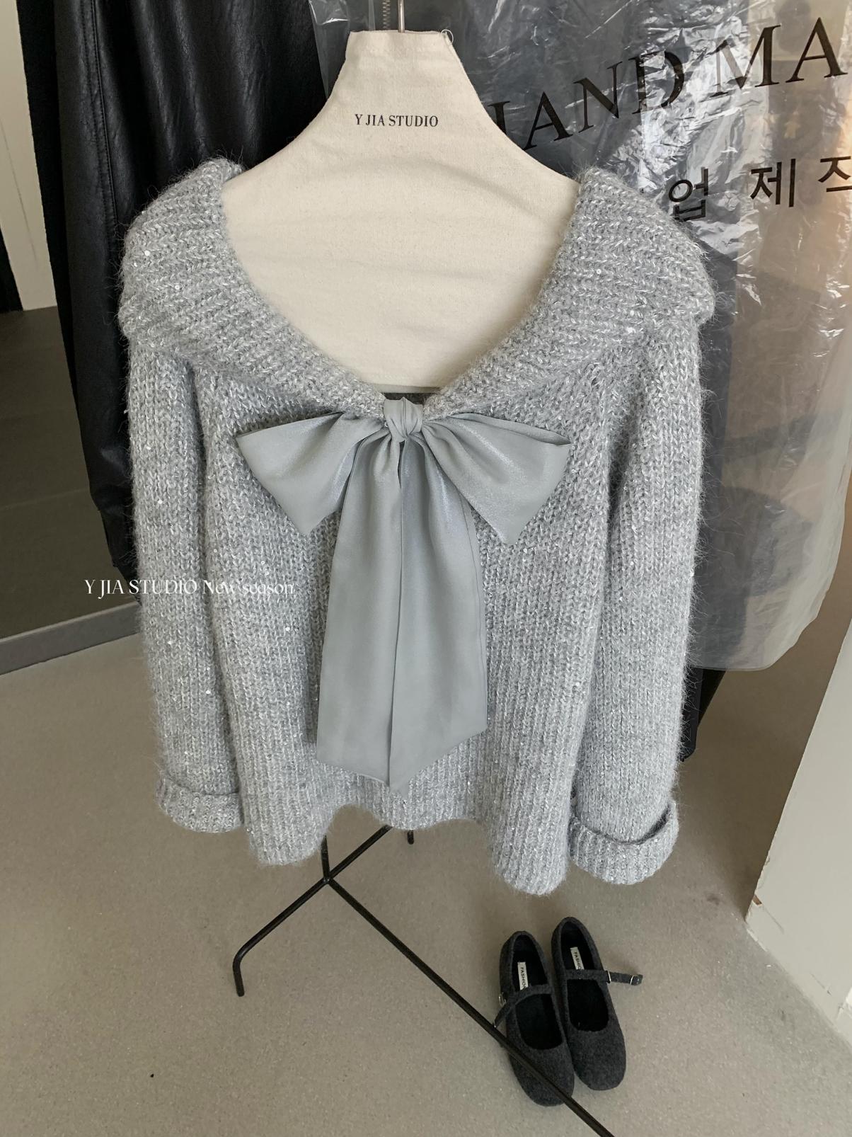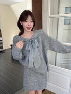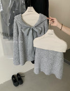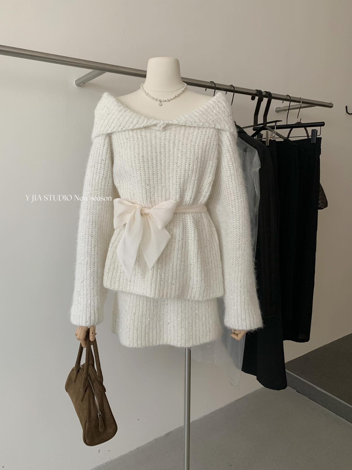 【C7745】溫柔亮片繫帶蝴蝶結針織毛衣+高腰針織半身裙套裝(配絲巾)