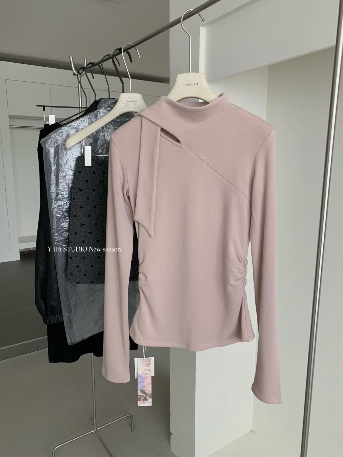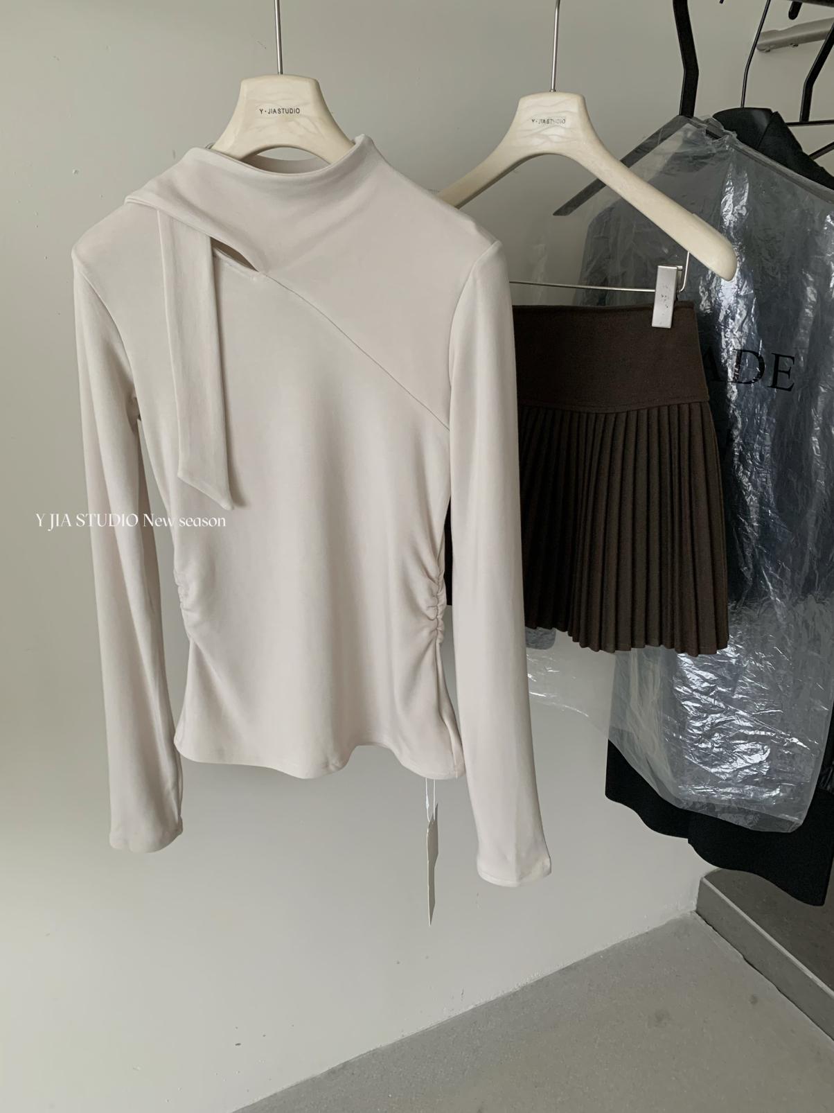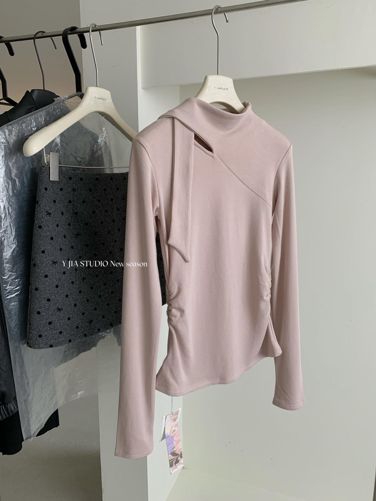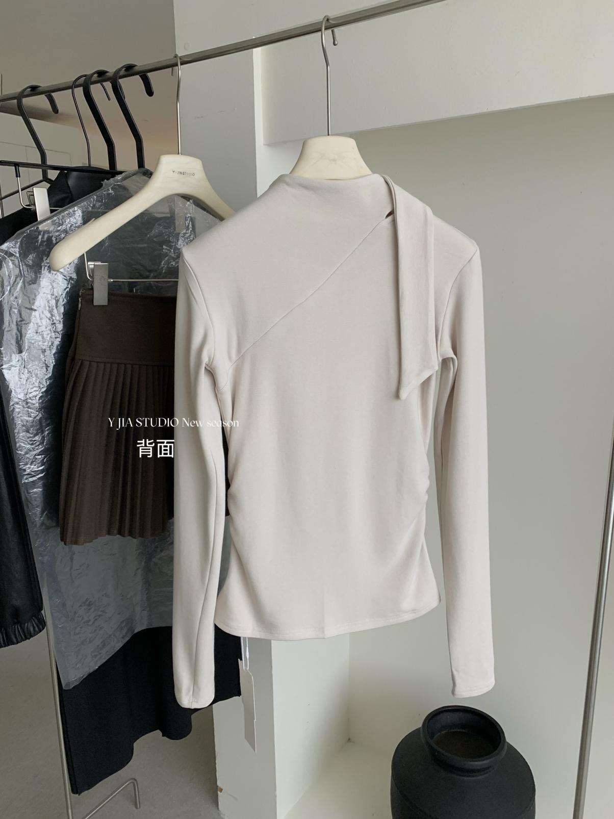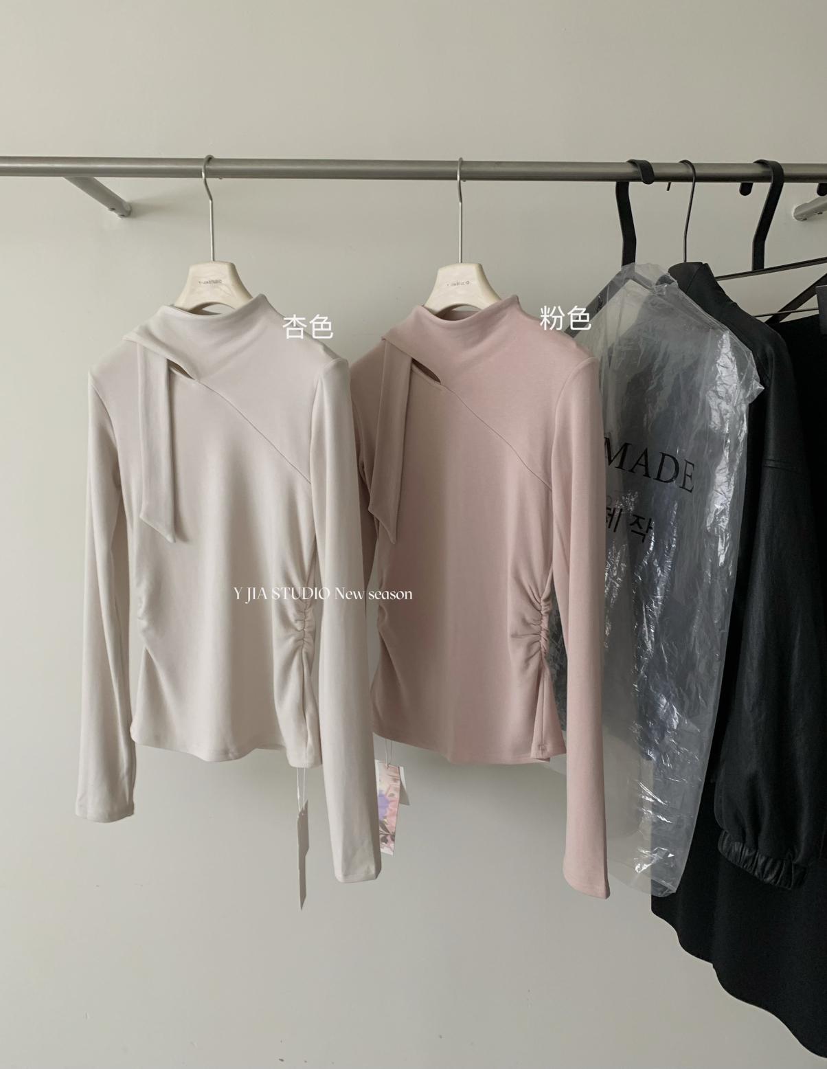 3. 【C7751】磨毛小衆精緻壓褶收腰不規則飄帶設計長袖T恤