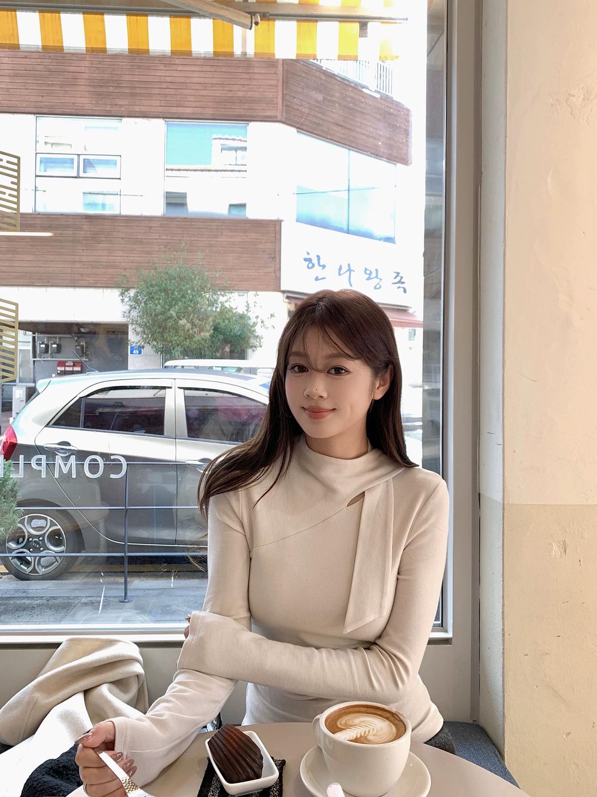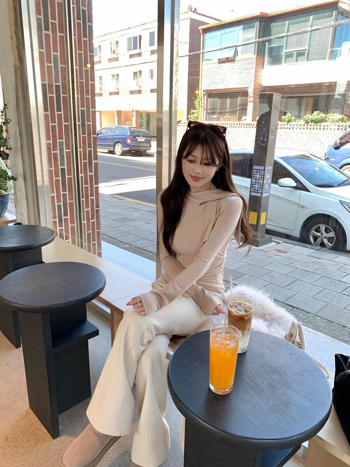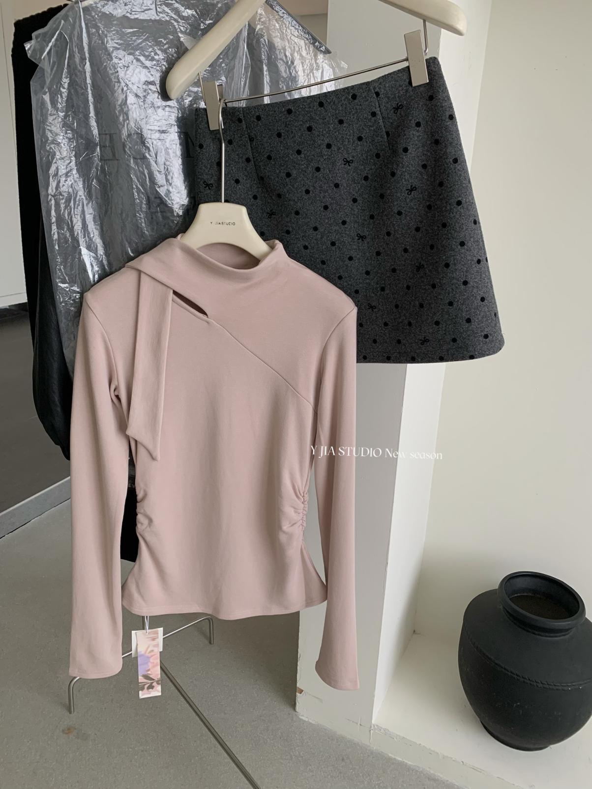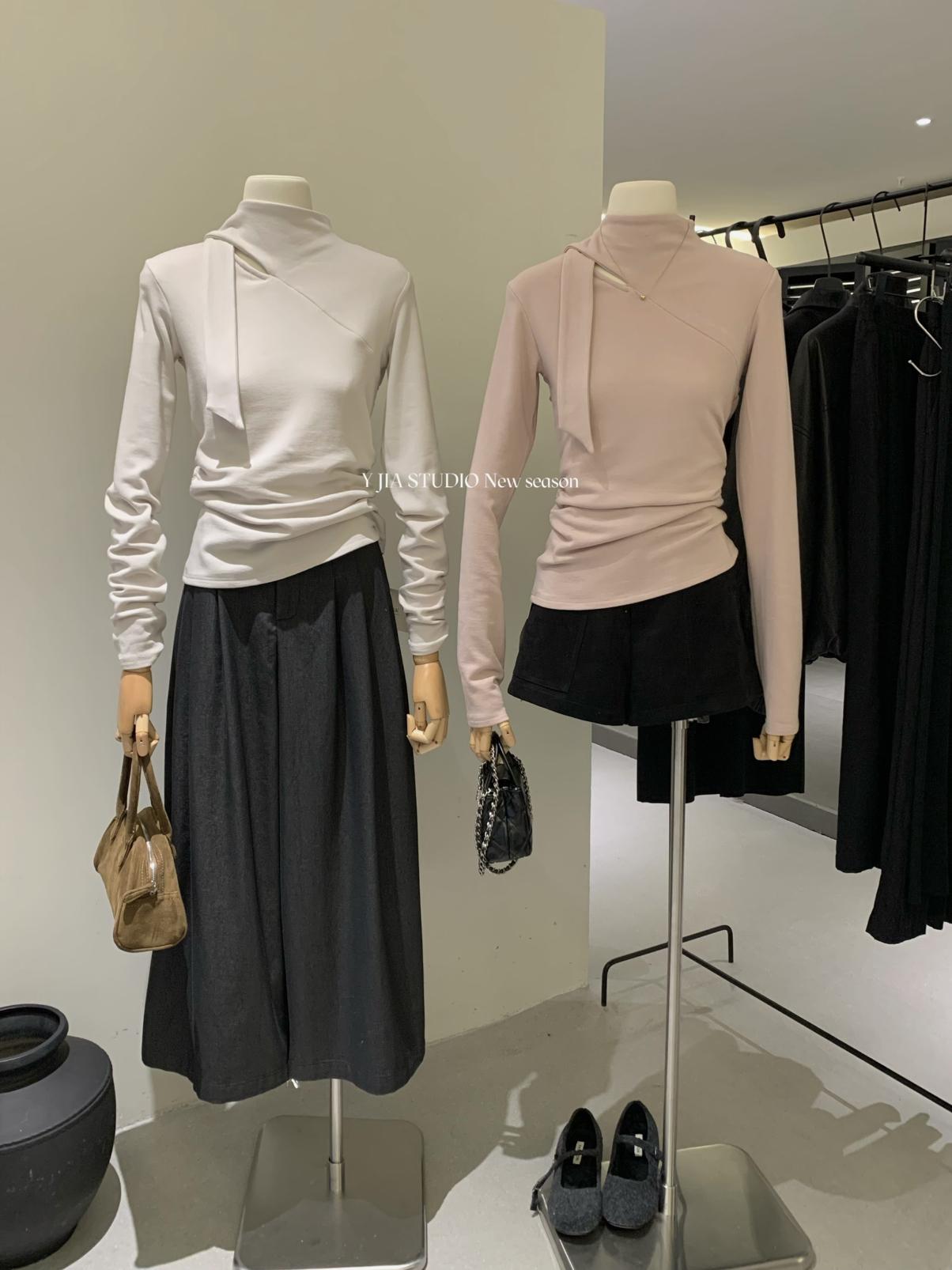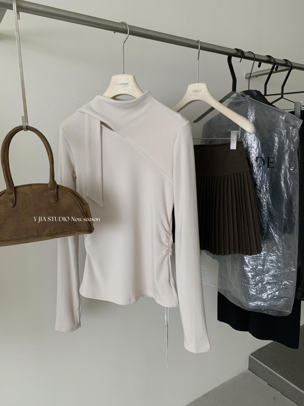 3. 【C7751】磨毛小衆精緻壓褶收腰不規則飄帶設計長袖T恤