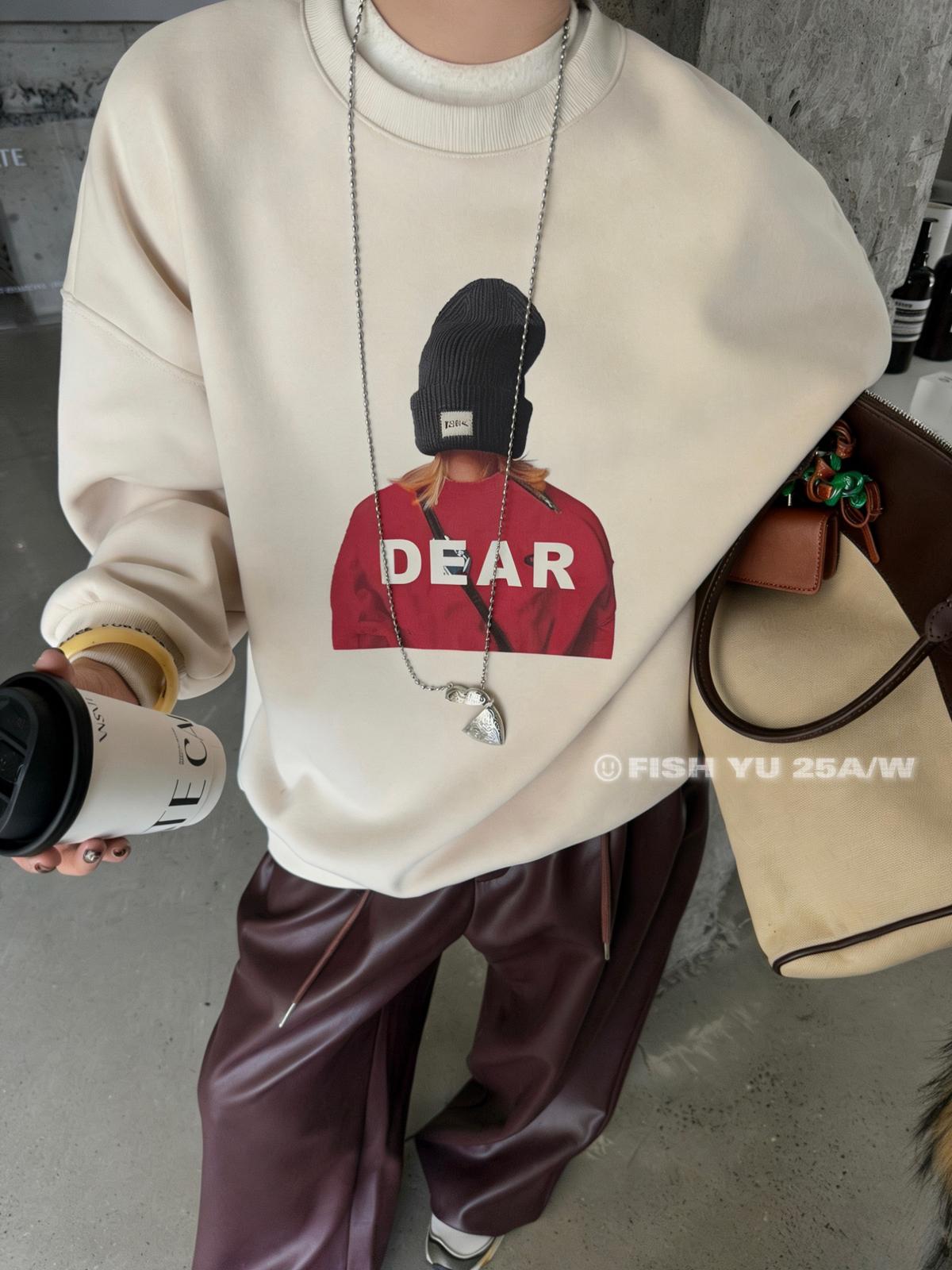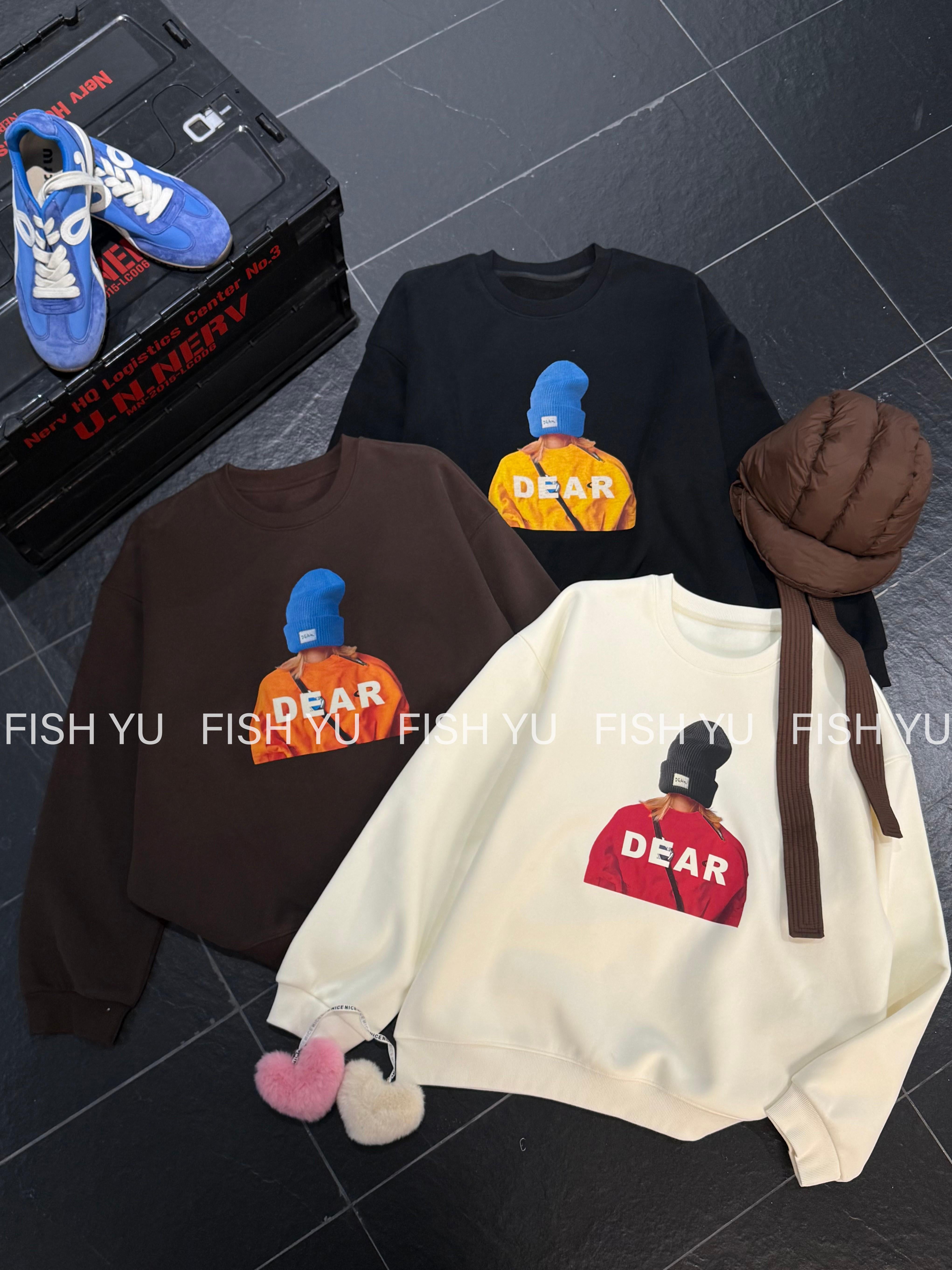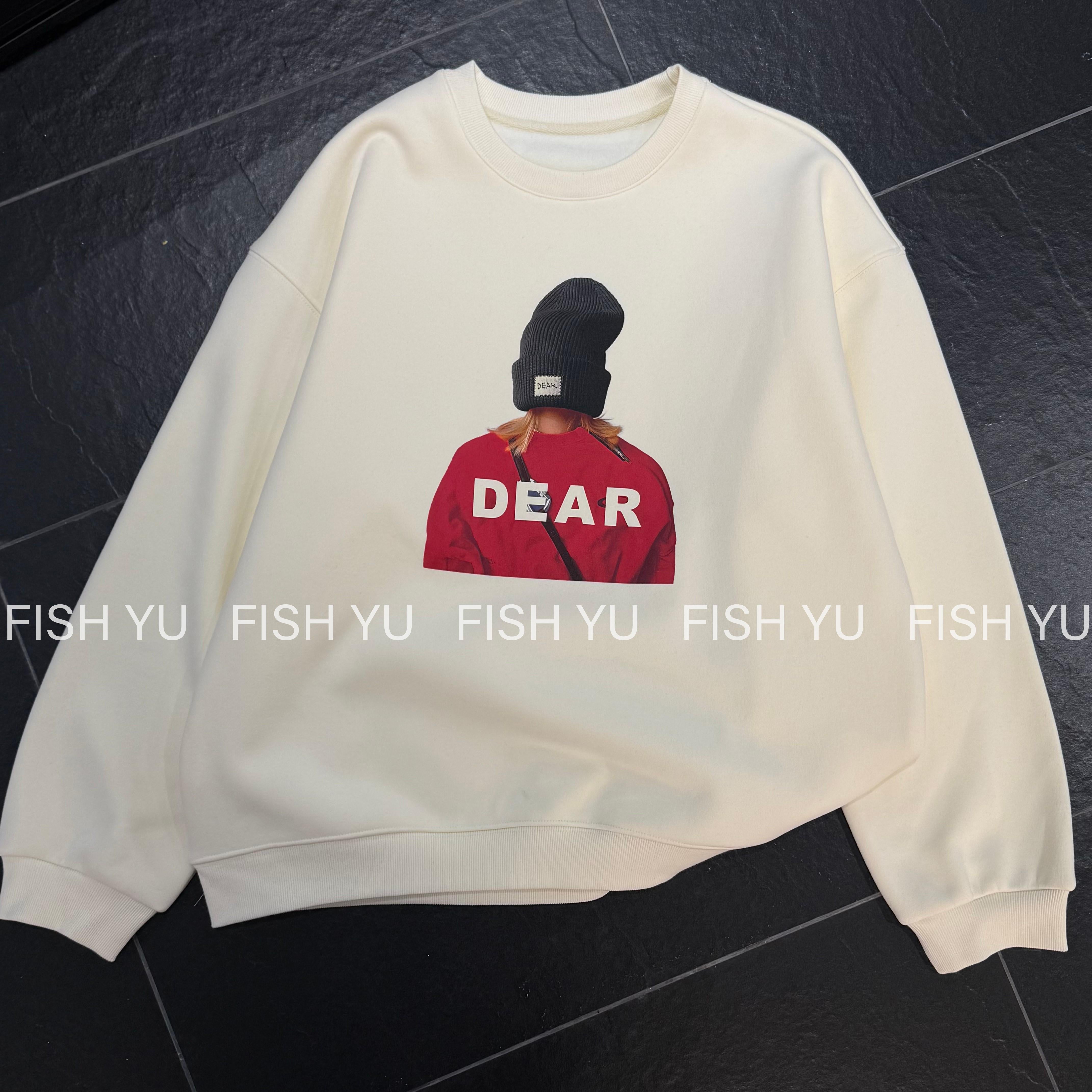 3. 【C8256】美式復古歐美人像DEAR字母直噴印花內裏複合搖粒絨寬鬆圓領衛衣