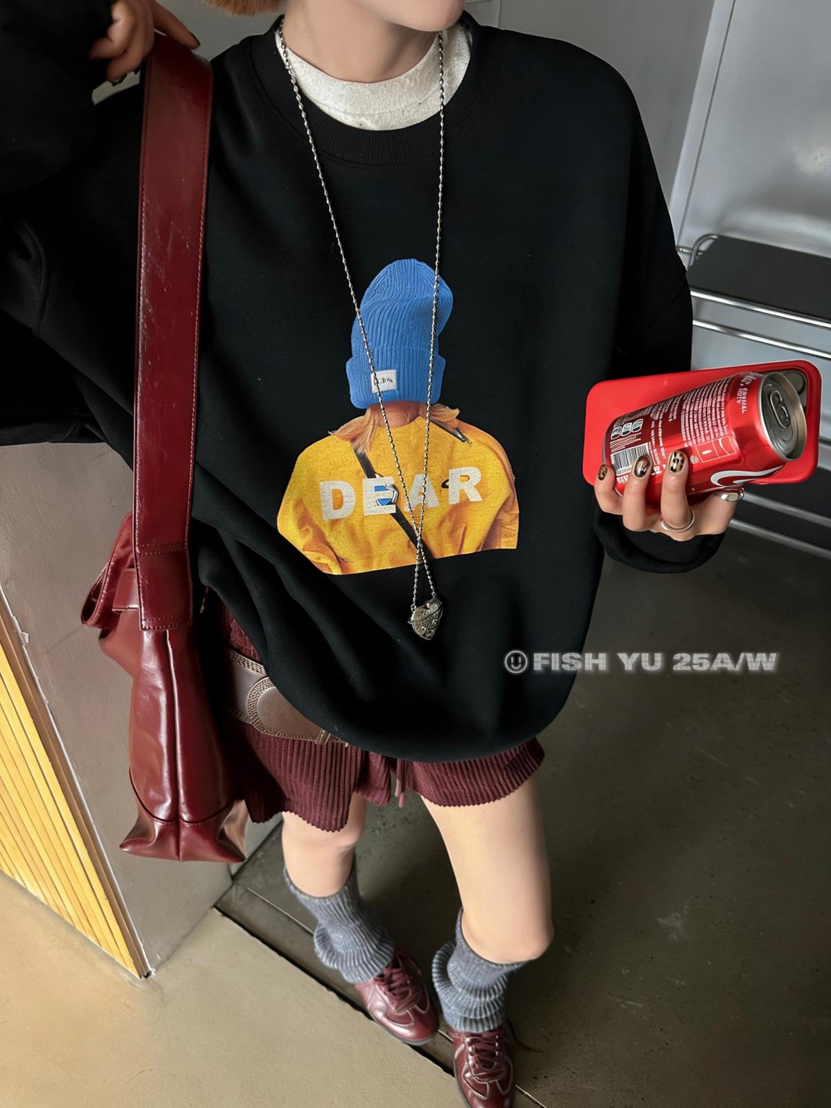 【C8256】美式復古歐美人像DEAR字母直噴印花內裏複合搖粒絨寬鬆圓領衛衣