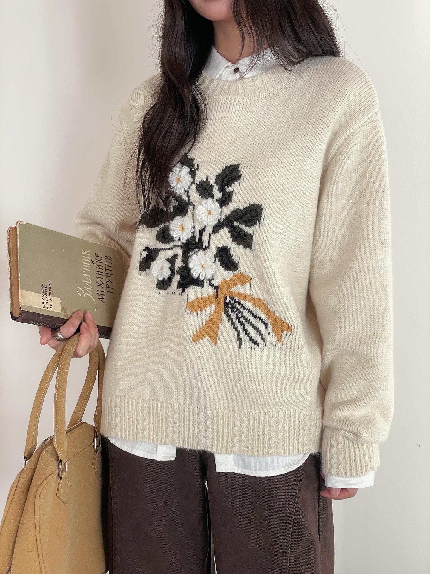 【C8261】設計感立體花卉提花針織衫圓領套頭保暖毛衣