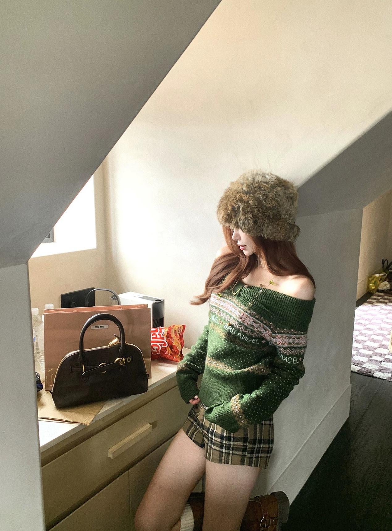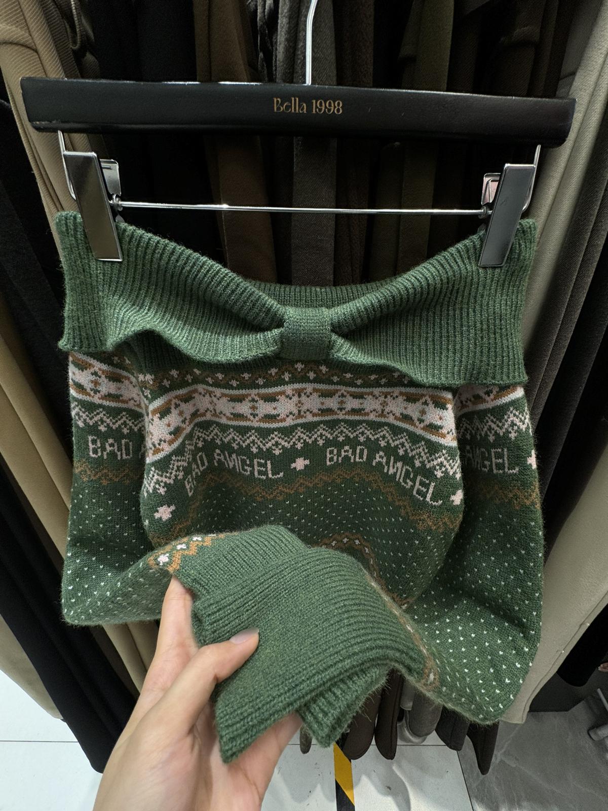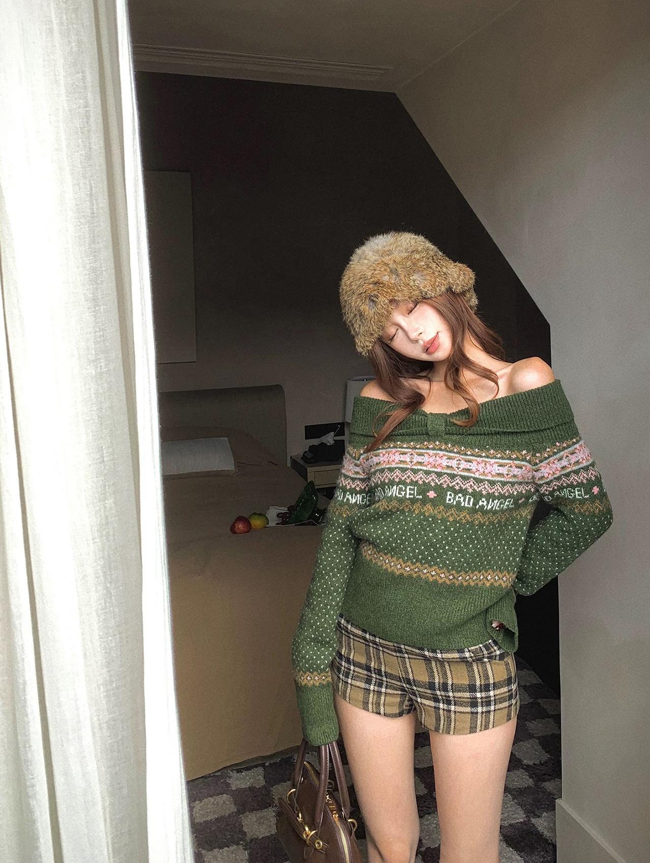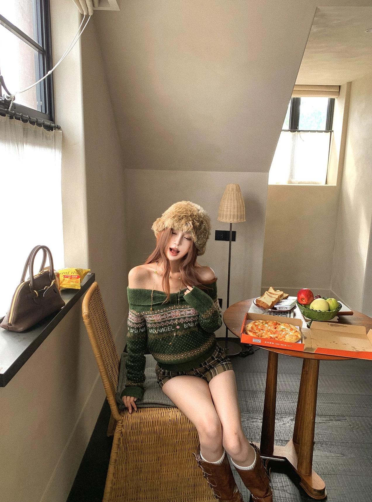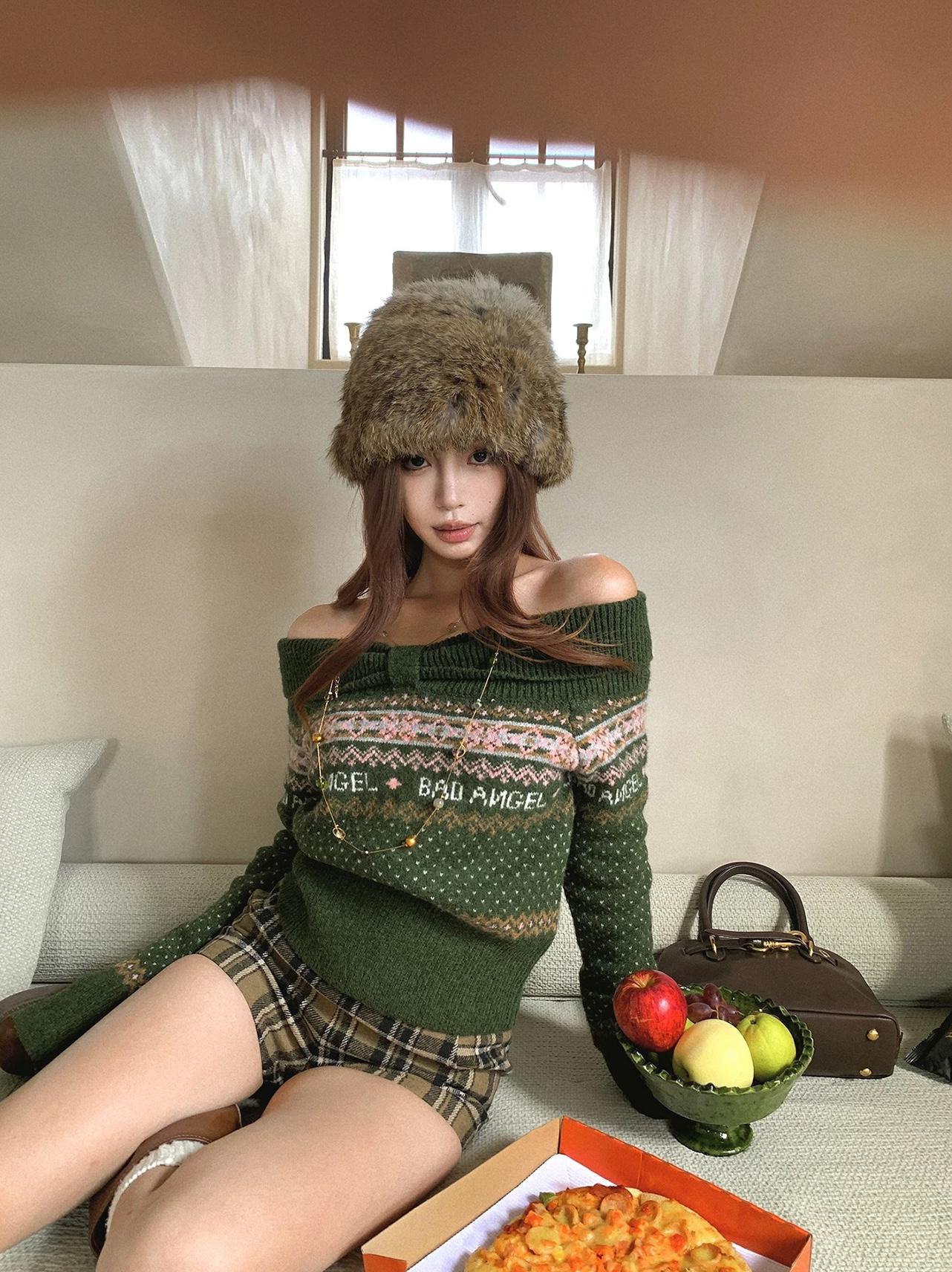 【C8270】慵懶聖誕氛圍感一字肩扭結毛衣冬季新款露肩打底針織衫