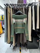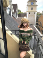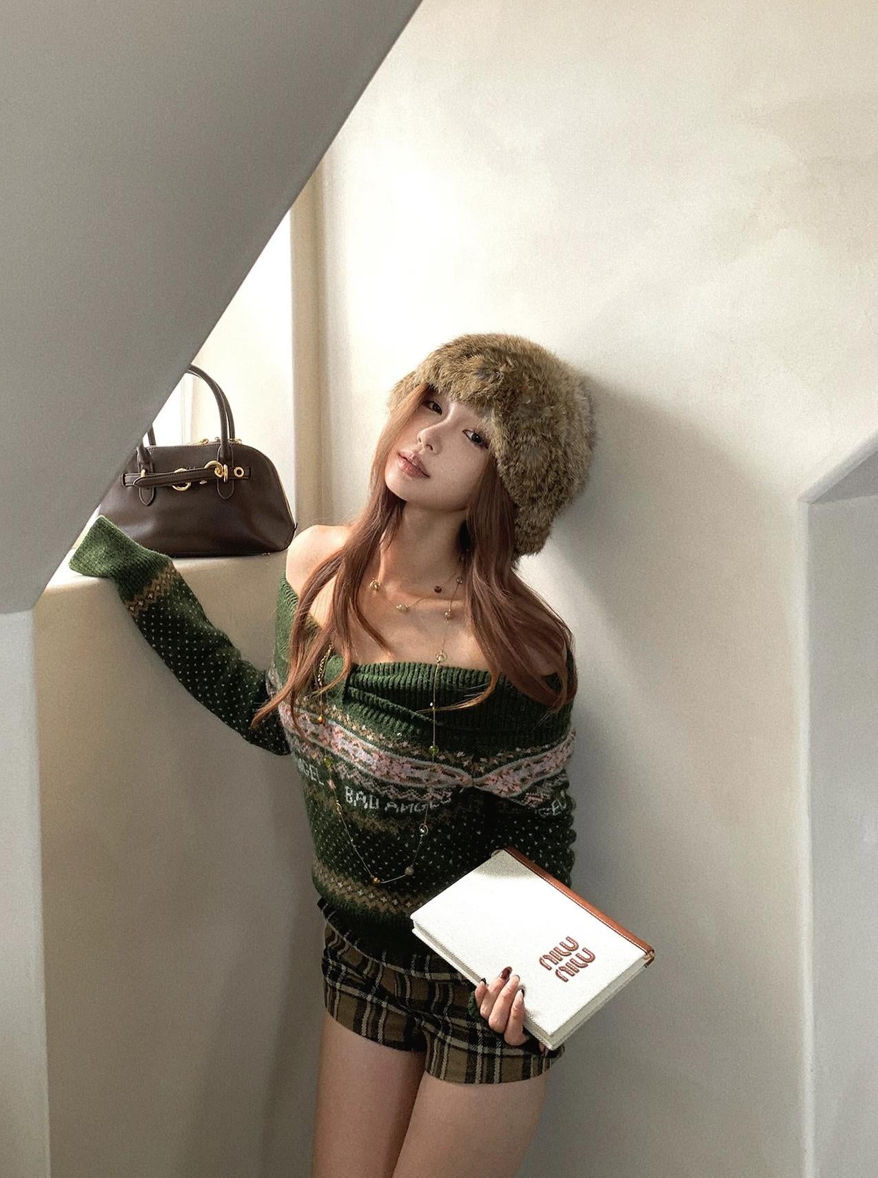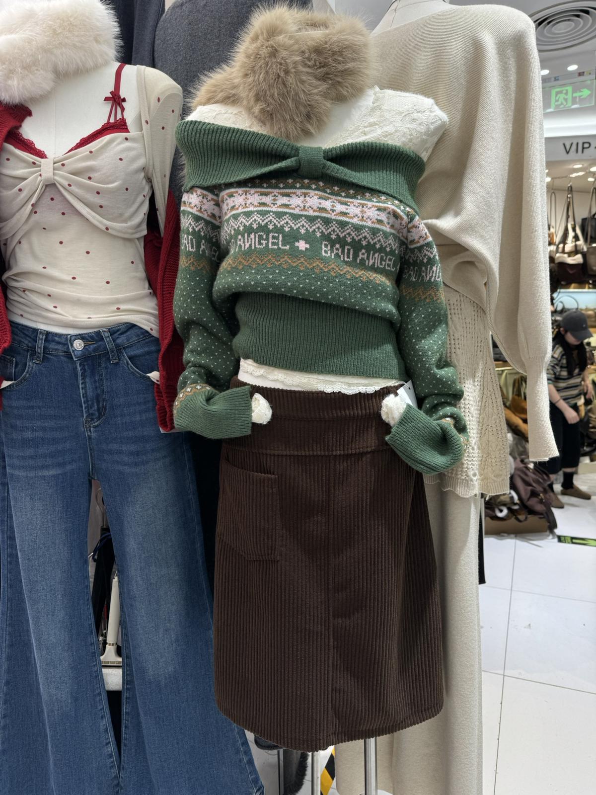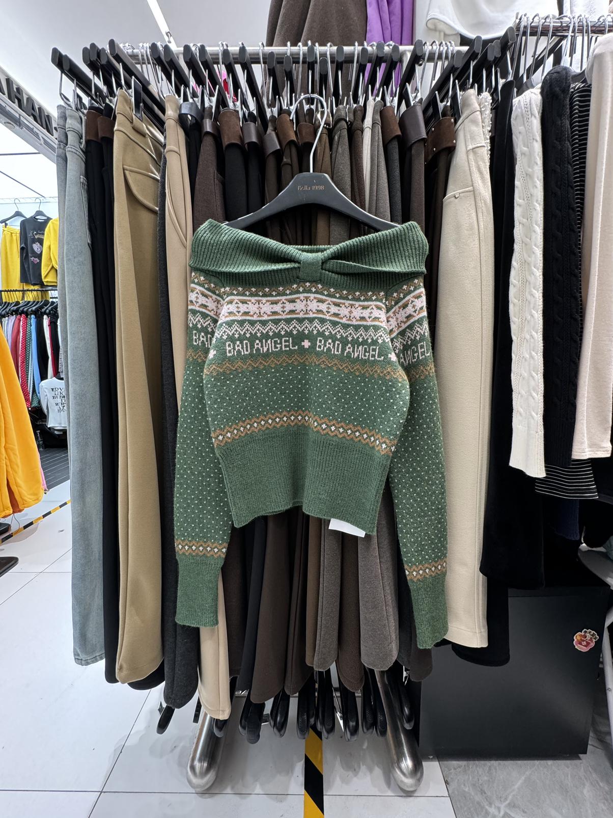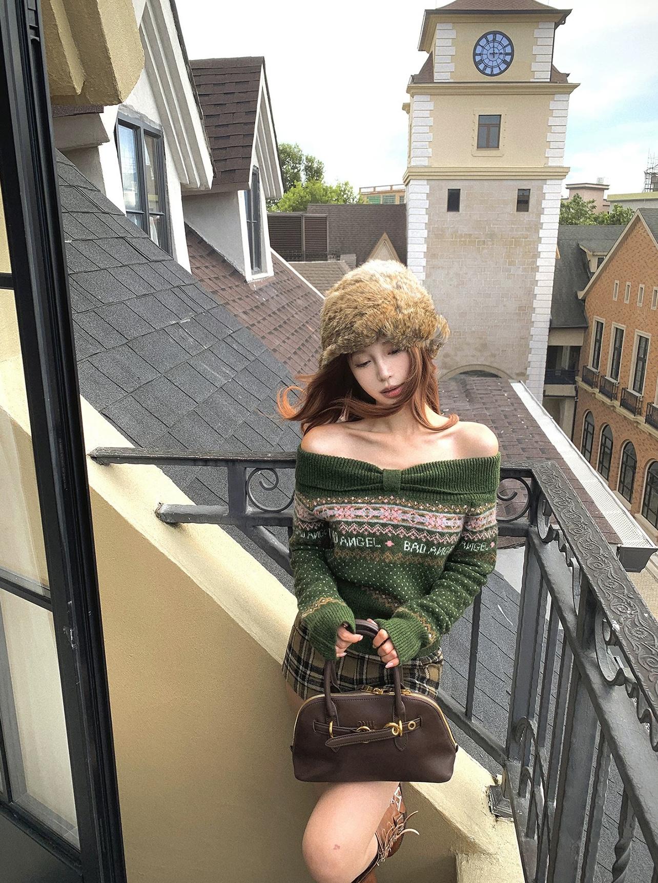 【C8270】慵懶聖誕氛圍感一字肩扭結毛衣冬季新款露肩打底針織衫