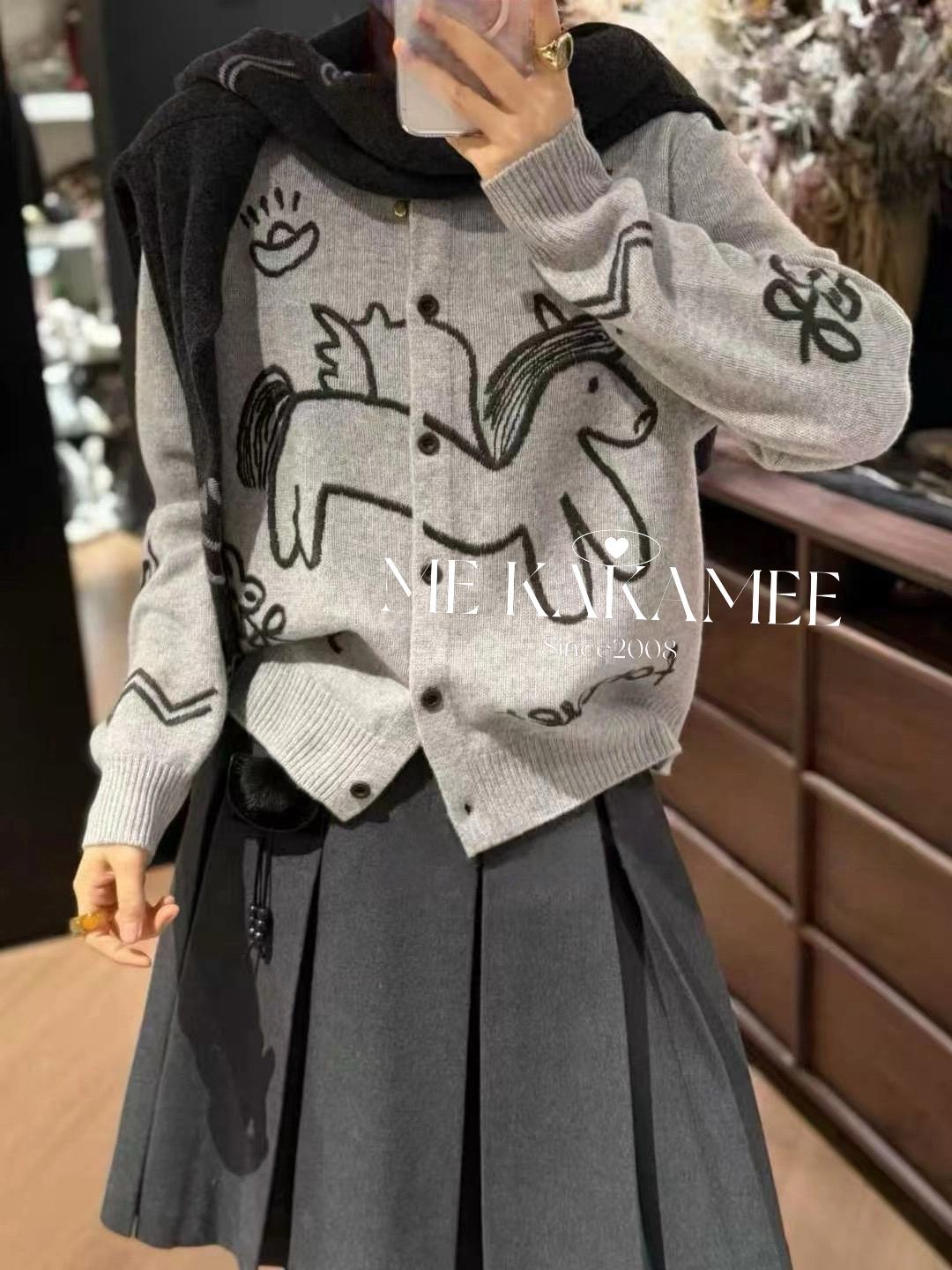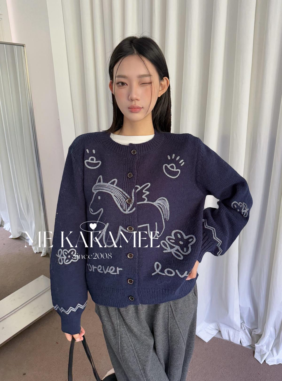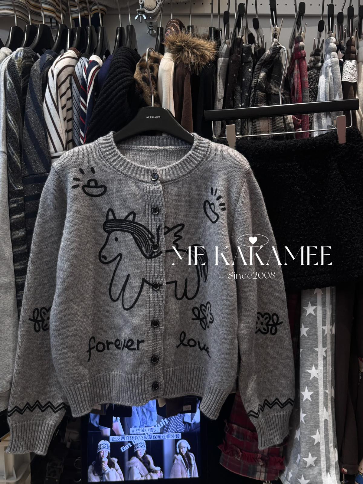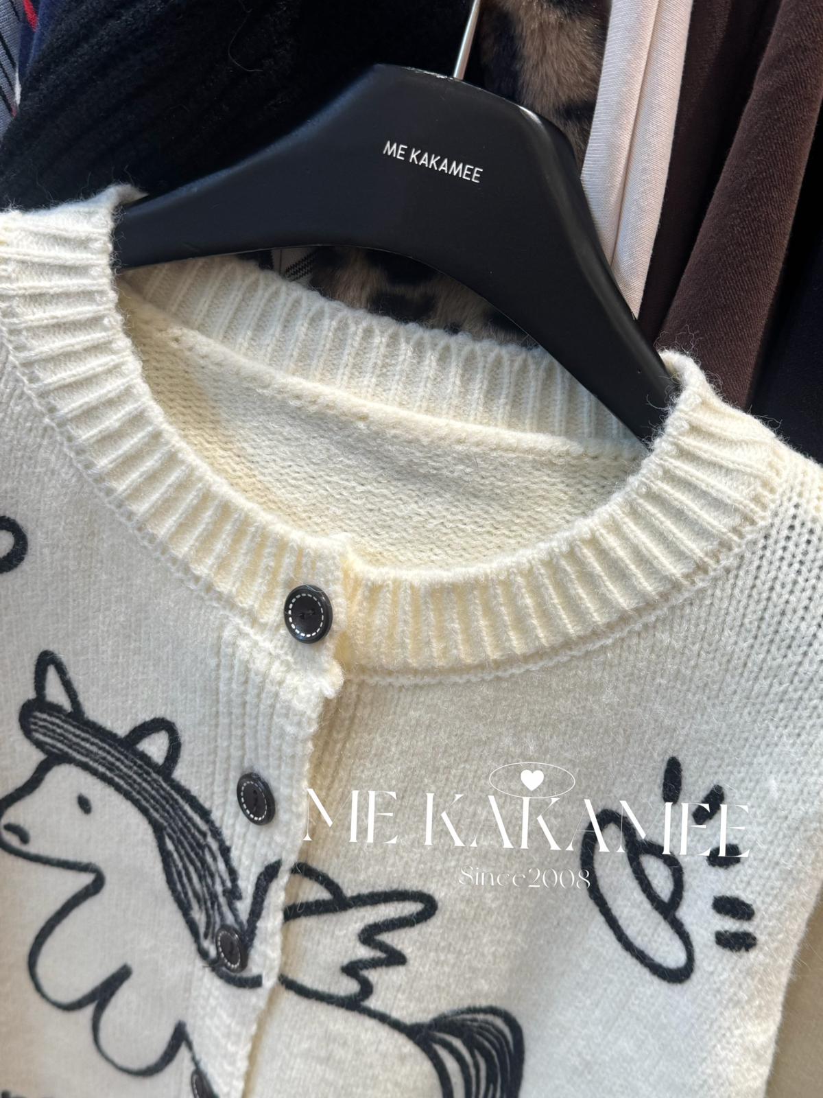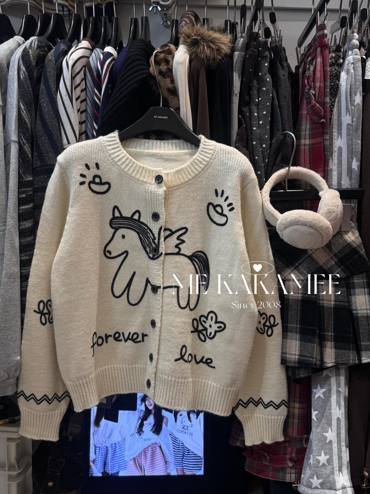 3. 【C8297】冬新品塗鴉小馬圖案軟糯圓領開衫保暖毛衣