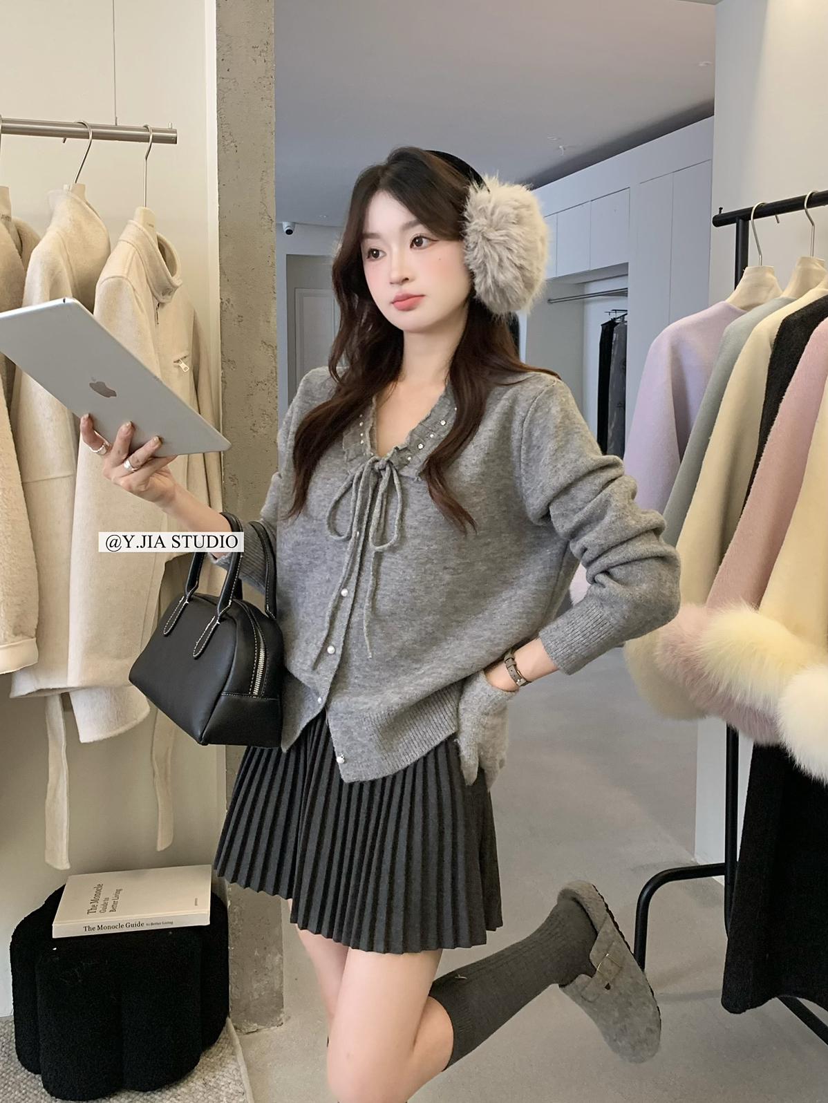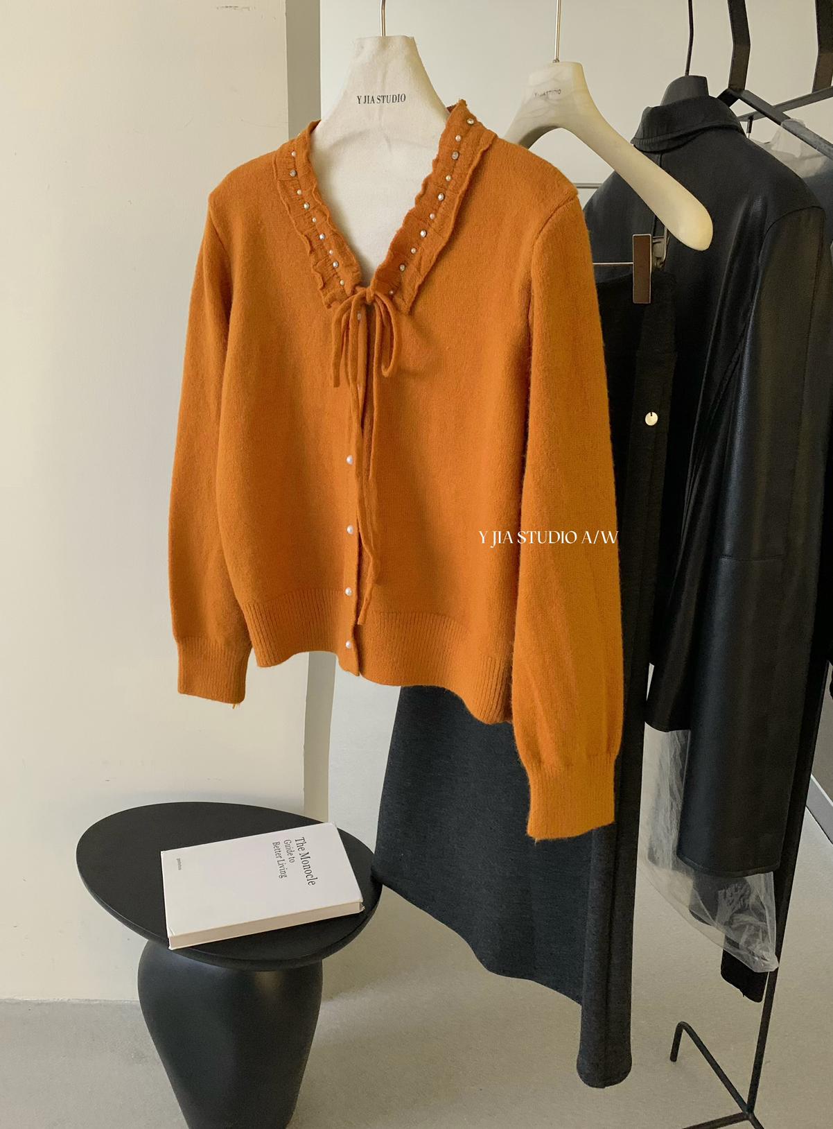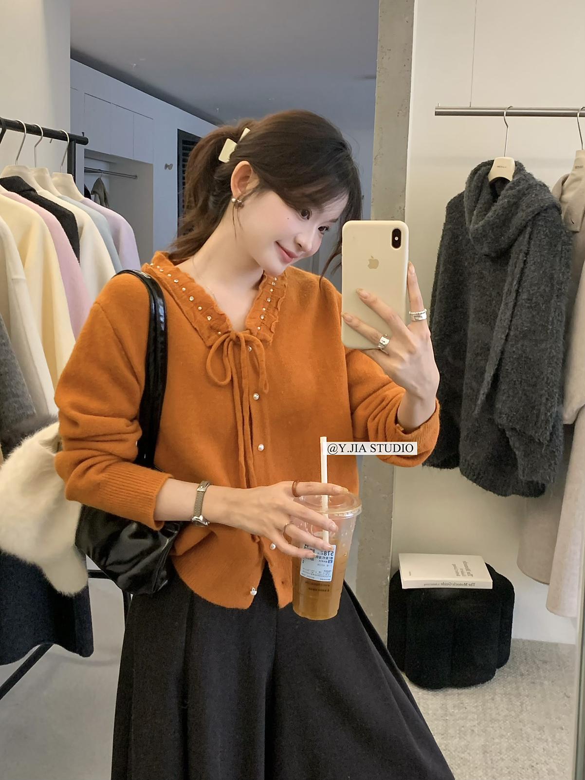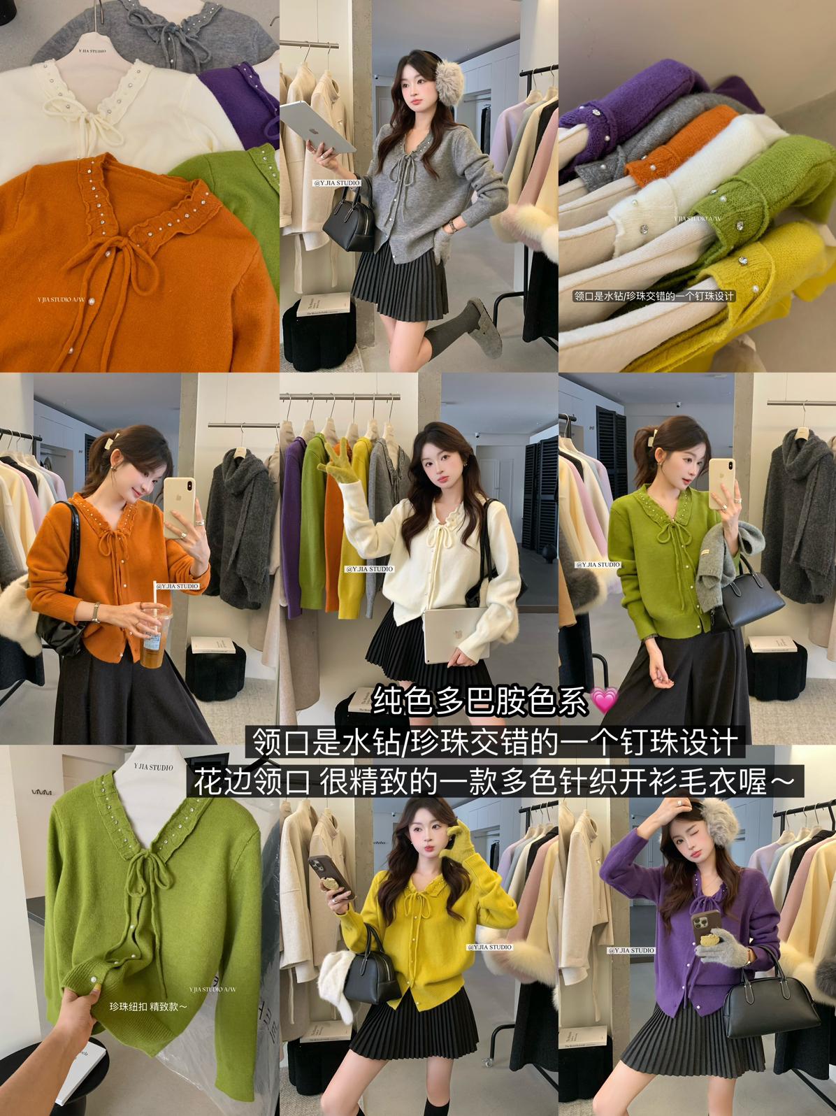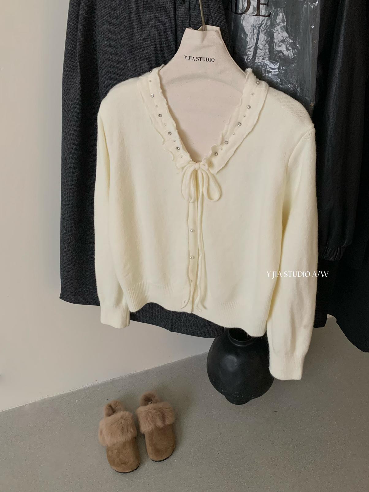 【C7785】精緻氣質V領花邊釘珠針織開衫保暖毛衣