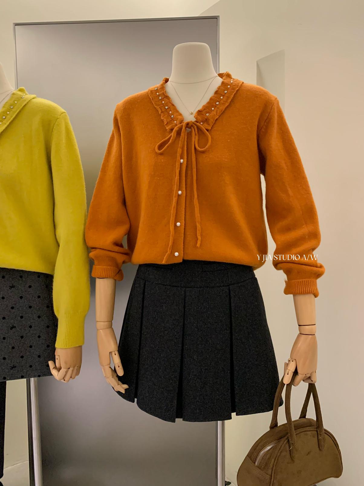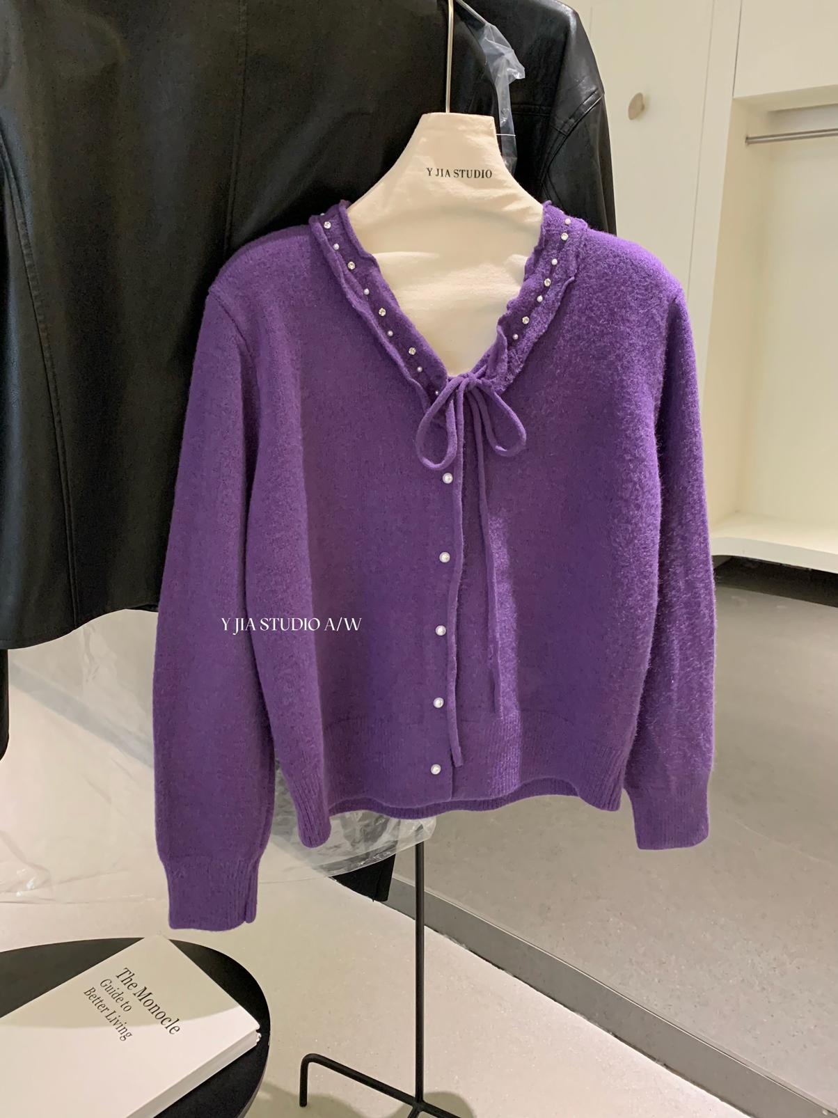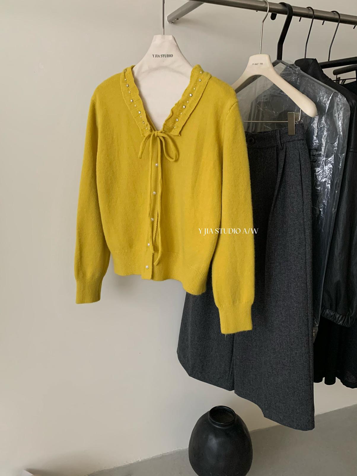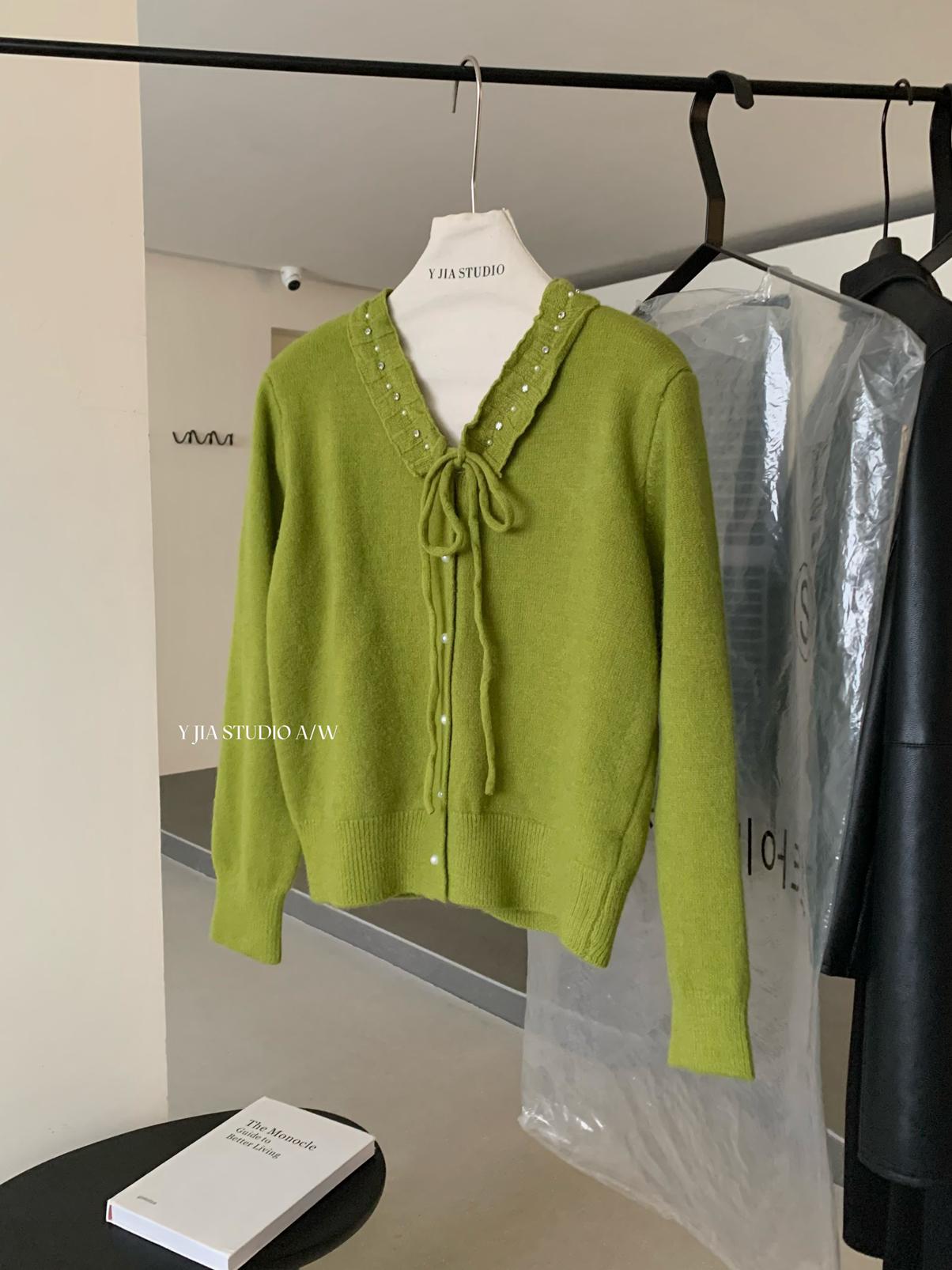 【C7785】精緻氣質V領花邊釘珠針織開衫保暖毛衣