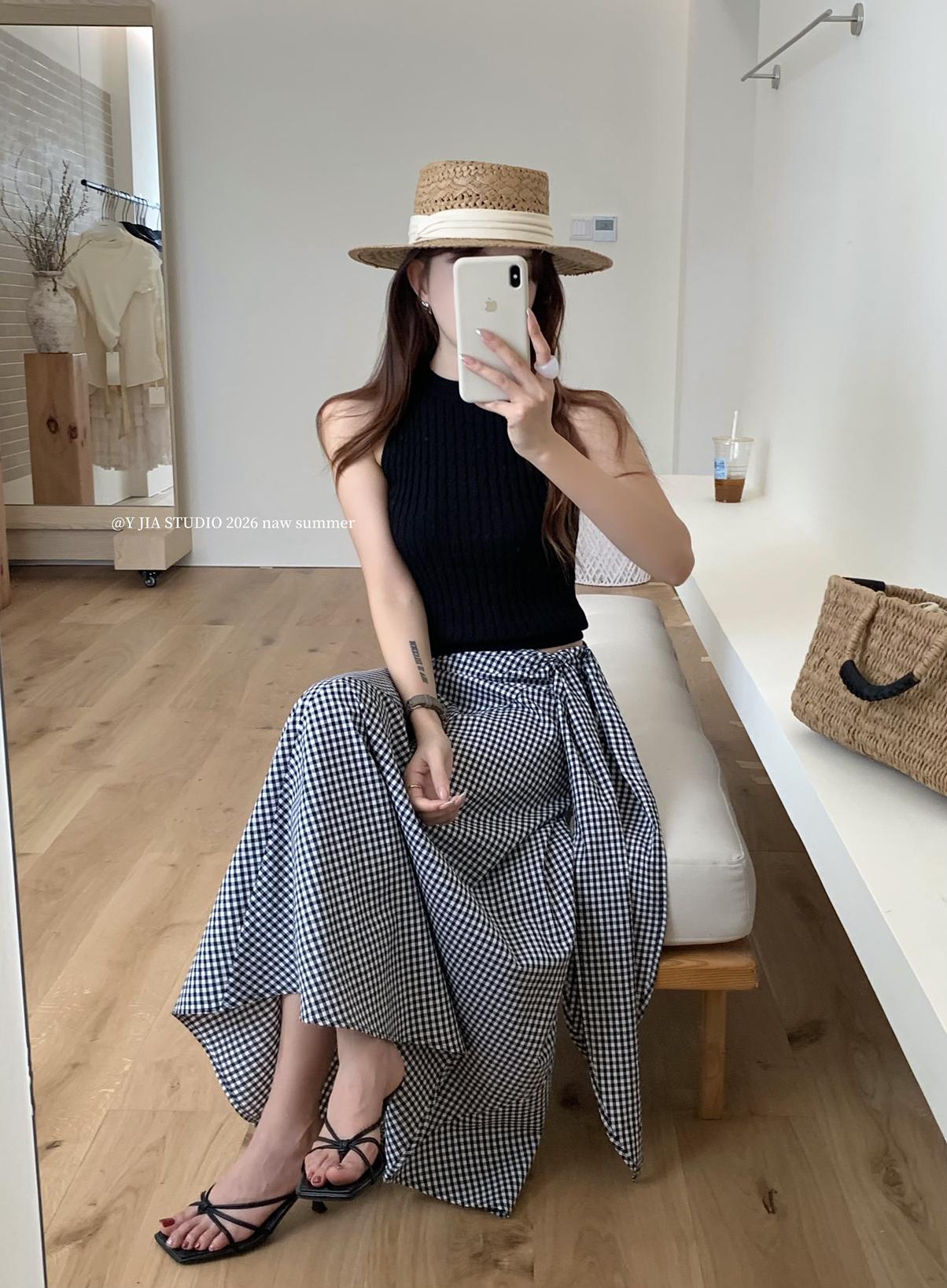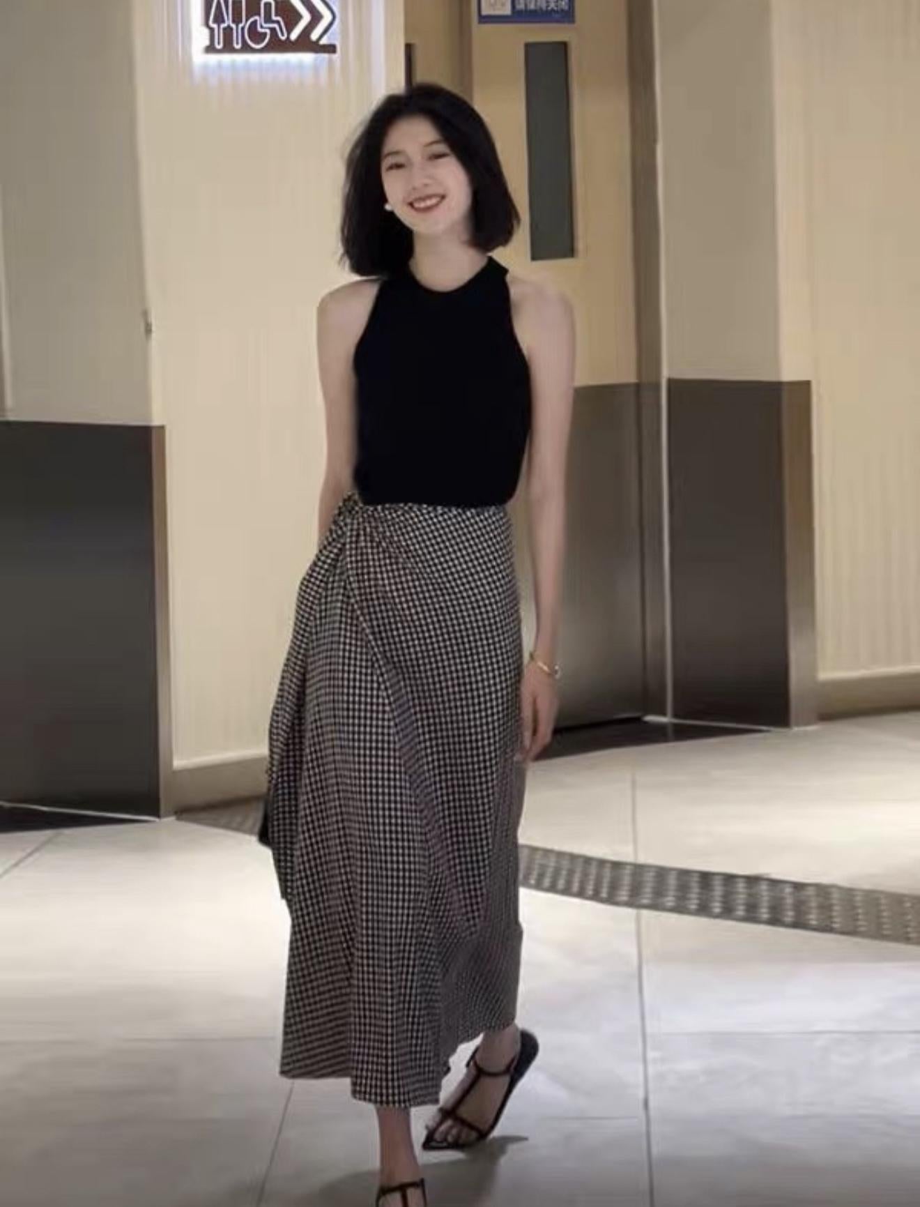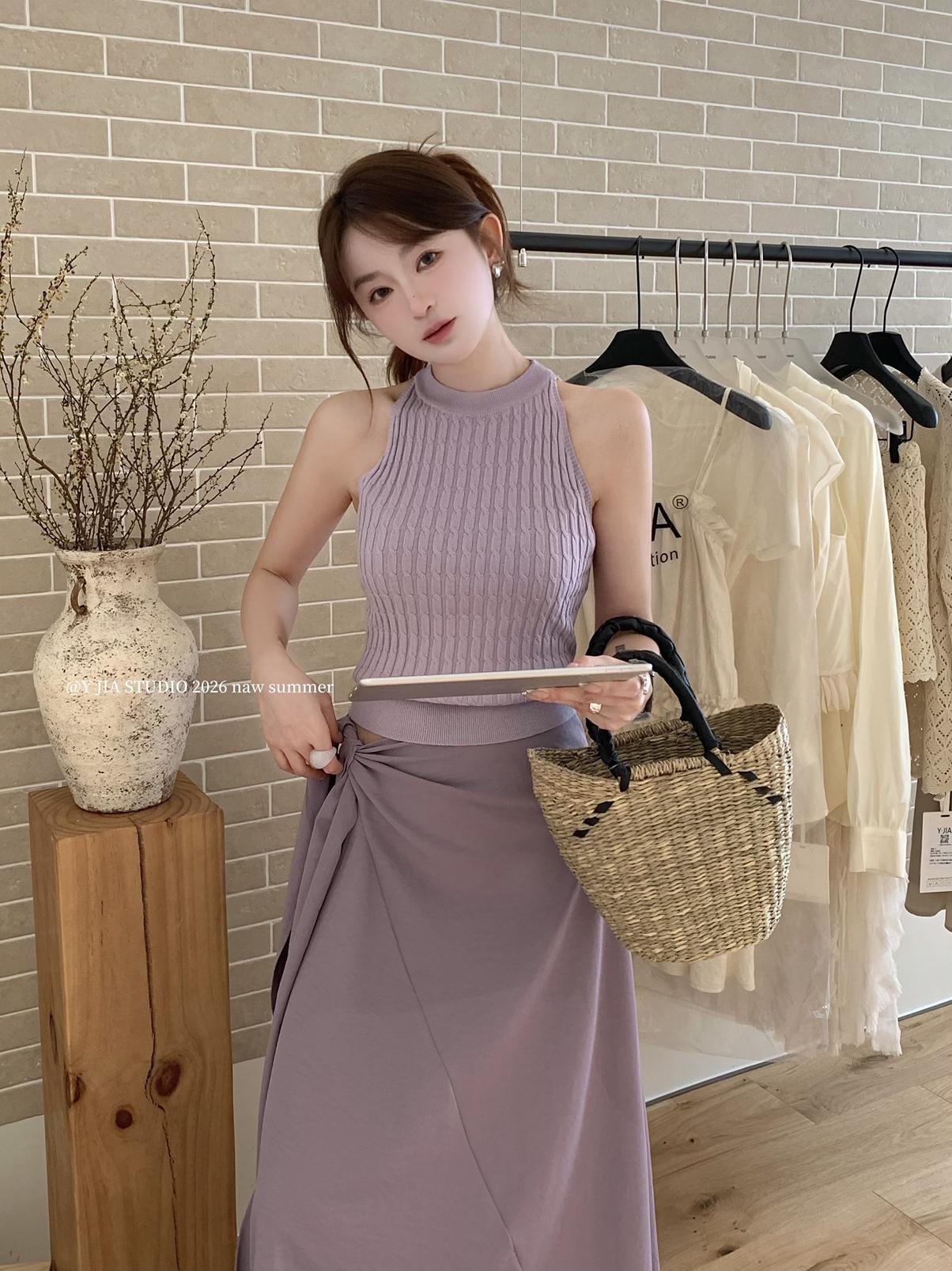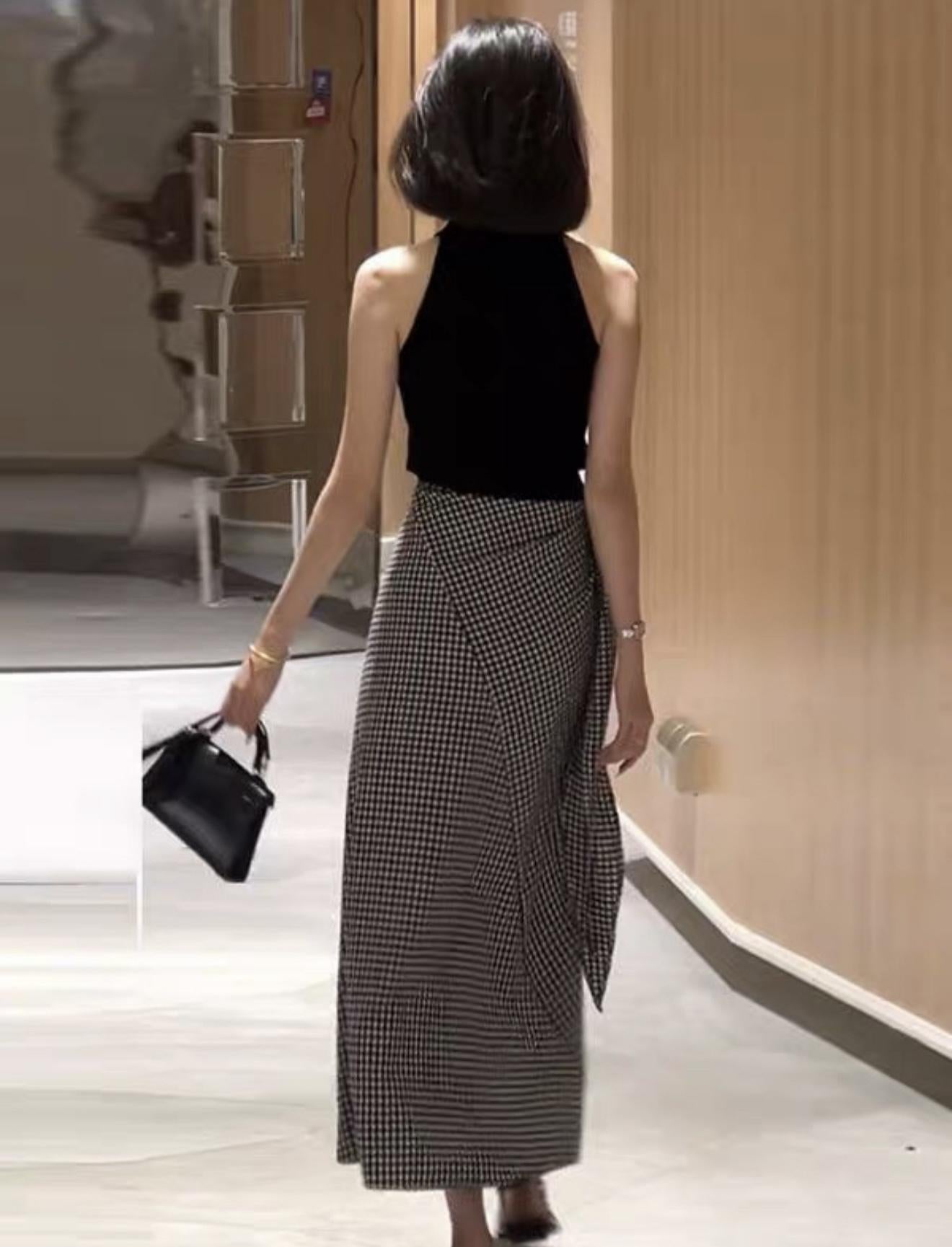 【C8967】小衆不規則復古綁帶氣質休閒半身裙+麻花無袖針織背心套裝(兩件套)