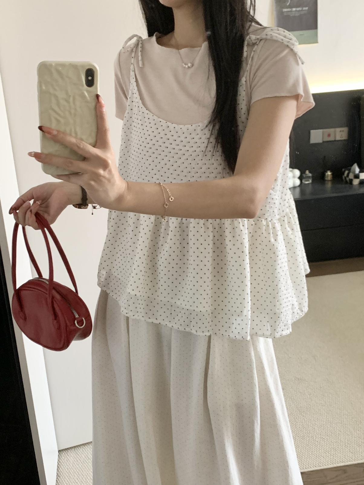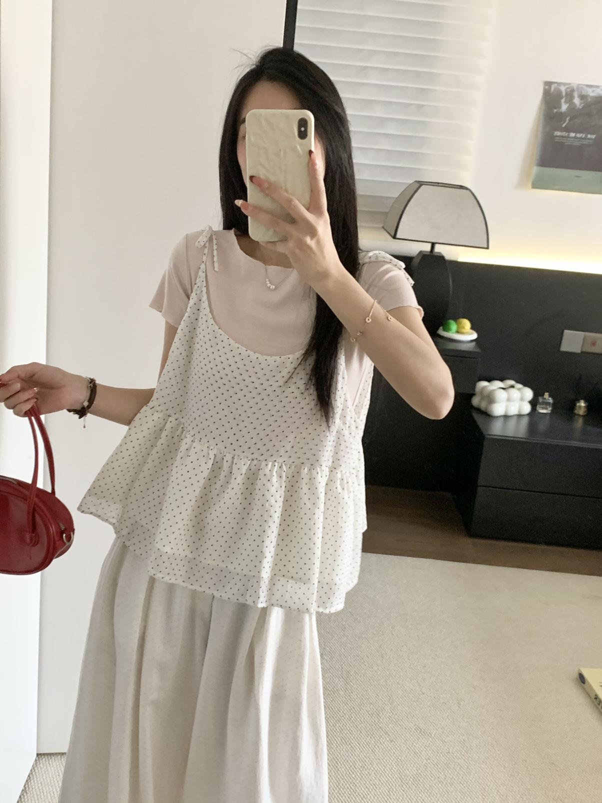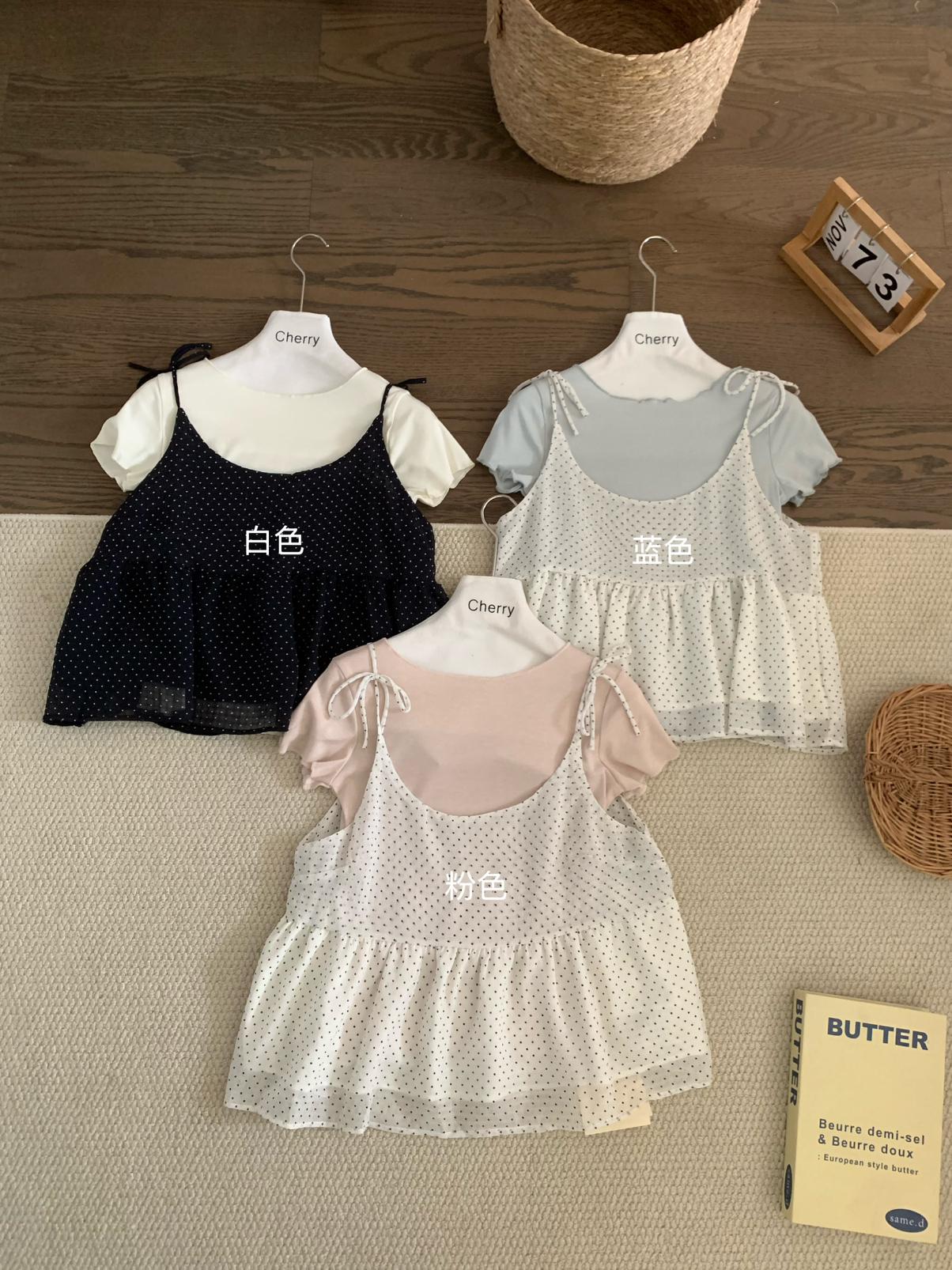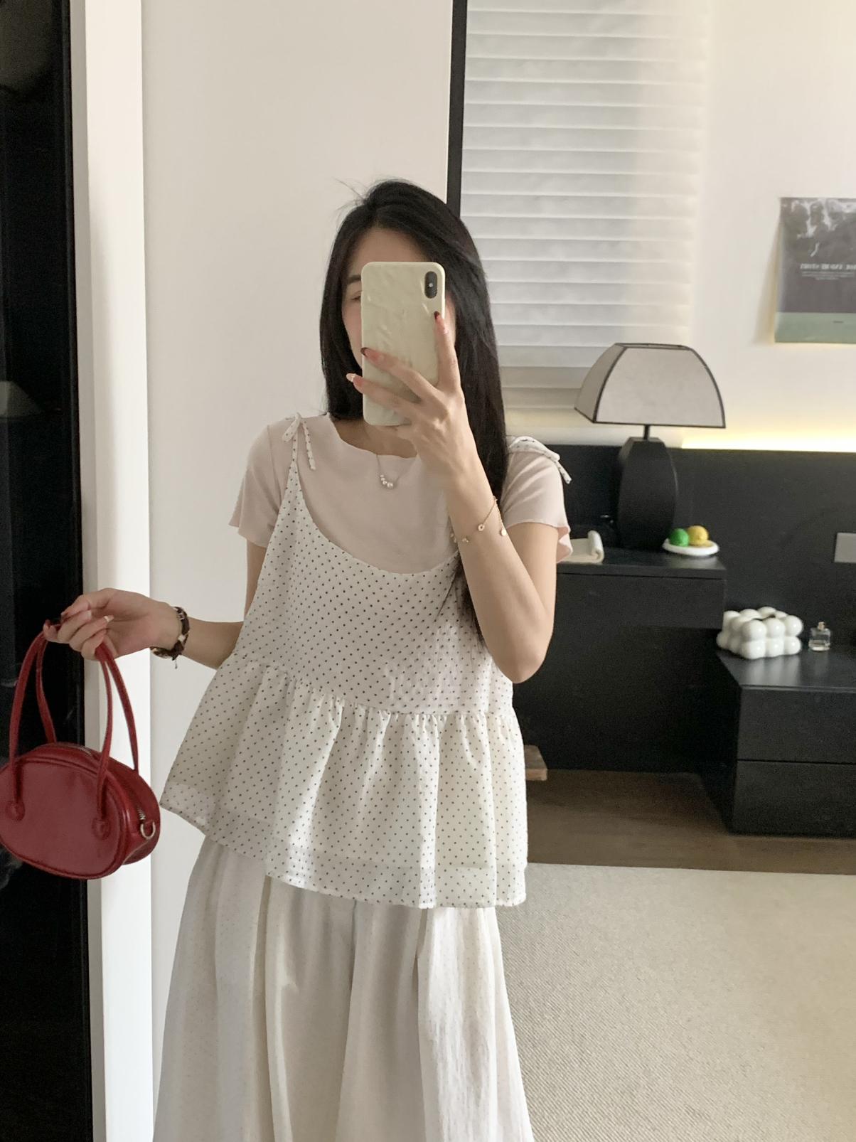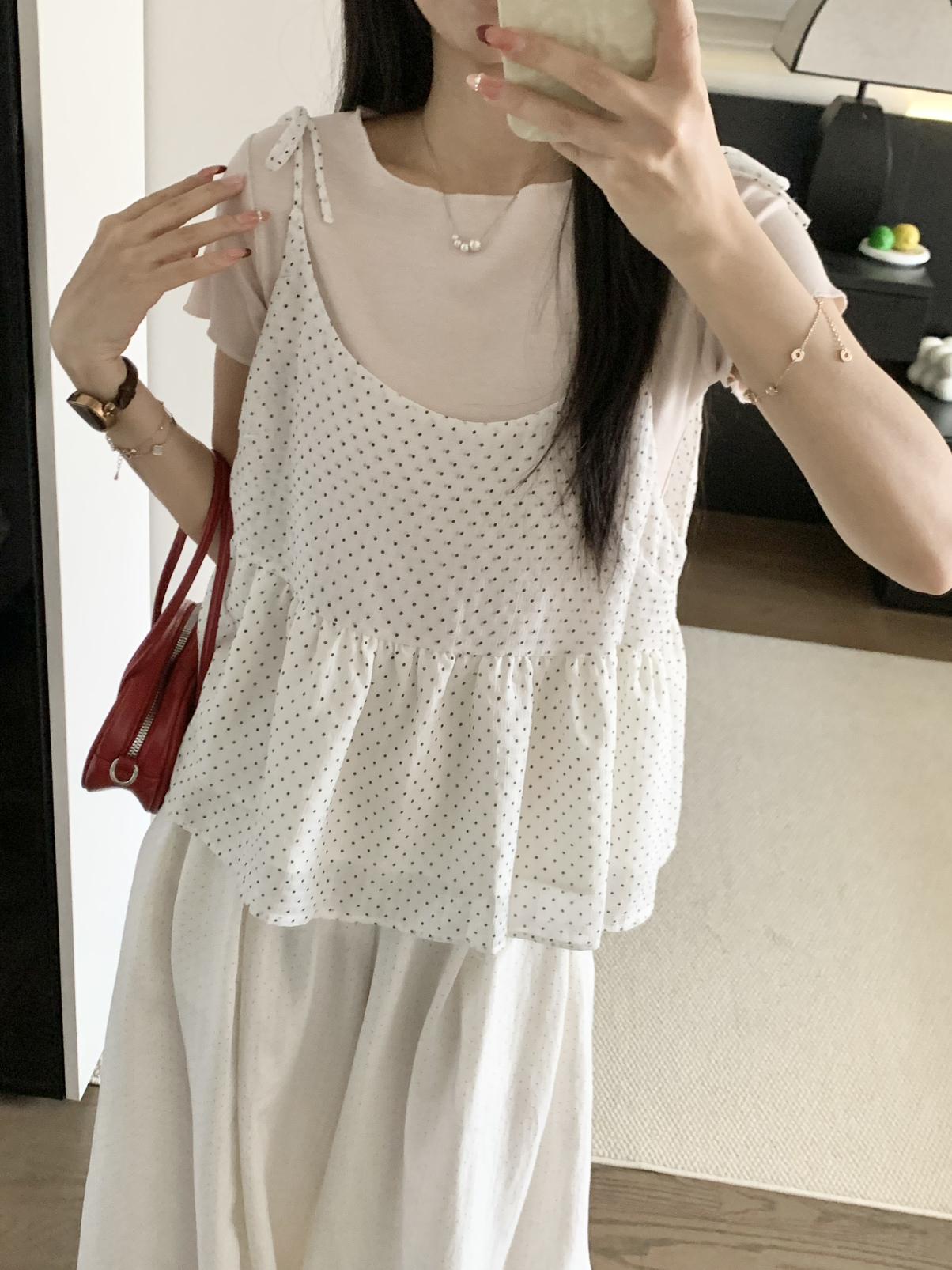 【C9020】韓系甜美短袖T恤+波點吊帶背心兩件套套裝