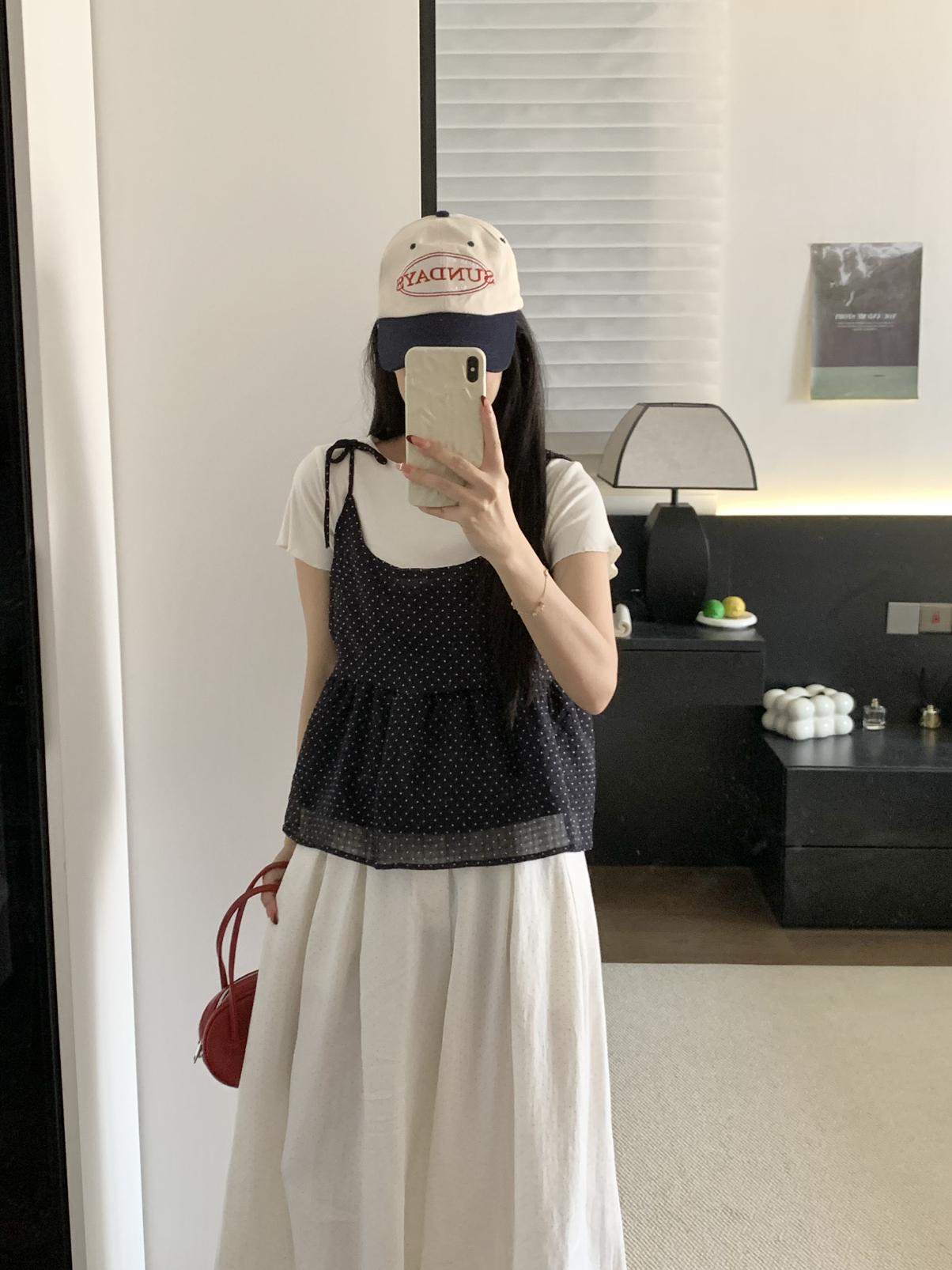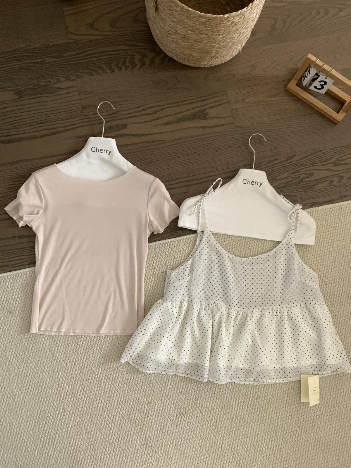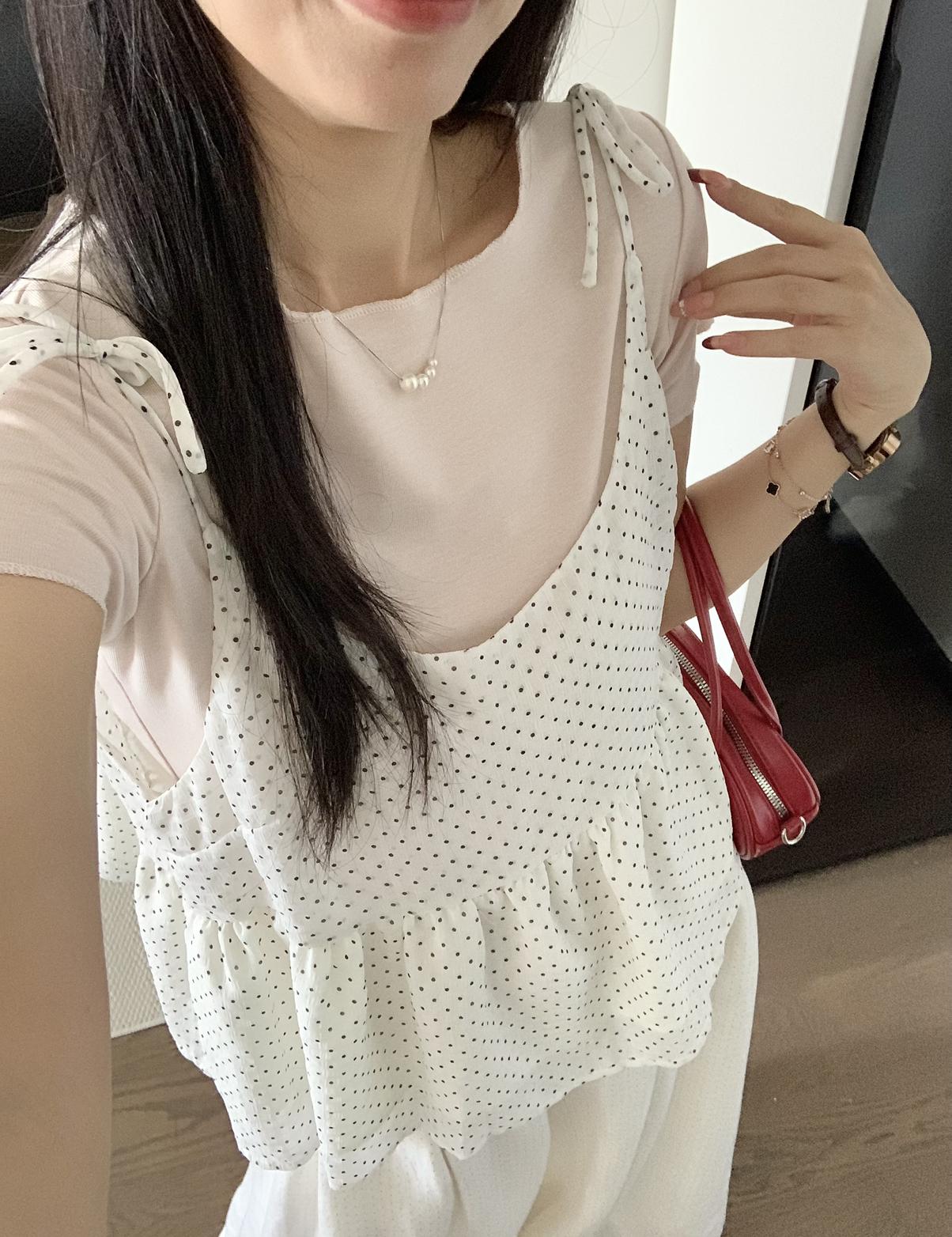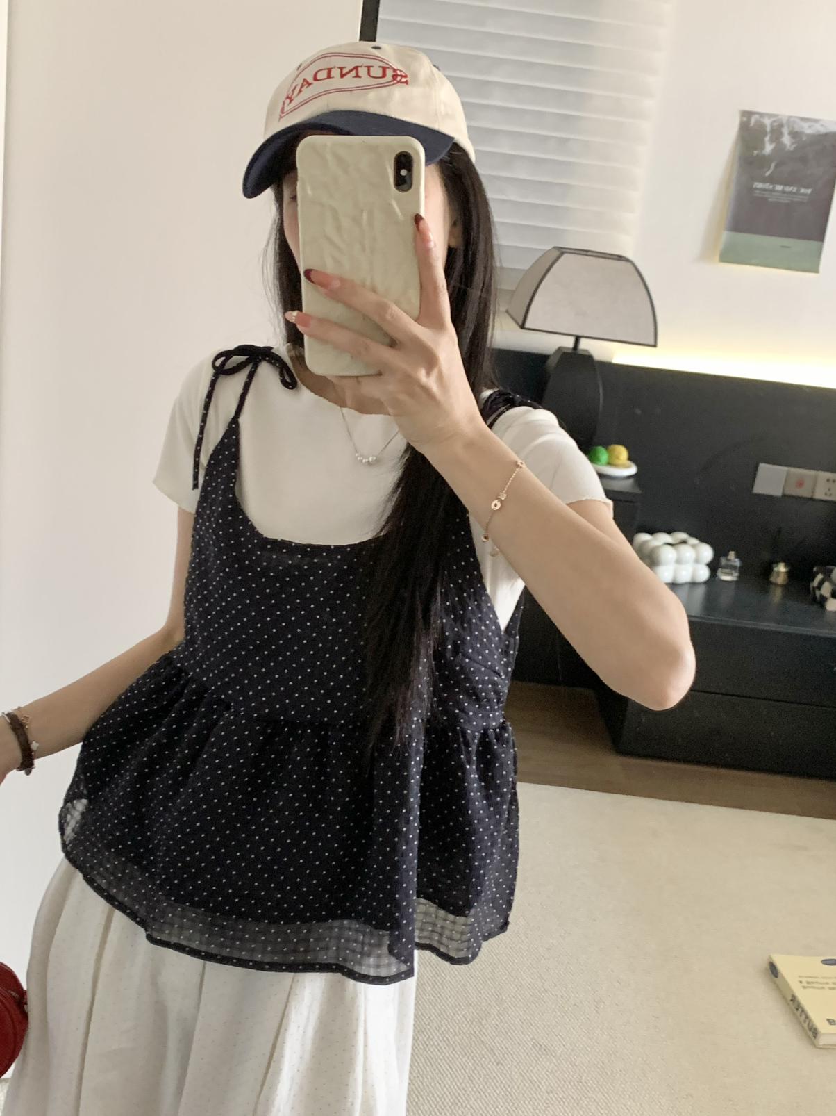 【C9020】韓系甜美短袖T恤+波點吊帶背心兩件套套裝