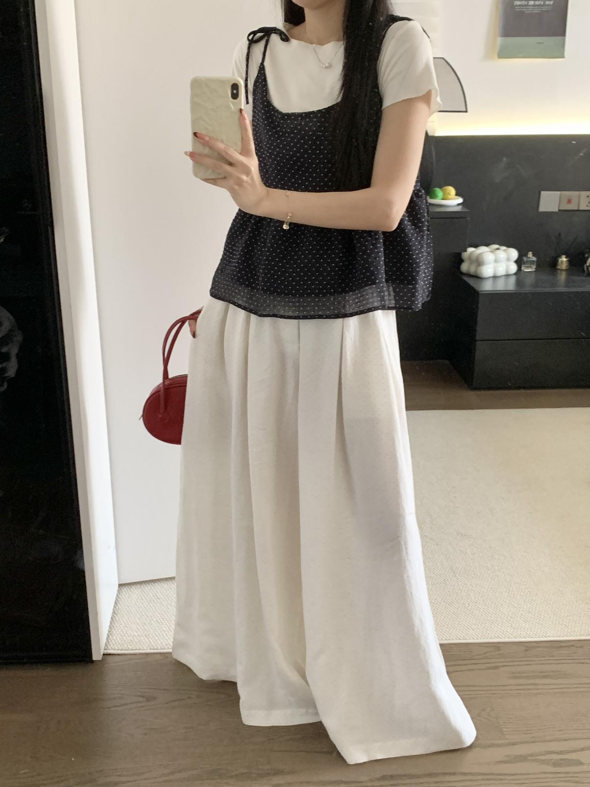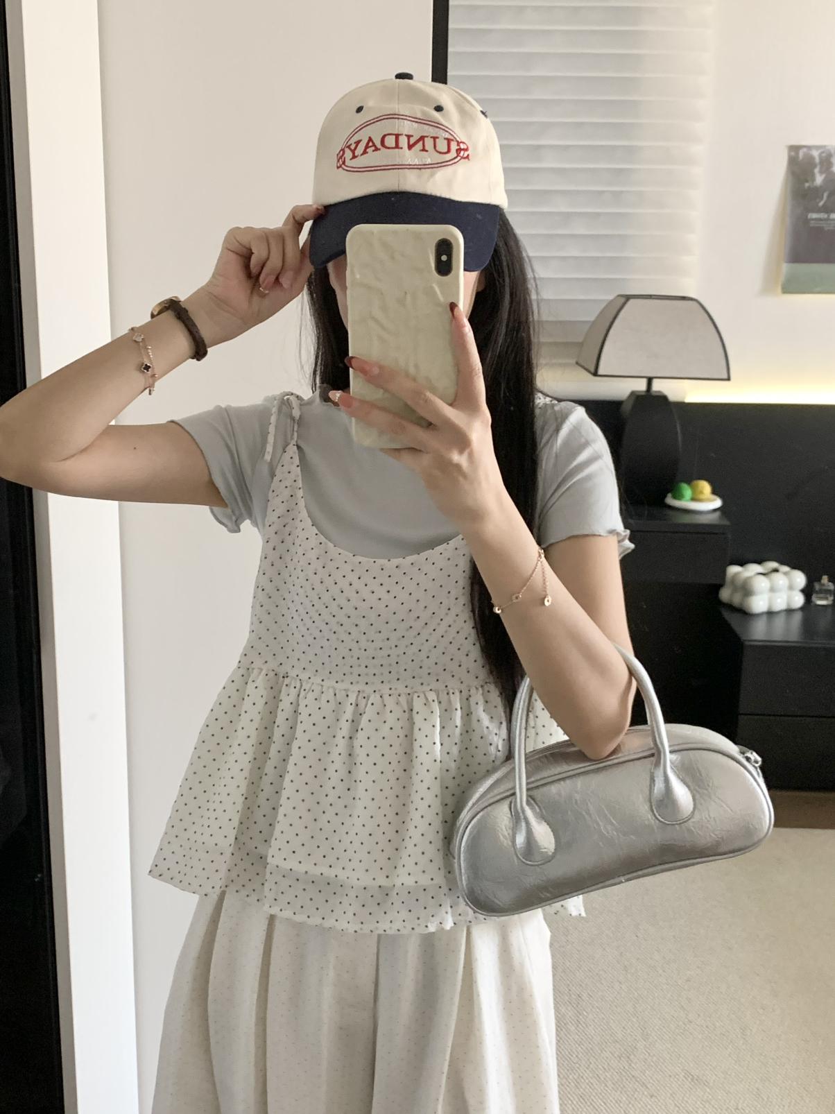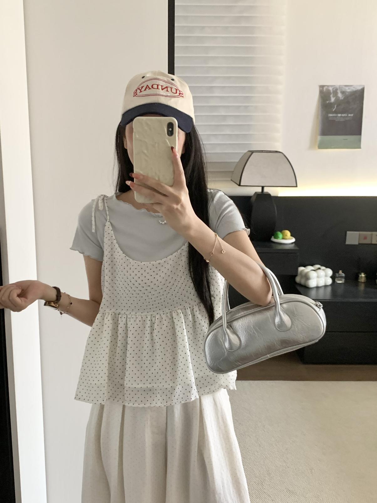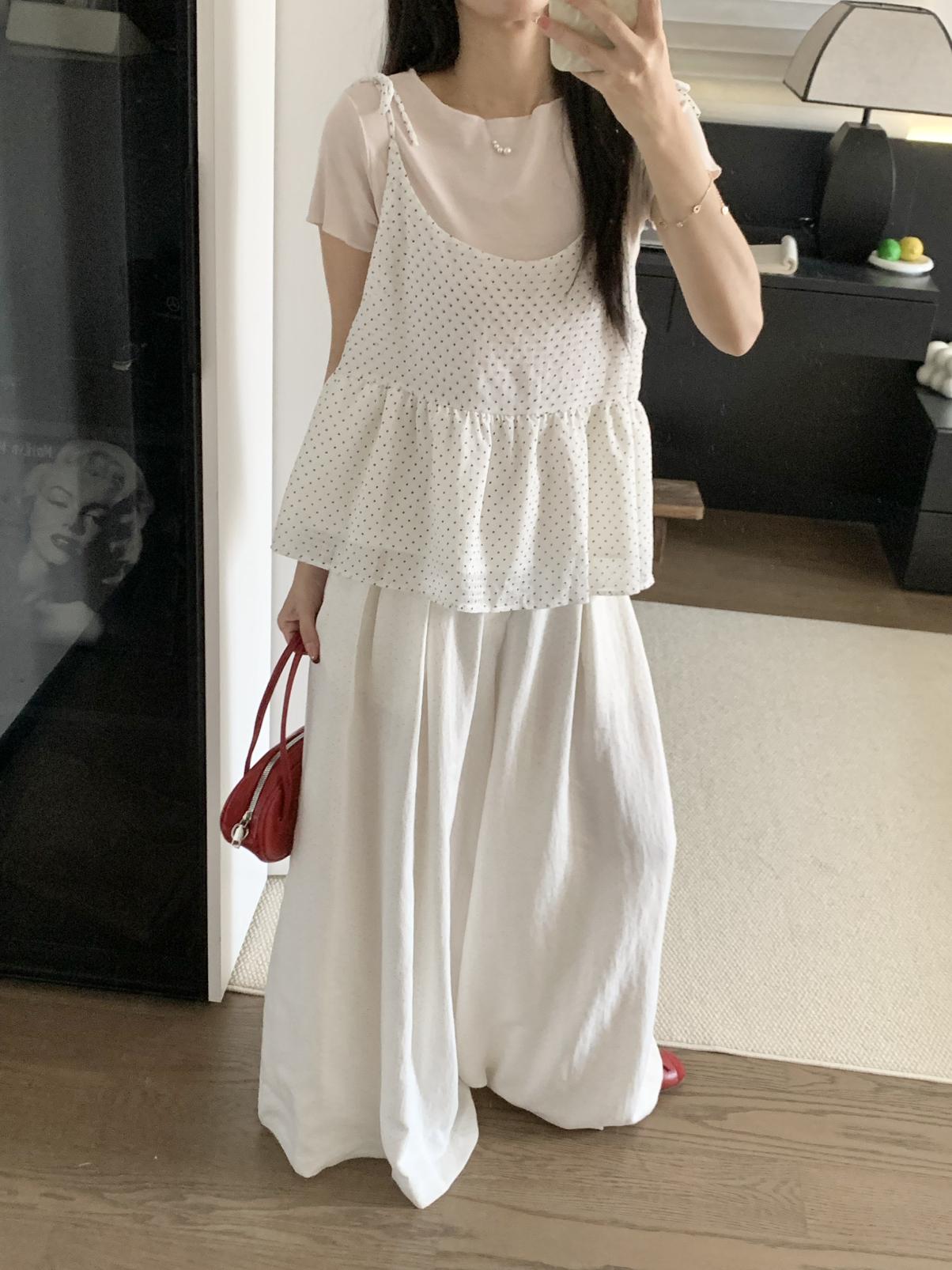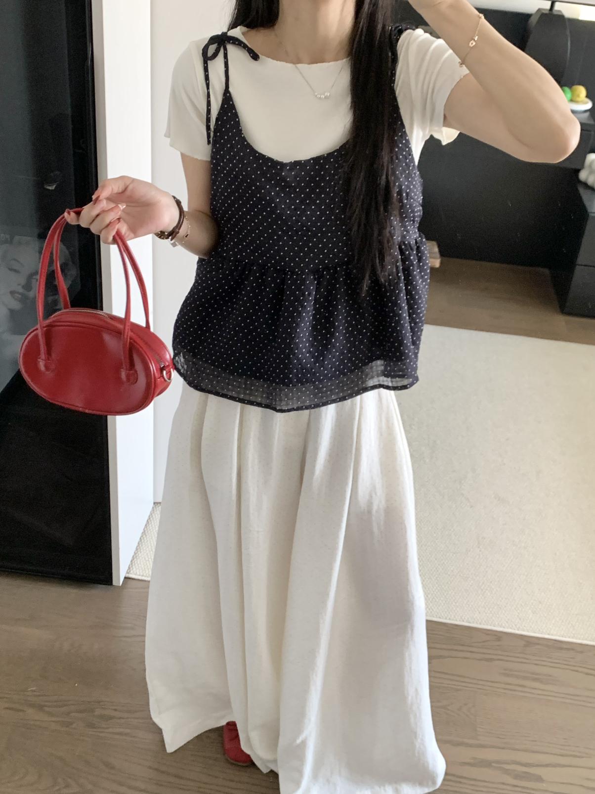【C9020】韓系甜美短袖T恤+波點吊帶背心兩件套套裝
